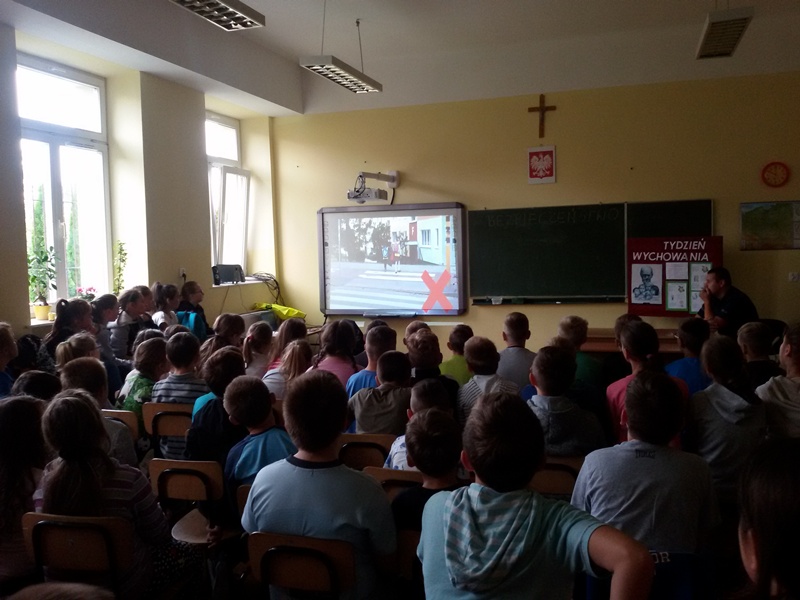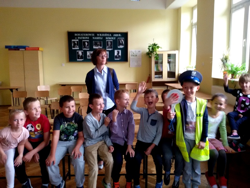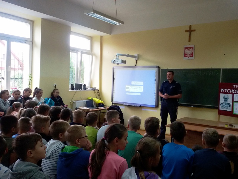 Czwartek był dniem bezpieczeństwa. Dla uczniów klas I-III p. pedagog K. Gałęza zorganizowała spotkanie z policjantem. Zajęcia dotyczyły bezpieczeństwa w ruchu drogowym, noszenia odblasków oraz przypomnienia numerów telefonów alarmowych oraz bezpiecznych zabaw w szkole.