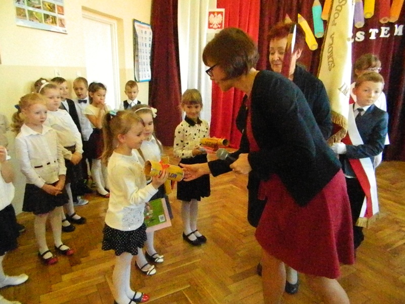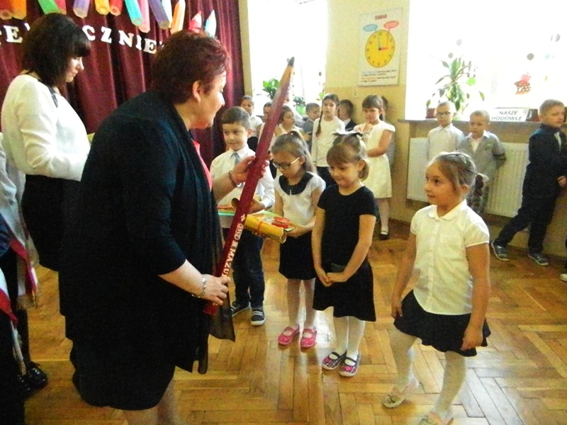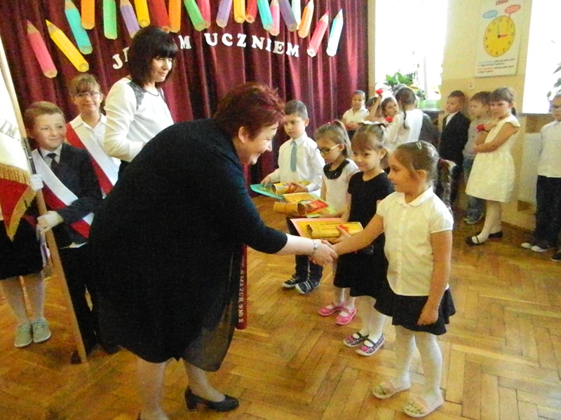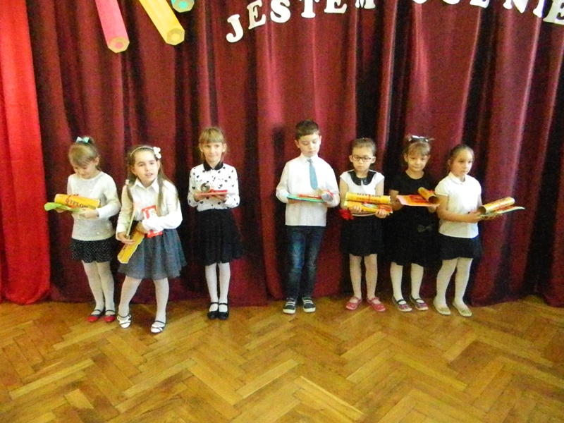 Nowi uczniowie na pamiątkę podniosłej uroczystości otrzymali dyplomy i słodki upominek oraz książeczki od Rady Rodziców, a od starszych kolegów – ciepłe życzenia miłych i radosnych chwil oraz owocnego zdobywania wiedzy.