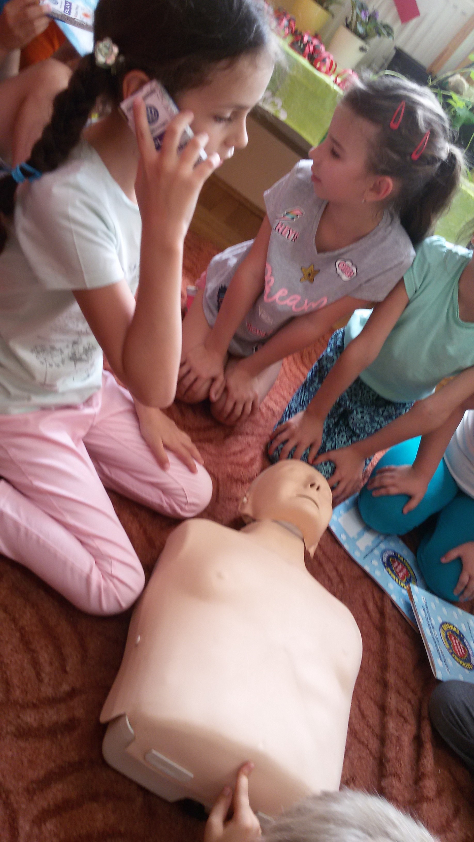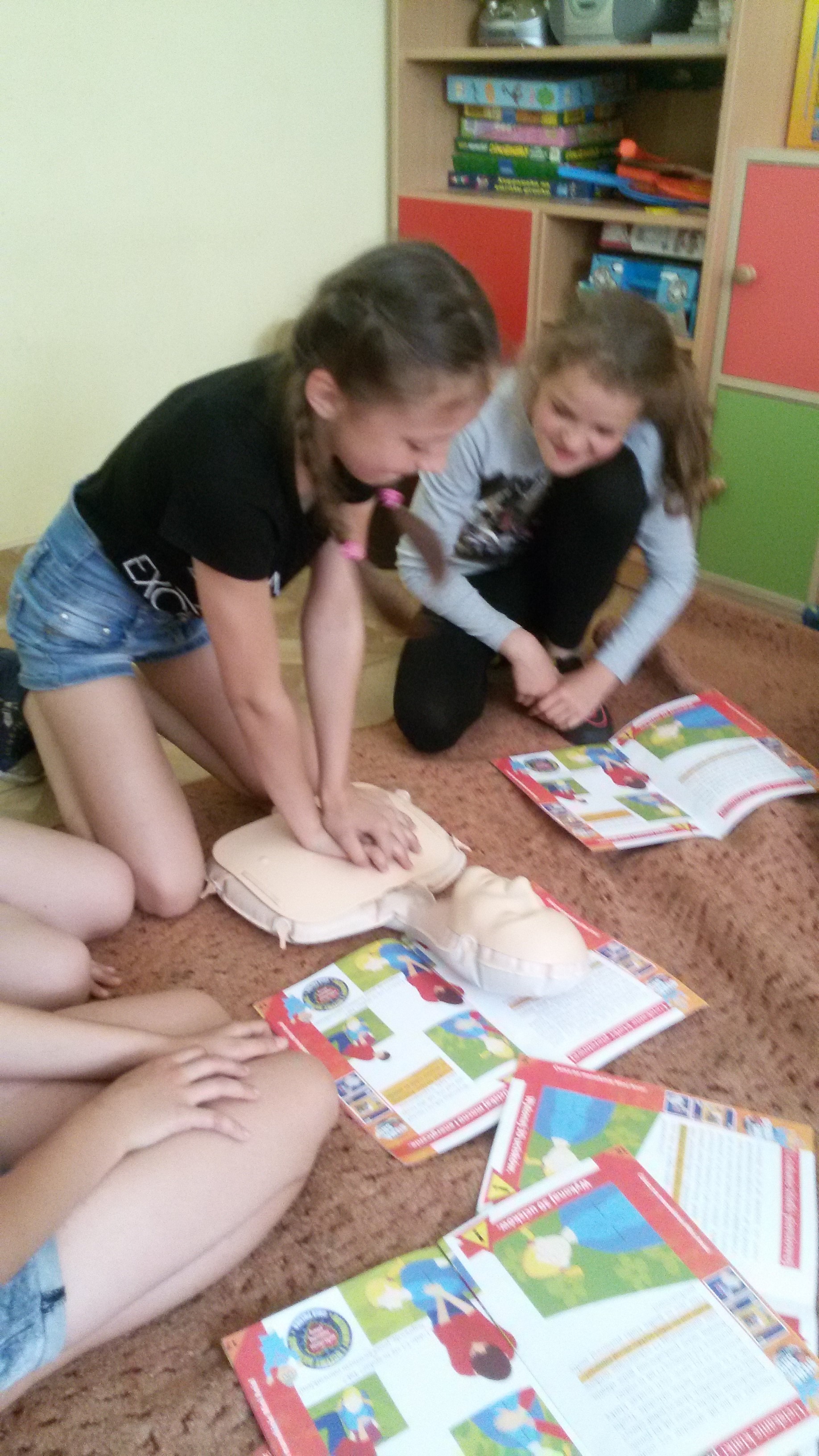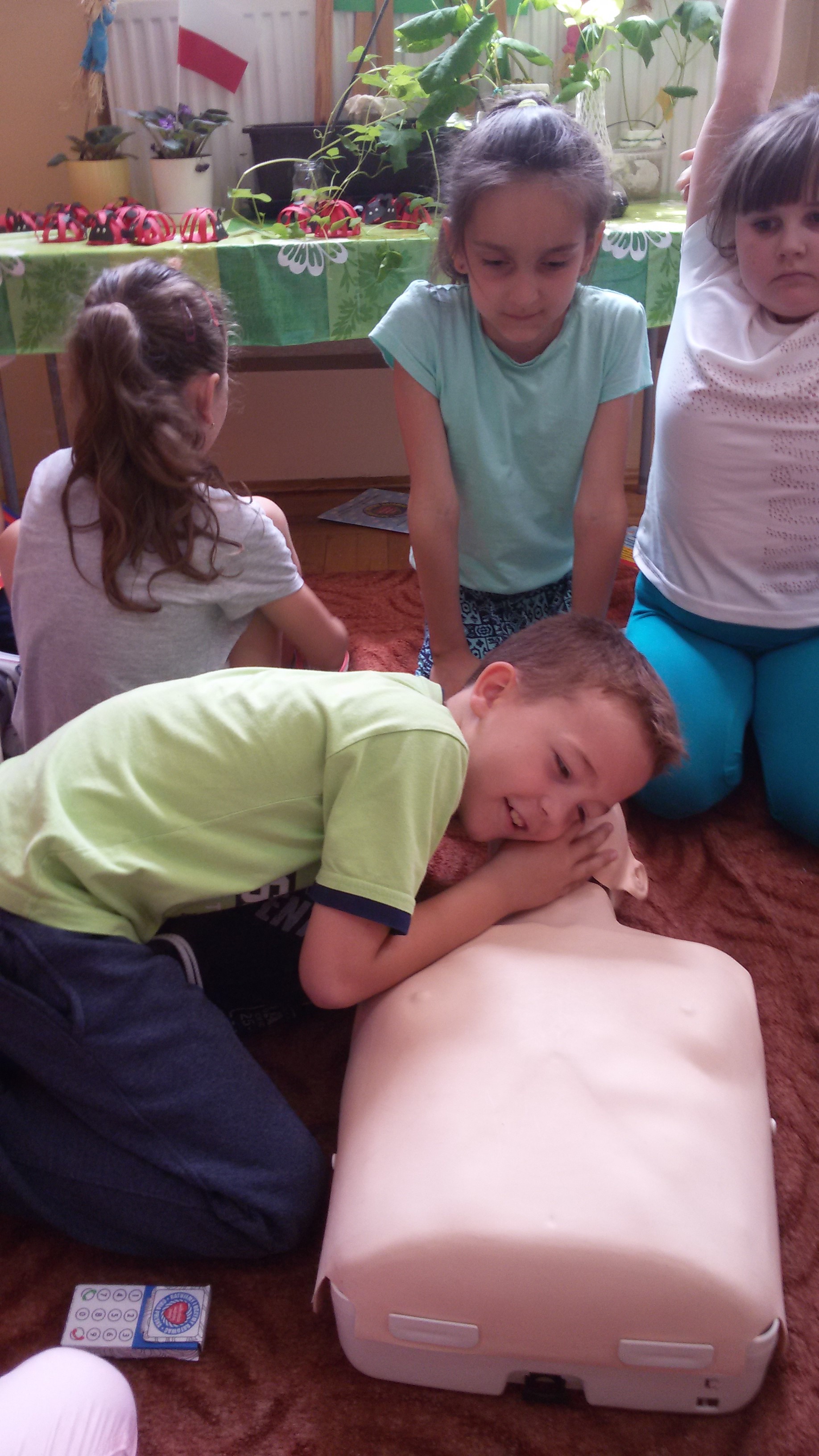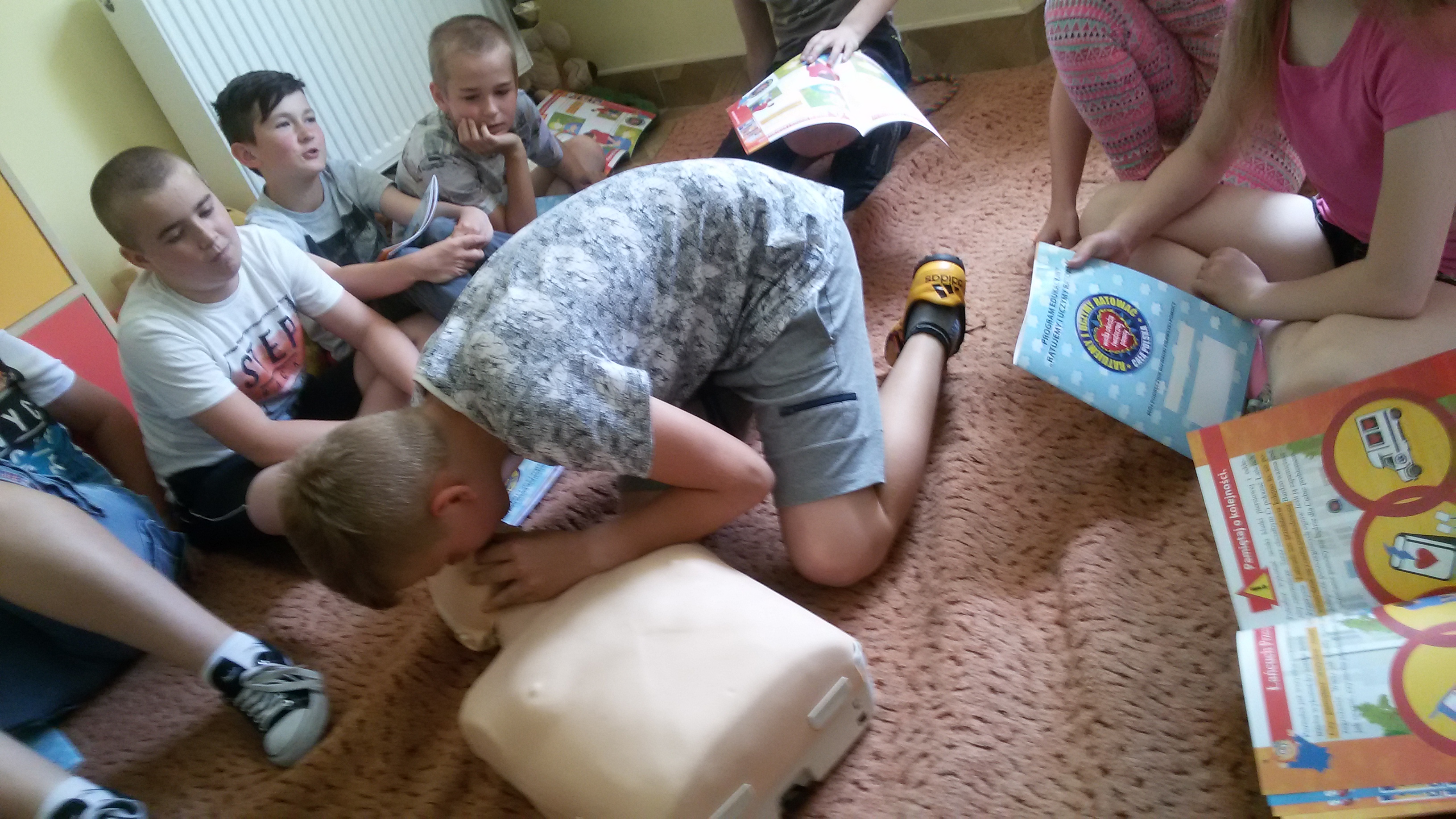 Dzieci, pod okiem instruktorek uczyły się ułożenia poszkodowanego w pozycji bocznej bezpiecznej, a na fantomach ćwiczyły resuscytację krążeniowo – oddechową. Nasi uczniowie doskonale sprawdzili się w roli małych ratowników. Na zakończenie szkolenia otrzymali książeczki ,,Mój pierwszy podręcznik do nauki pierwszej pomocy”, a inni składane telefony z tektury, które mają im służyć do doskonalenia ćwiczeń ratowniczych w domu. Wymienione materiały otrzymaliśmy od fundacji Wielkiej Orkiestry Świątecznej Pomocy, z którą współpracujemy już od wielu lat.