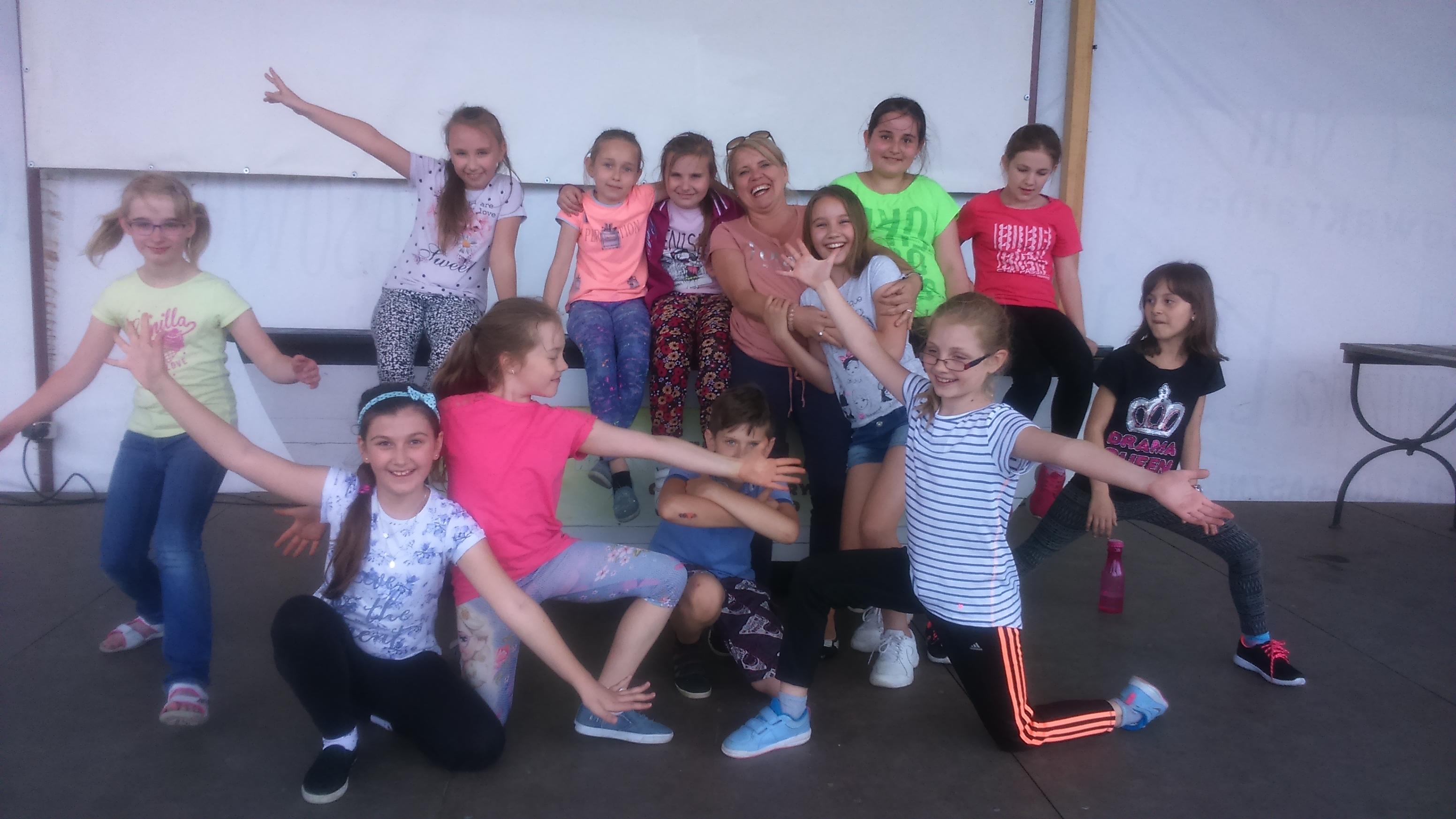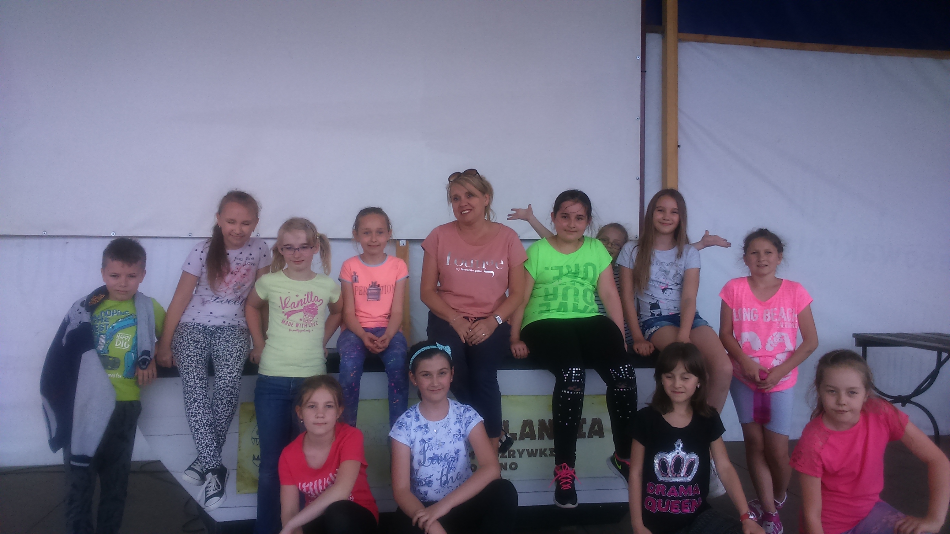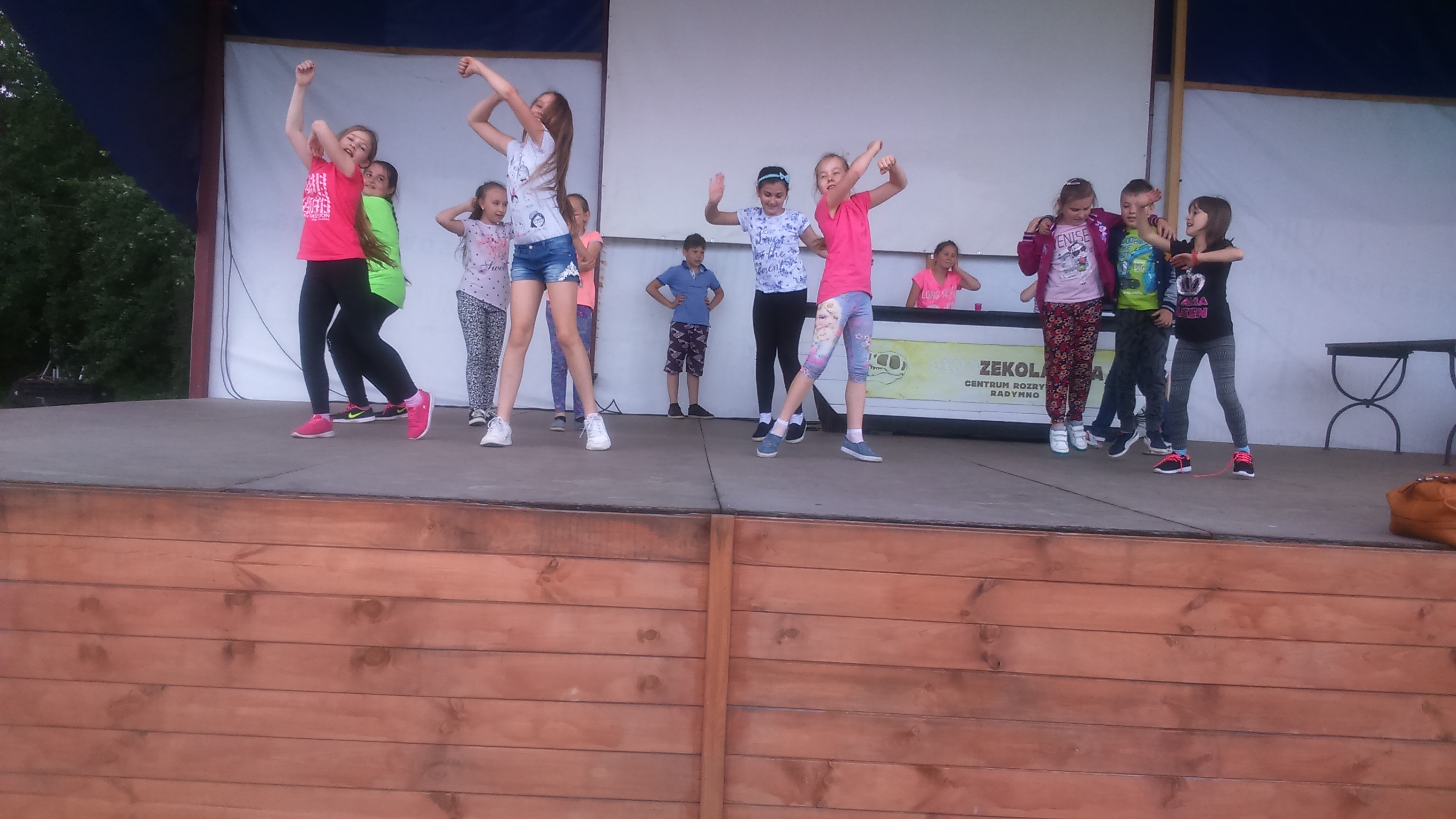 Podczas 3 godzin spędzonych na świeżym powietrzu dzieci pokazały, że potrafią świetnie się bawić. Były zabawy ruchowe, wyścigi, wspinaczki, gra w piłkę oraz ,,odpoczynek na kocyku”. Niektórzy chętnie pograli w gry, które znajdowały się na terenie obiektu. Później były tańce na scenie do ulubionych przebojów. Na zakończenie – pizza dla wszystkich.