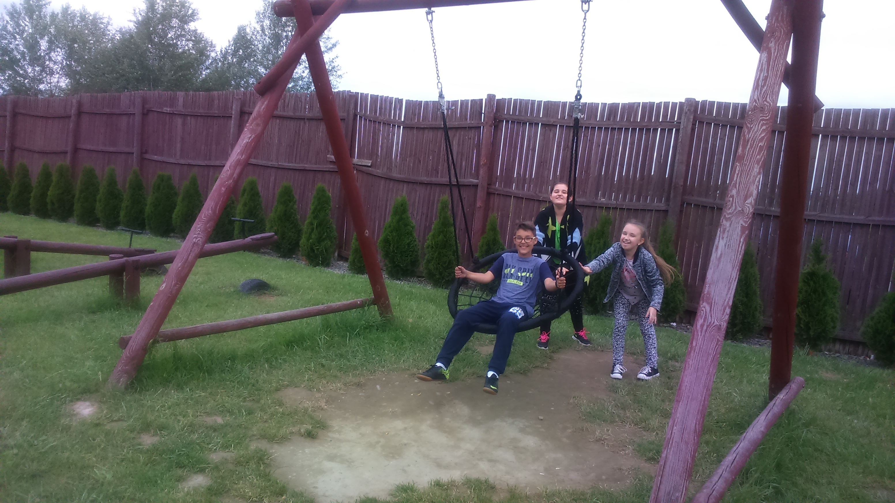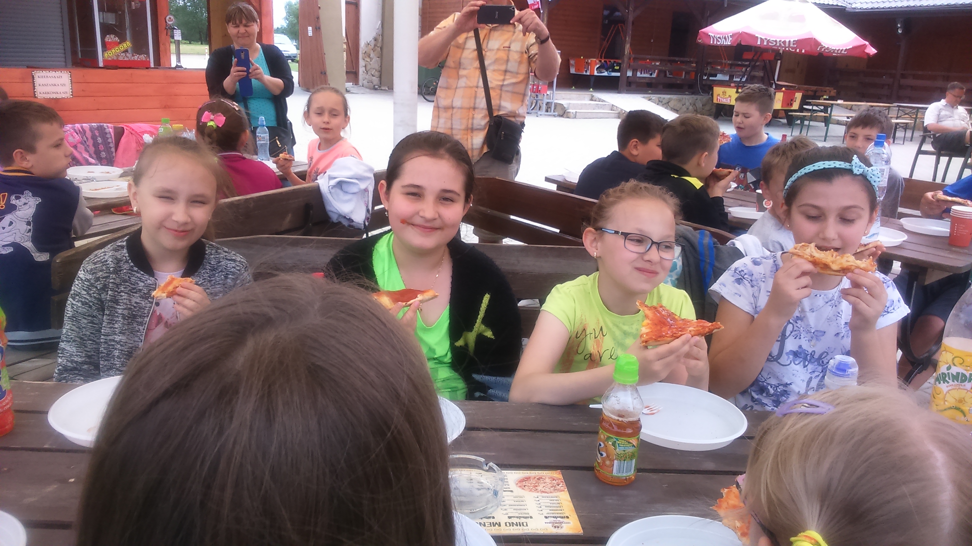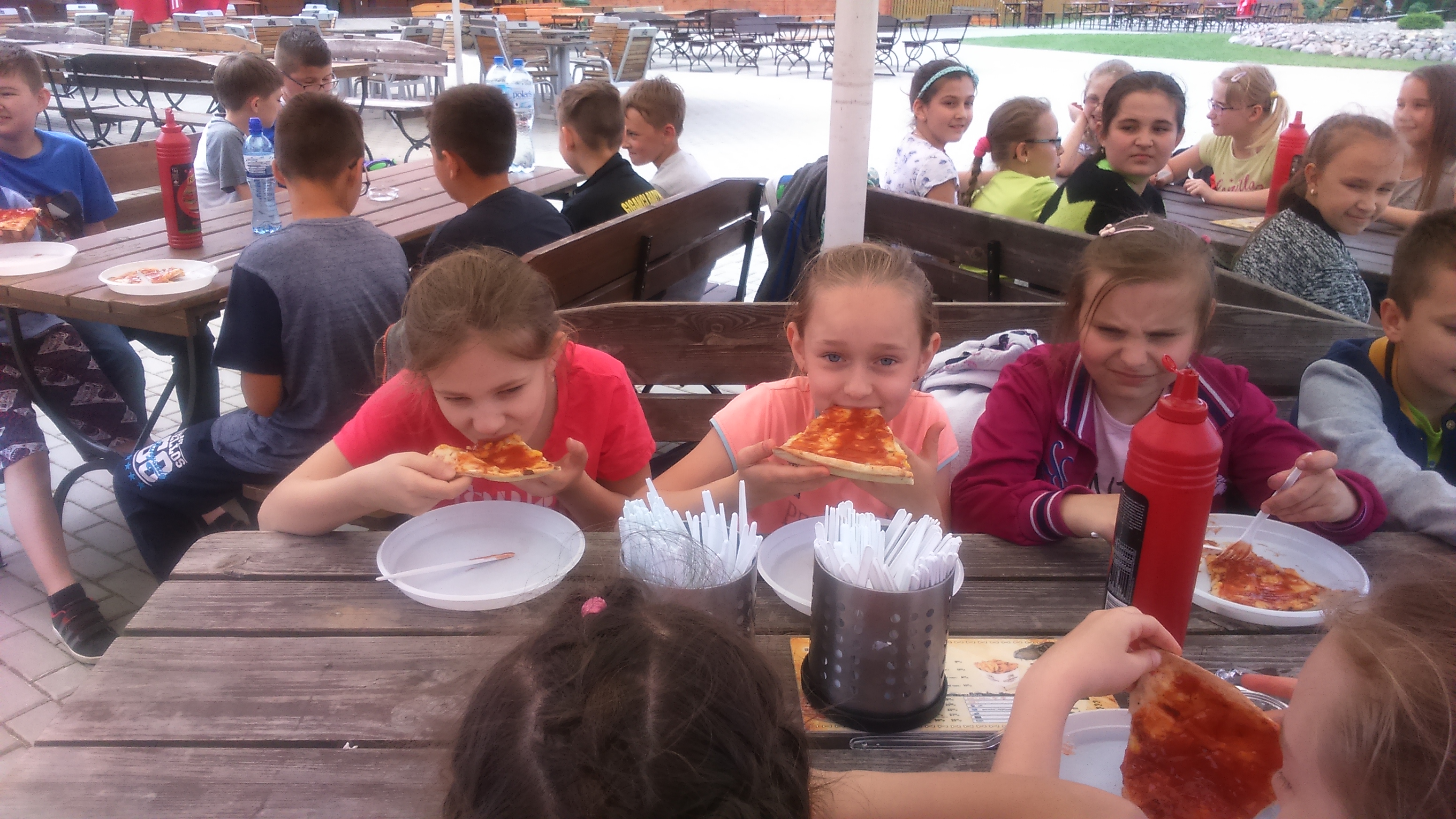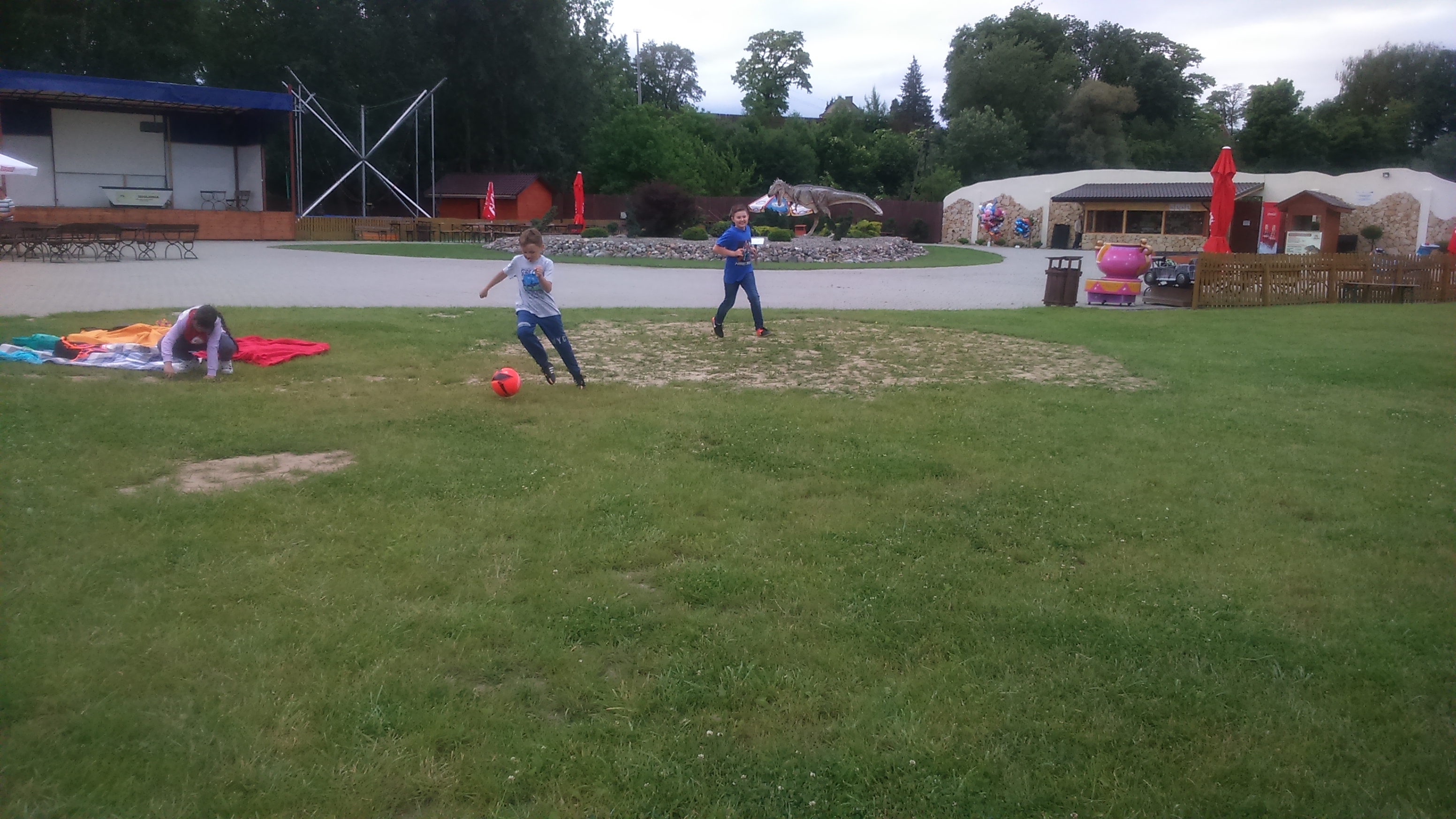 Podczas 3 godzin spędzonych na świeżym powietrzu dzieci pokazały, że potrafią świetnie się bawić. Były zabawy ruchowe, wyścigi, wspinaczki, gra w piłkę oraz ,,odpoczynek na kocyku”. Niektórzy chętnie pograli w gry, które znajdowały się na terenie obiektu. Później były tańce na scenie do ulubionych przebojów. Na zakończenie – pizza dla wszystkich.