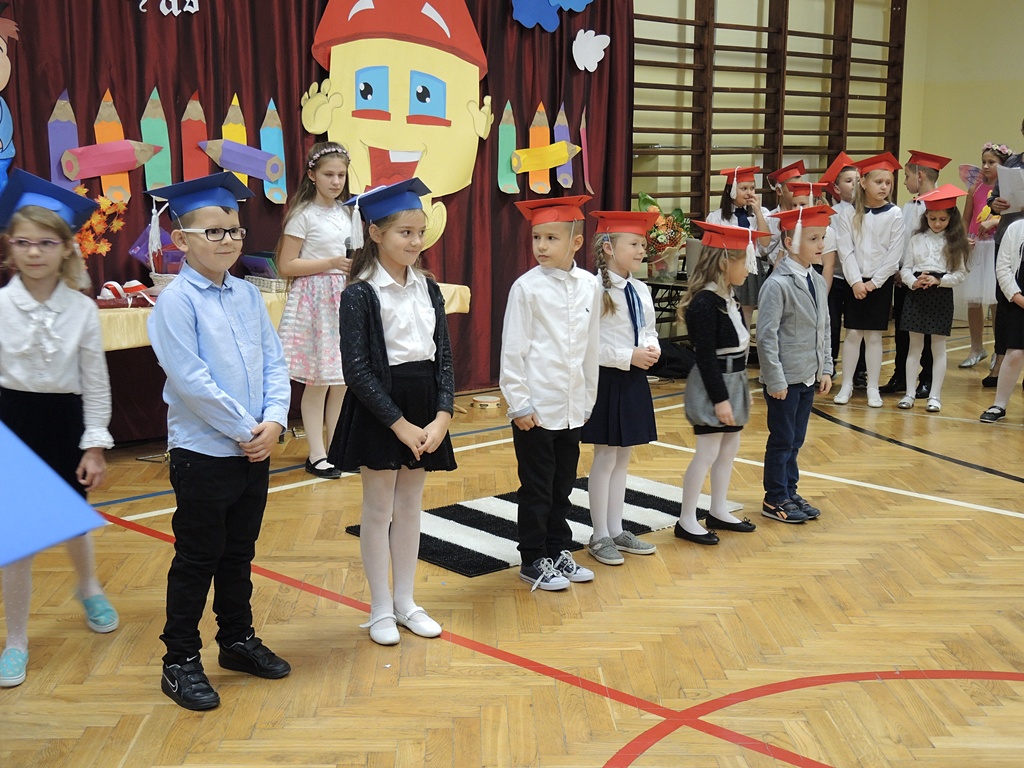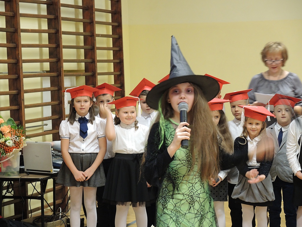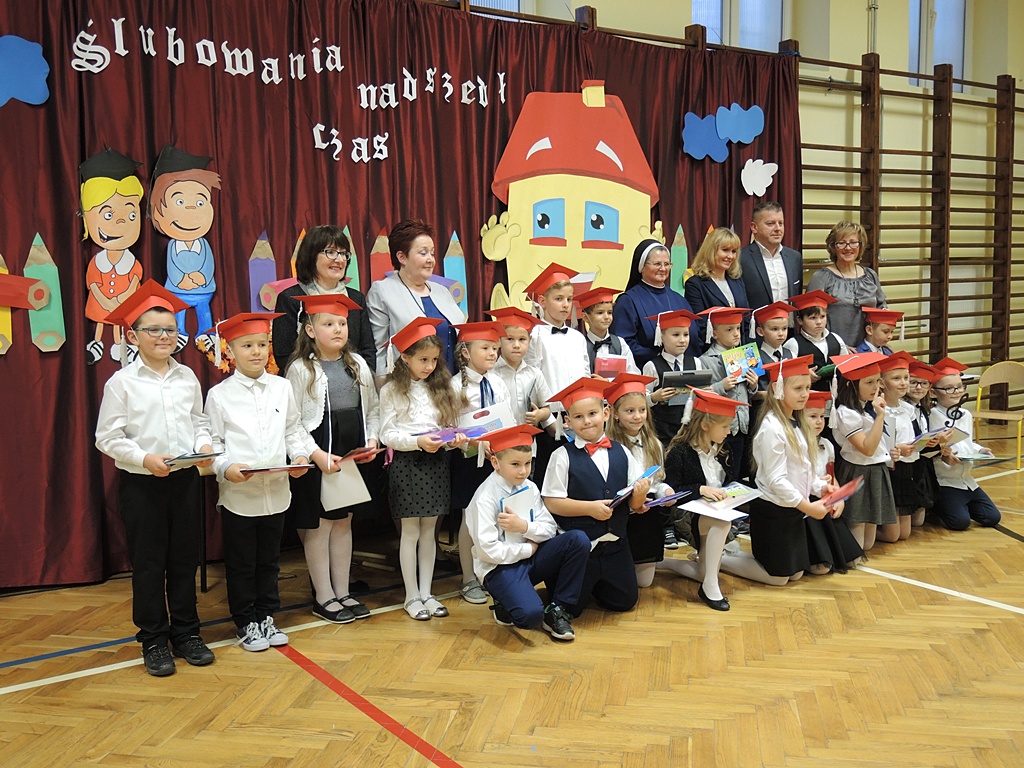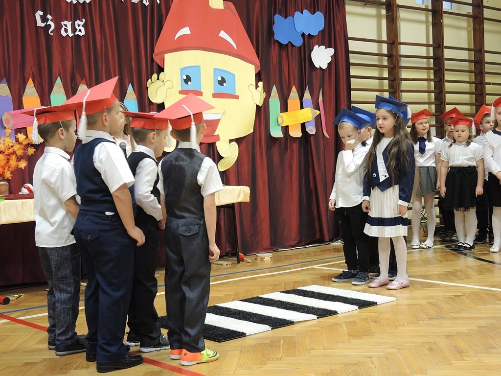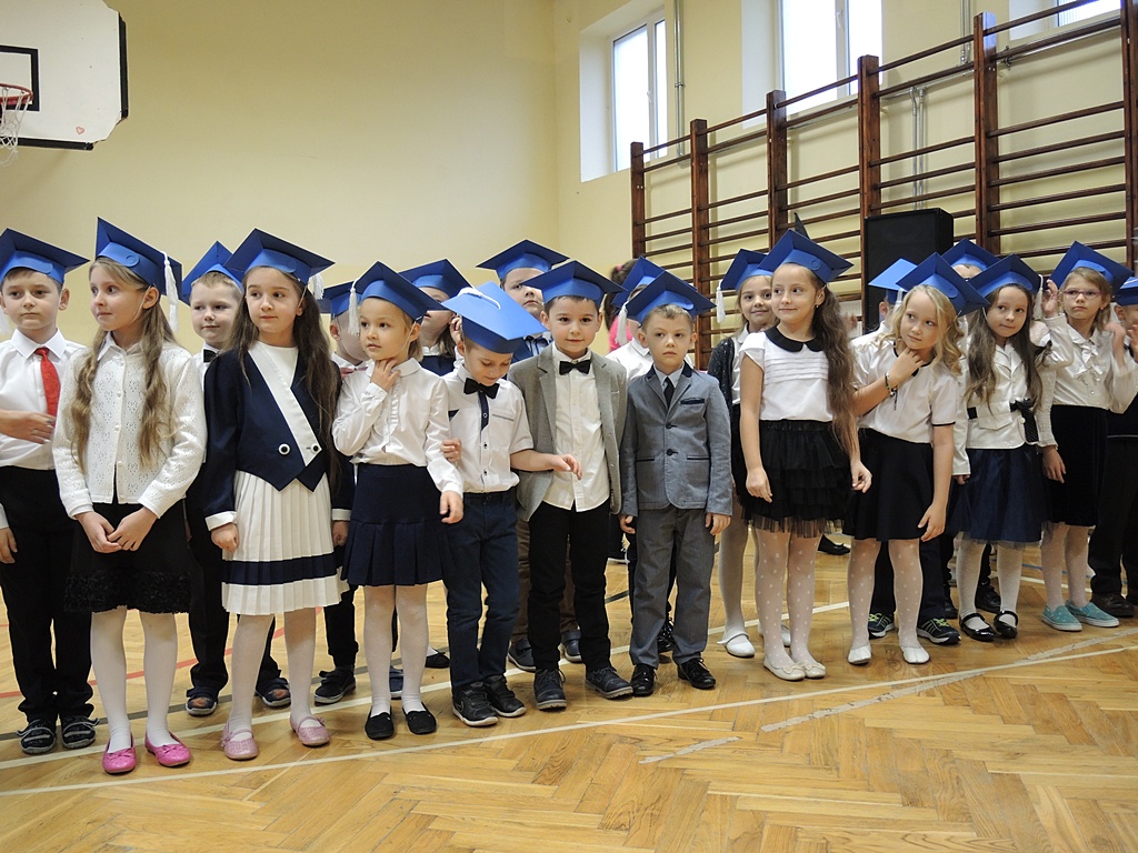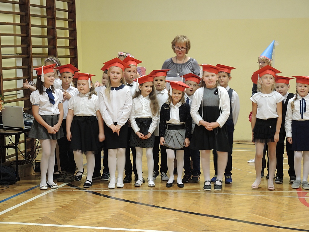 Dnia 24 października 2017 r. w naszej szkole odbyła się uroczystość PASOWANIA NA UCZNIA SZKOŁY PODSTAWOWEJ. Punktualnie o godz. 16.00 pod okiem wychowawców p. A. Suchej i D. Woźniak do sali gimnastycznej wkroczyli pierwszoklasiści w galowych strojach i kolorowych biretach. Na uroczystość przybyli zaproszeni goście: s. E. Wilk – dyrektor Przedszkola Parafialnego, p. M. Trojnar – dyrektor Przedszkola Samorządowego oraz p. A. Marciak – przewodniczący Rady Rodziców i p. B. Rajzer z-ca przewodniczącego Rady Rodziców. Pani Dyrektor Maria Jędrejko serdecznie powitała wszystkich, a następnie oddała głos dzieciom – one to bowiem były bohaterami tego spotkania. Pierwszaki wraz z uczniami klas starszych przygotowali program artystyczny pod okiem swoich wychowawczyń.