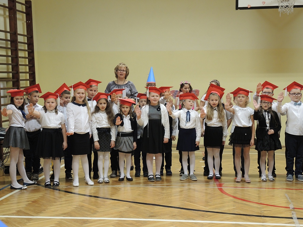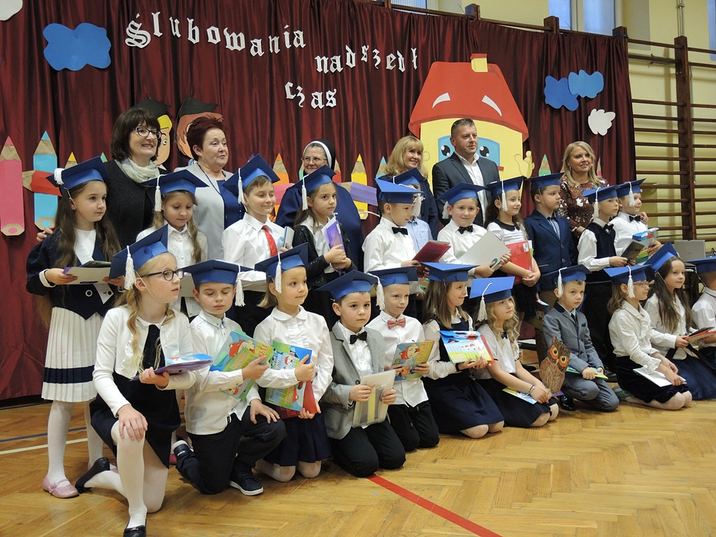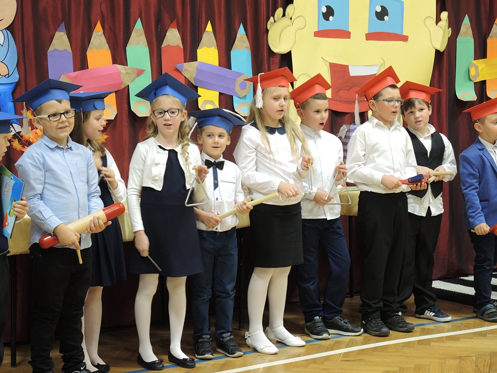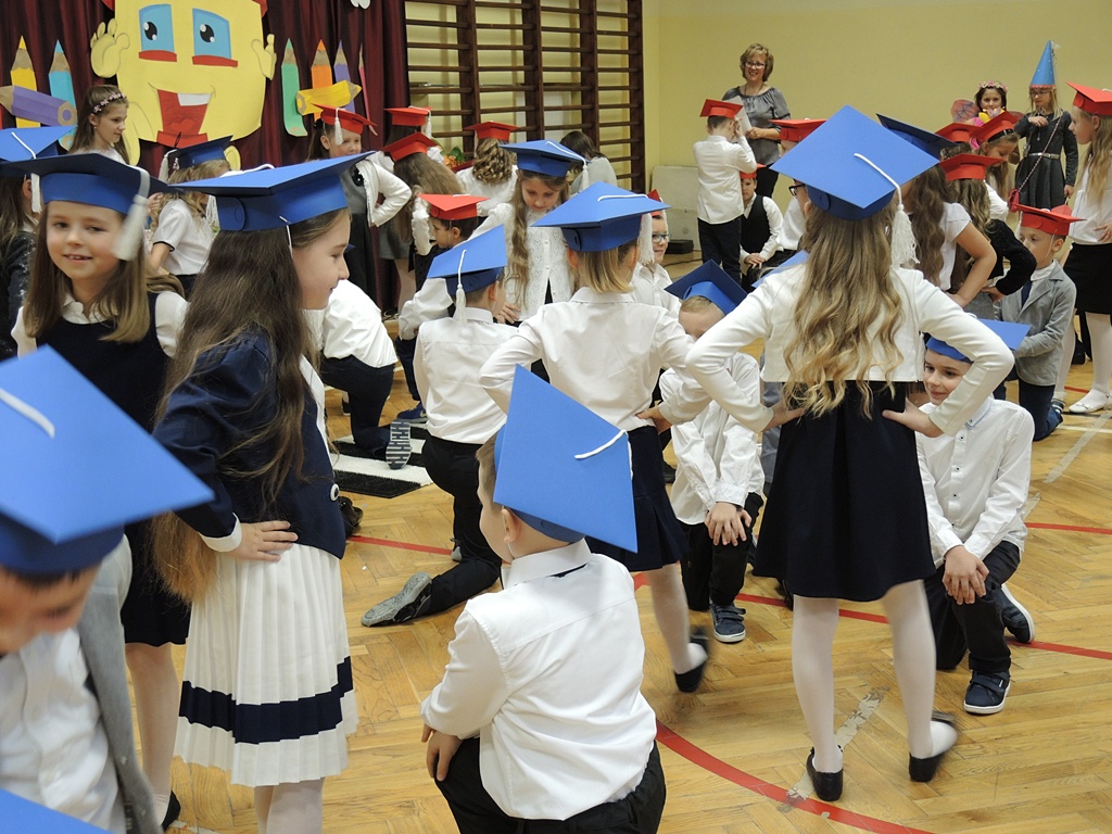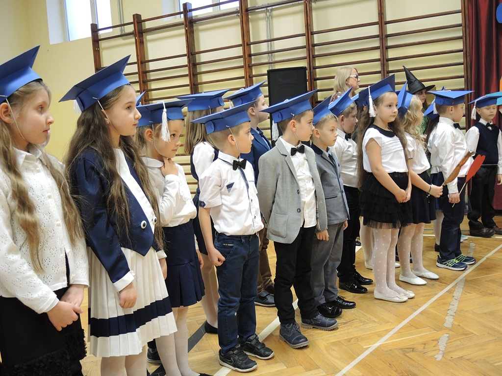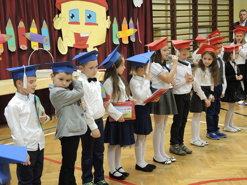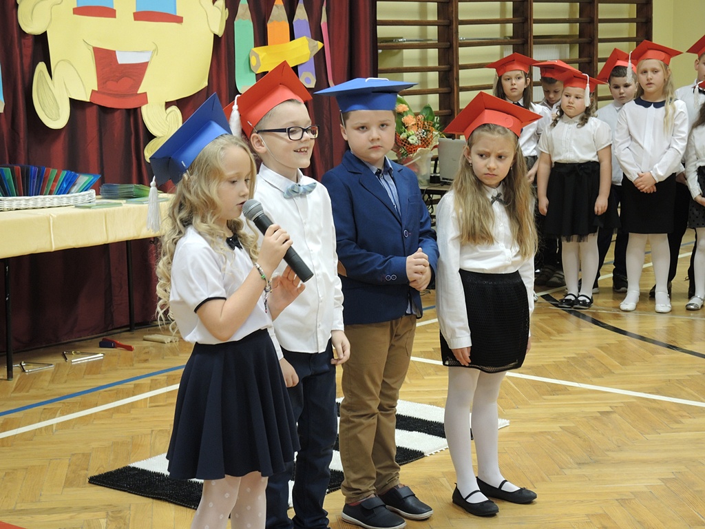 Dnia 24 października 2017 r. w naszej szkole odbyła się uroczystość PASOWANIA NA UCZNIA SZKOŁY PODSTAWOWEJ. Punktualnie o godz. 16.00 pod okiem wychowawców p. A. Suchej i D. Woźniak do sali gimnastycznej wkroczyli pierwszoklasiści w galowych strojach i kolorowych biretach. Na uroczystość przybyli zaproszeni goście: s. E. Wilk – dyrektor Przedszkola Parafialnego, p. M. Trojnar – dyrektor Przedszkola Samorządowego oraz p. A. Marciak – przewodniczący Rady Rodziców i p. B. Rajzer z-ca przewodniczącego Rady Rodziców. Pani Dyrektor Maria Jędrejko serdecznie powitała wszystkich, a następnie oddała głos dzieciom – one to bowiem były bohaterami tego spotkania. Pierwszaki wraz z uczniami klas starszych przygotowali program artystyczny pod okiem swoich wychowawczyń.