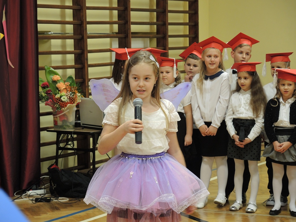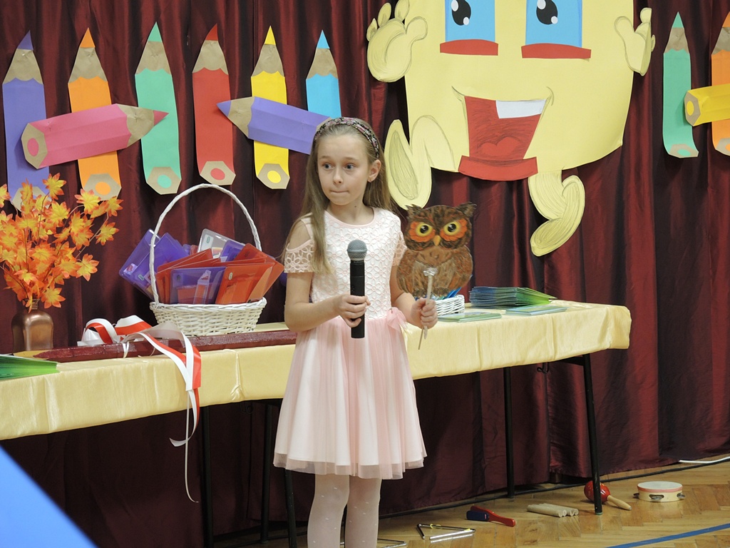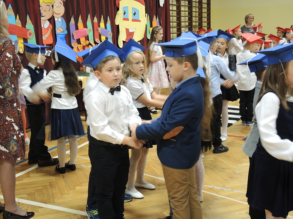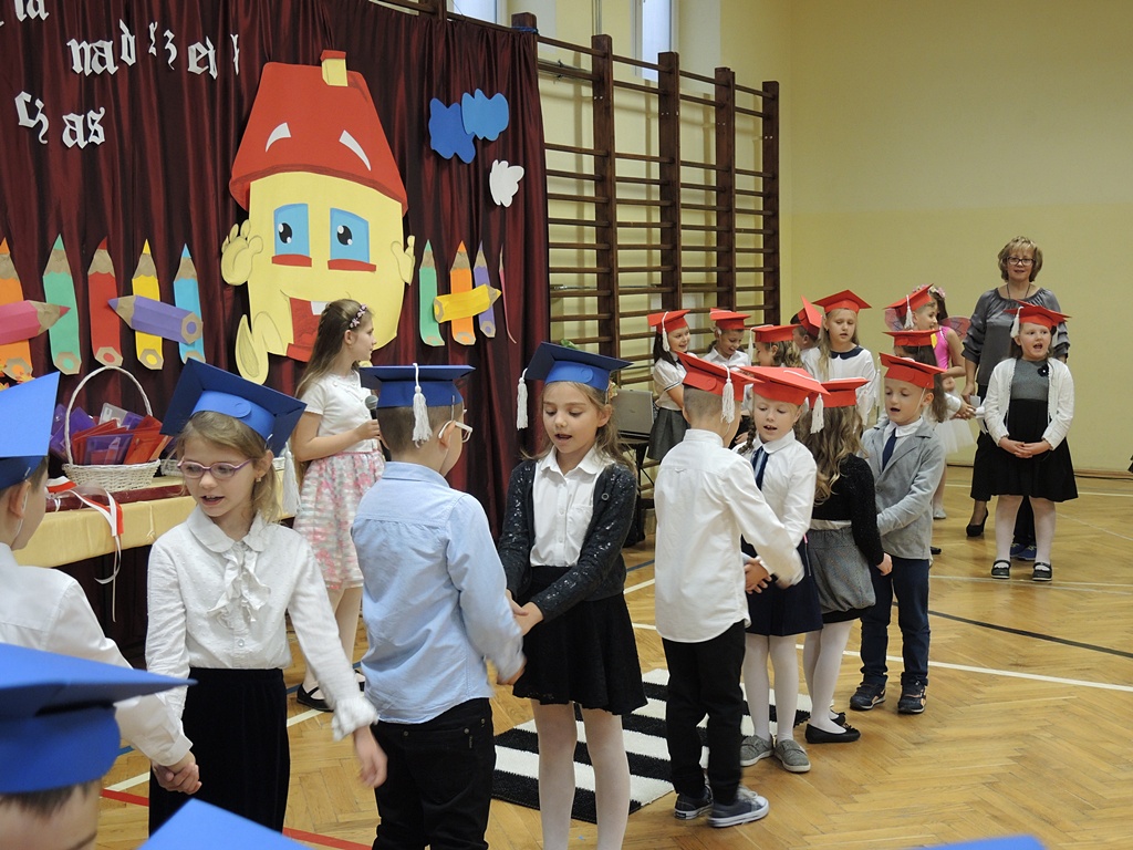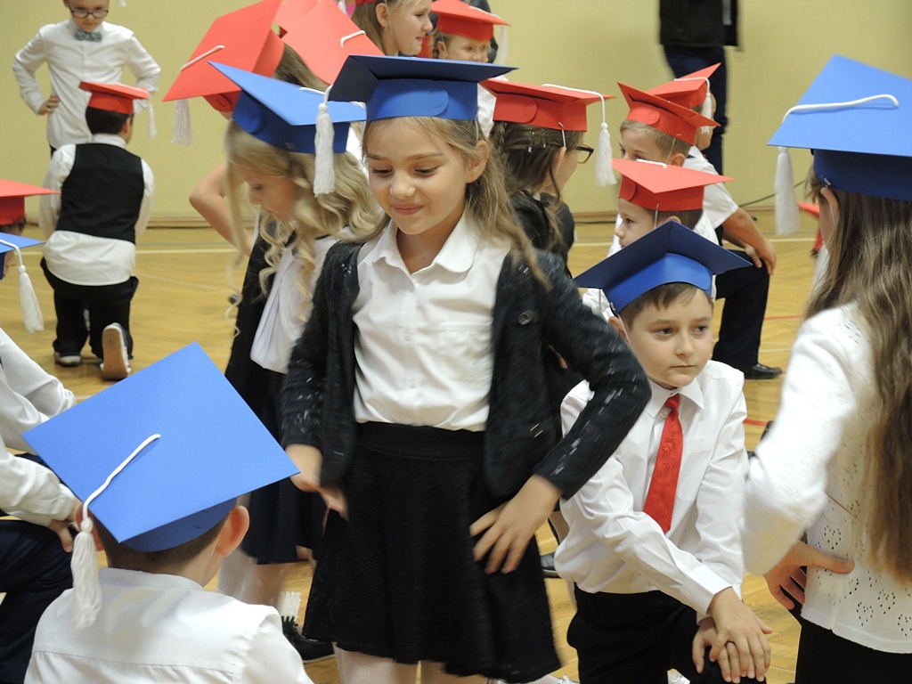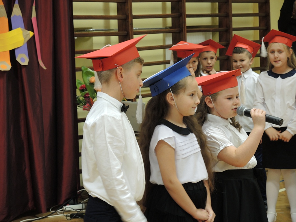 Dnia 24 października 2017 r. w naszej szkole odbyła się uroczystość PASOWANIA NA UCZNIA SZKOŁY PODSTAWOWEJ. Punktualnie o godz. 16.00 pod okiem wychowawców p. A. Suchej i D. Woźniak do sali gimnastycznej wkroczyli pierwszoklasiści w galowych strojach i kolorowych biretach. Na uroczystość przybyli zaproszeni goście: s. E. Wilk – dyrektor Przedszkola Parafialnego, p. M. Trojnar – dyrektor Przedszkola Samorządowego oraz p. A. Marciak – przewodniczący Rady Rodziców i p. B. Rajzer z-ca przewodniczącego Rady Rodziców. Pani Dyrektor Maria Jędrejko serdecznie powitała wszystkich, a następnie oddała głos dzieciom – one to bowiem były bohaterami tego spotkania. Pierwszaki wraz z uczniami klas starszych przygotowali program artystyczny pod okiem swoich wychowawczyń.