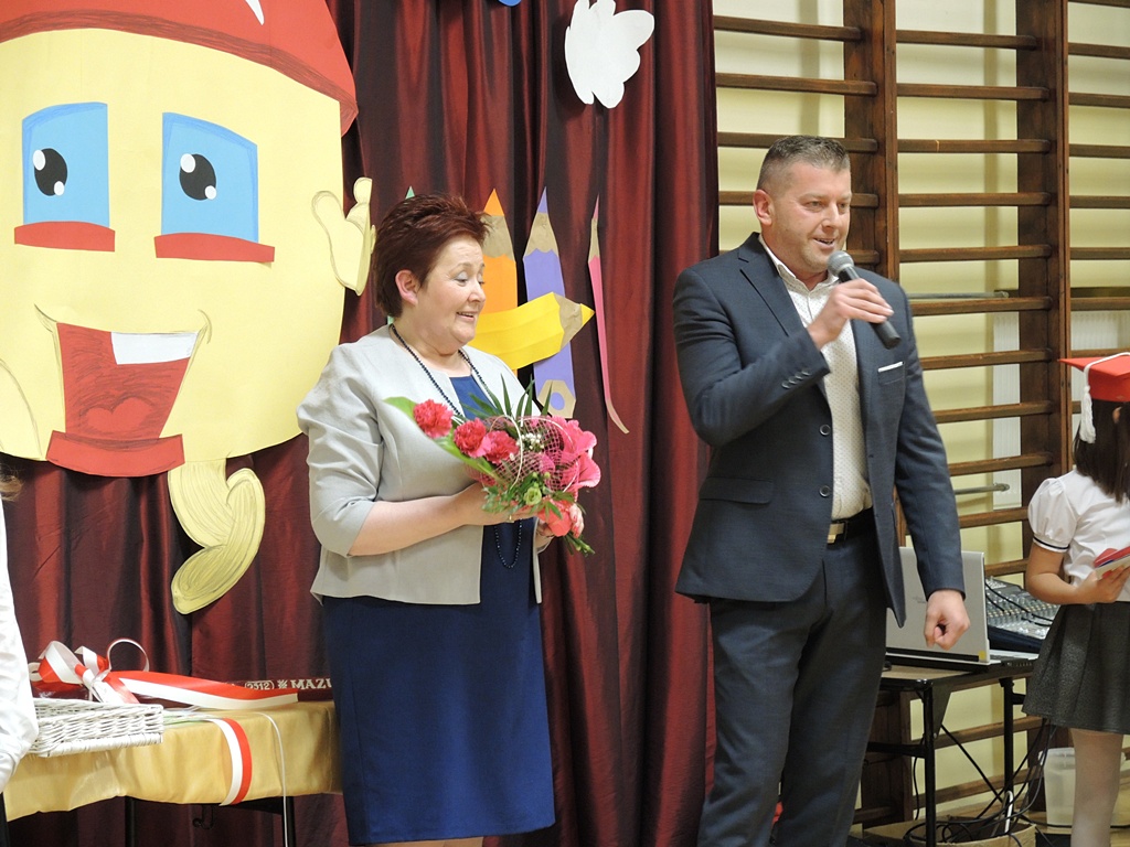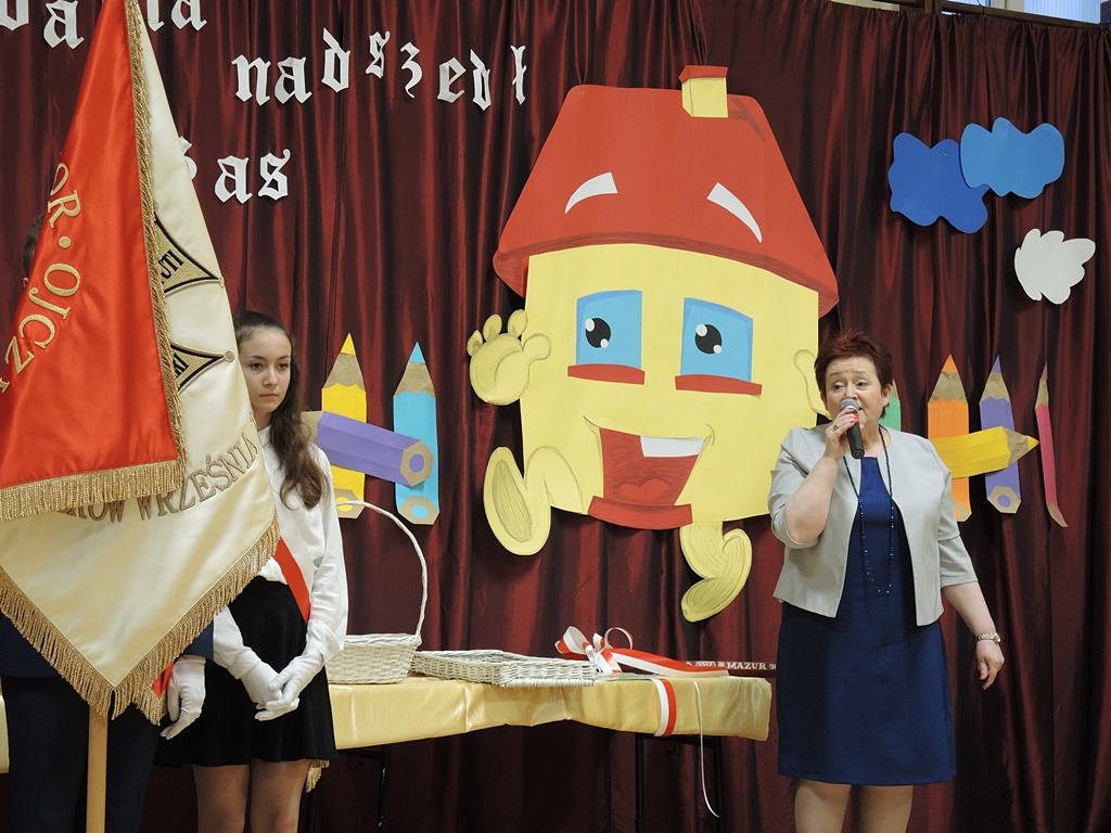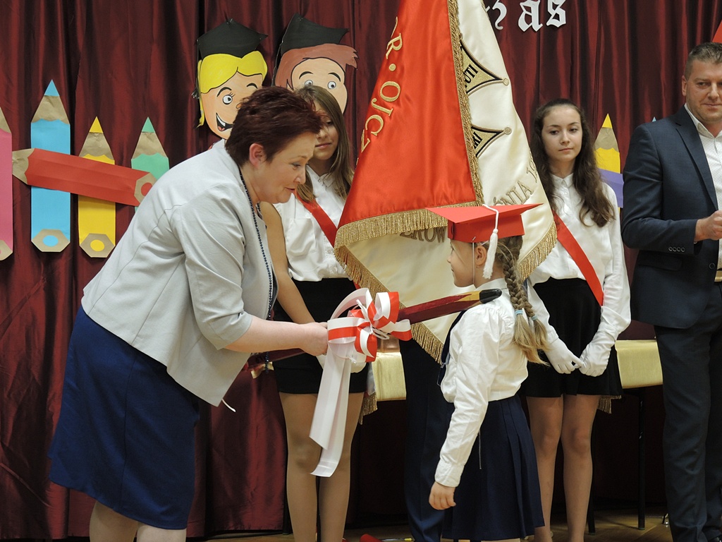 Po części artystycznej nastąpiła część oficjalna. Przy sztandarze szkoły dzieci powtarzały słowa ślubowania: