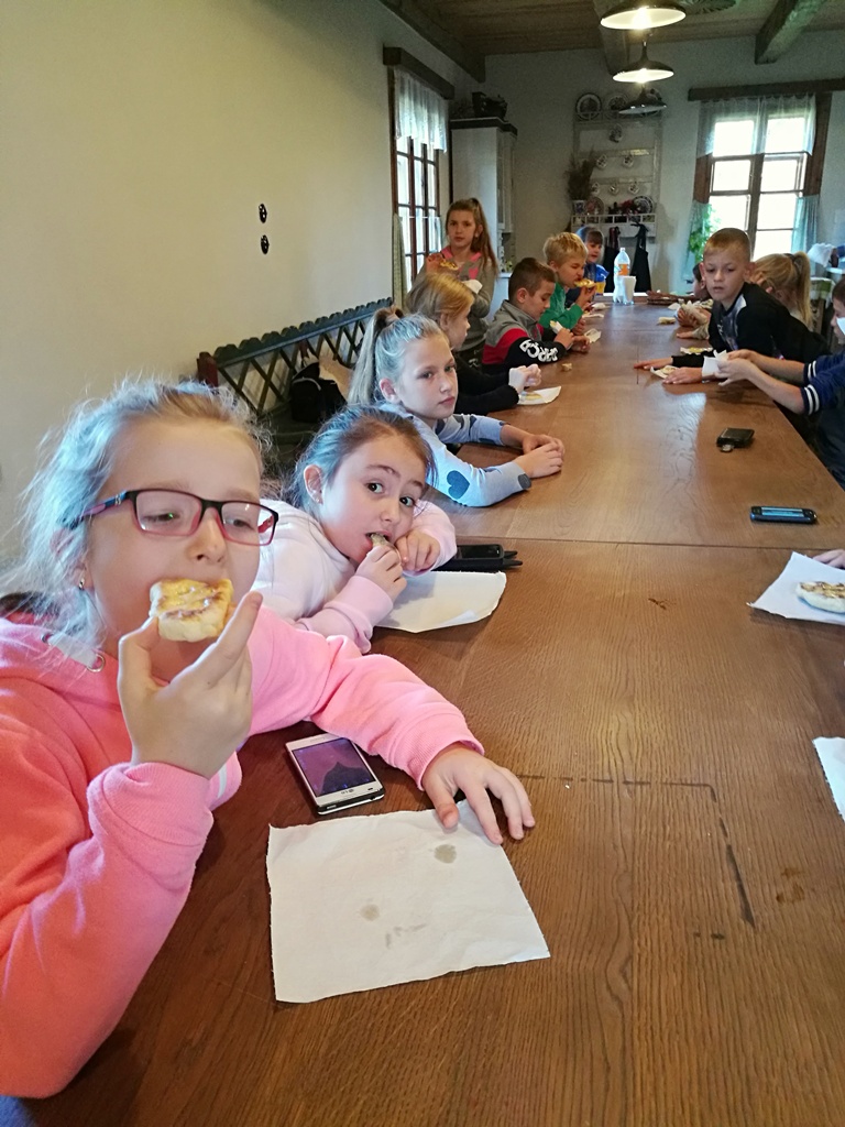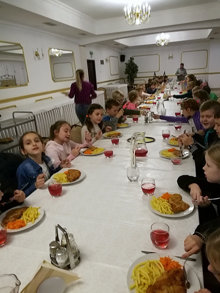 Ostatnim punktem wycieczki był wspólny obiad w restauracji „Dębianka”, po czym uczniowie pełni wrażeń, z pamiątkami, z uśmiechem i wspólnym śpiewem, szczęśliwie wrócili do domu.
