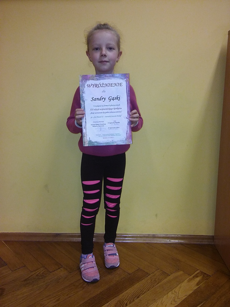 W XII Edycji Wojewódzkiego Konkursu dla dzieci i młodzieży „Moje Wzrastanie Ku Pełni Człowieczeństwa” na temat : „Jan Paweł II – świadek historii Polski” uczennica naszej szkoły Sandra Gąska zdobyła wyróżnienie robiąc prace na zajęciach w świetlicy. Serdecznie gratuluję i życzę kolejnych sukcesów
