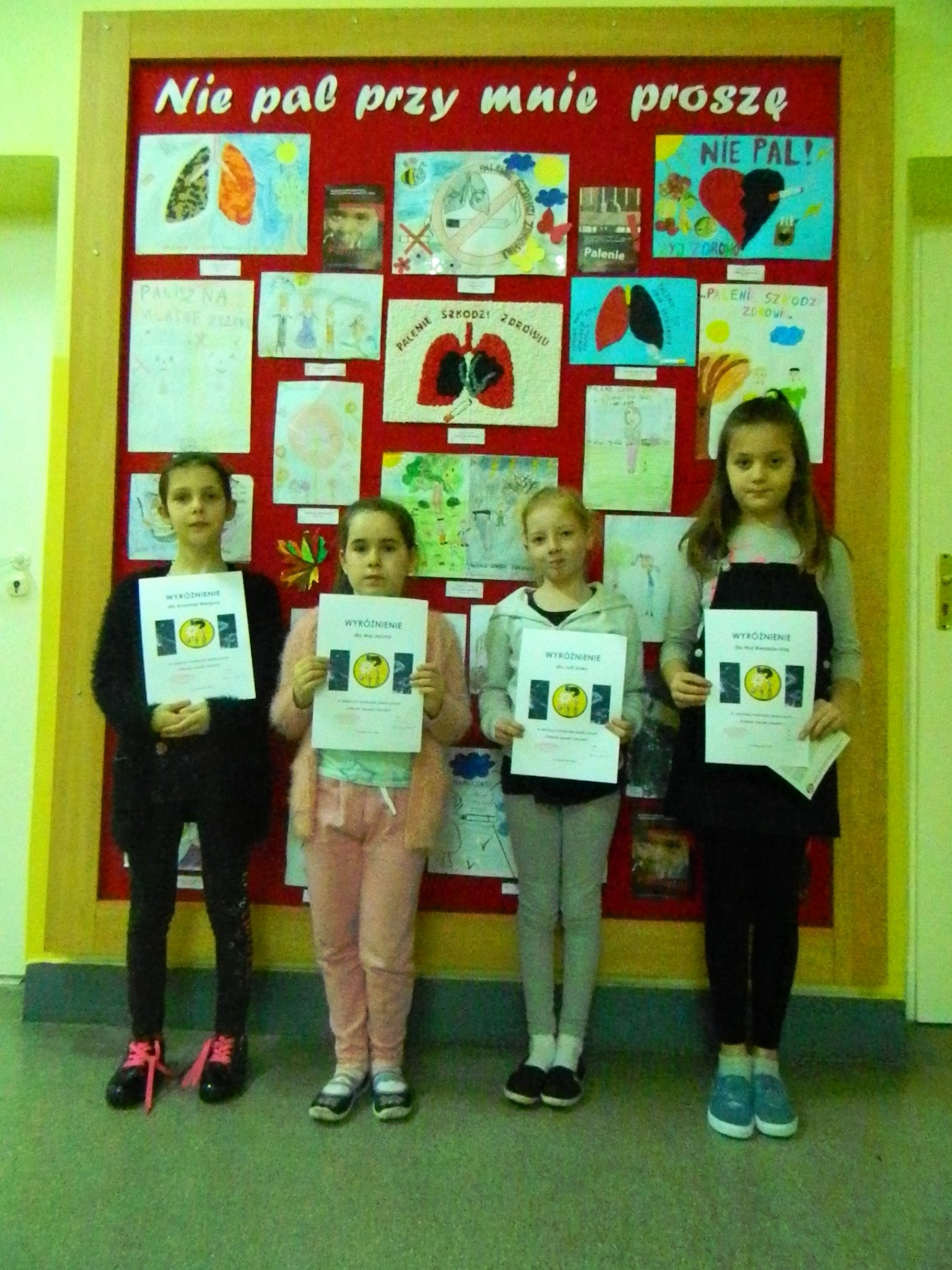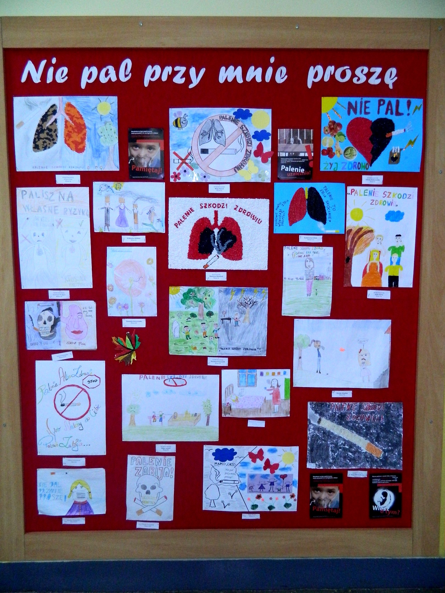 Na przełomie października i listopada 2017 realizowano w naszej szkole program profilaktyczny „Nie pal przy mnie proszę” rekomendowany Powiatową Stacją Sanitarno – Epidemiologiczną w Jarosławiu. Jego głównym celem było wykształcenie u dzieci umiejętności radzenia sobie w sytuacjach, w których inne osoby palą przy nich papierosy. Realizacja programu służyła poszerzeniu wiedzy uczniów o zdrowiu, uświadamianiu im, że palenie tytoniu jest szkodliwe i uwrażliwieniu ich na skutki biernego palenia. Programem zostali nim objęci uczniowie z klas I, II oraz z klasy III a. Realizatorkami programu były: p. Ala Sucha, p. Danuta Woźniak, p. Joanna Maziarz, p. Małgorzata Hamacher, p. Anna Biesiadecka. Całość działań koordynowała pedagog szkoły p. Katarzyna Gałęza. W ramach realizacji programu odbywały się cykliczne zajęcia profilaktyczne z uczniami zwieńczone konkursem plastycznym. Spotkanie ogólne podsumowujące działania programowe odbyło się 15 listopada 2017 r. W tym dniu został rozstrzygnięty konkurs plastyczny „Palenie szkodzi zdrowiu!”. Jego wyniki przedstawiają się następująco: