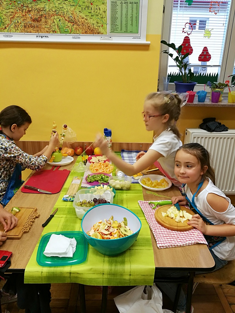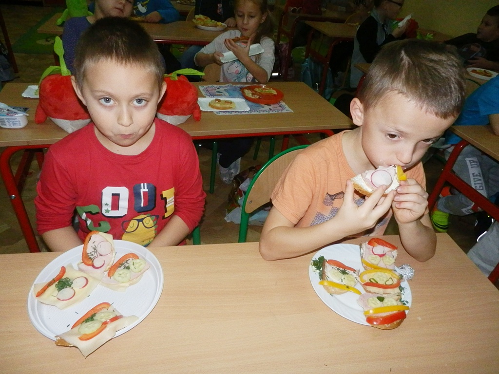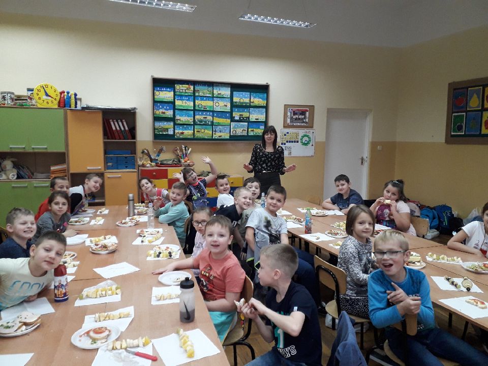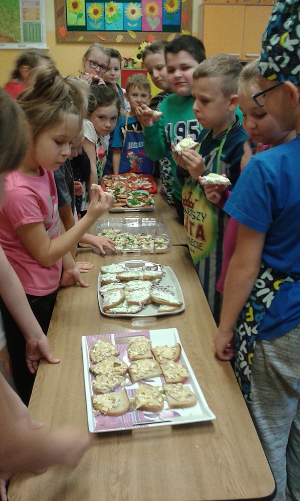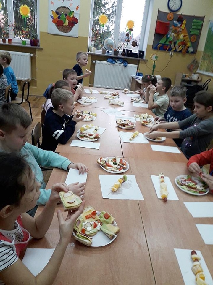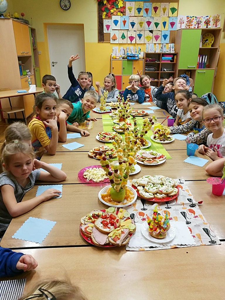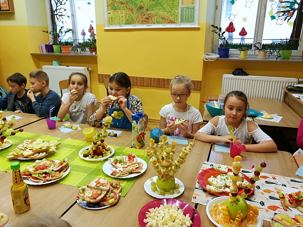 Z przyniesionych produktów dzieci klas I przygotowały wesołe kanapki , z klas II – kanapki i owocowe szaszłyki, zaś z klas III – sałatkę, kilka rodzajów past do chleba i szaszłyki z owoców. Wspólnie przygotowany i spożyty posiłek połączony był z przypomnieniem wszystkim 12 zasad zdrowego żywienia.