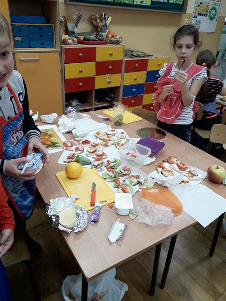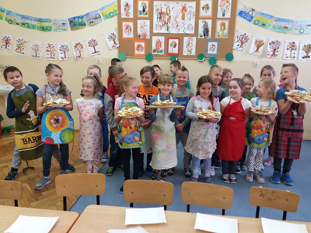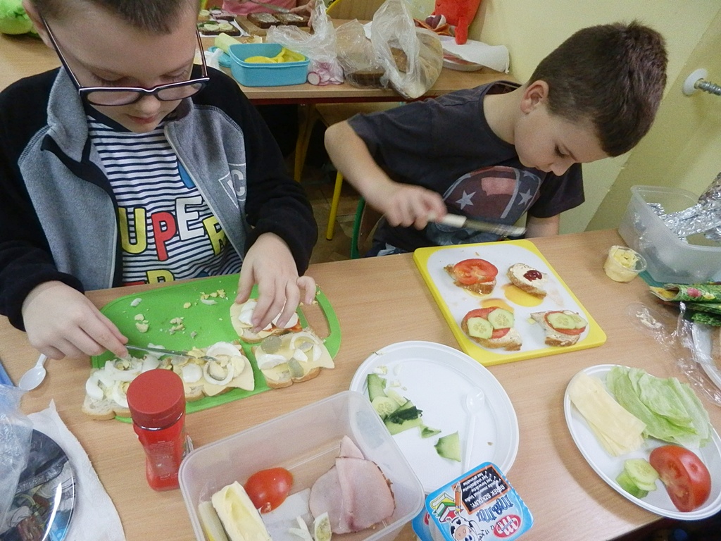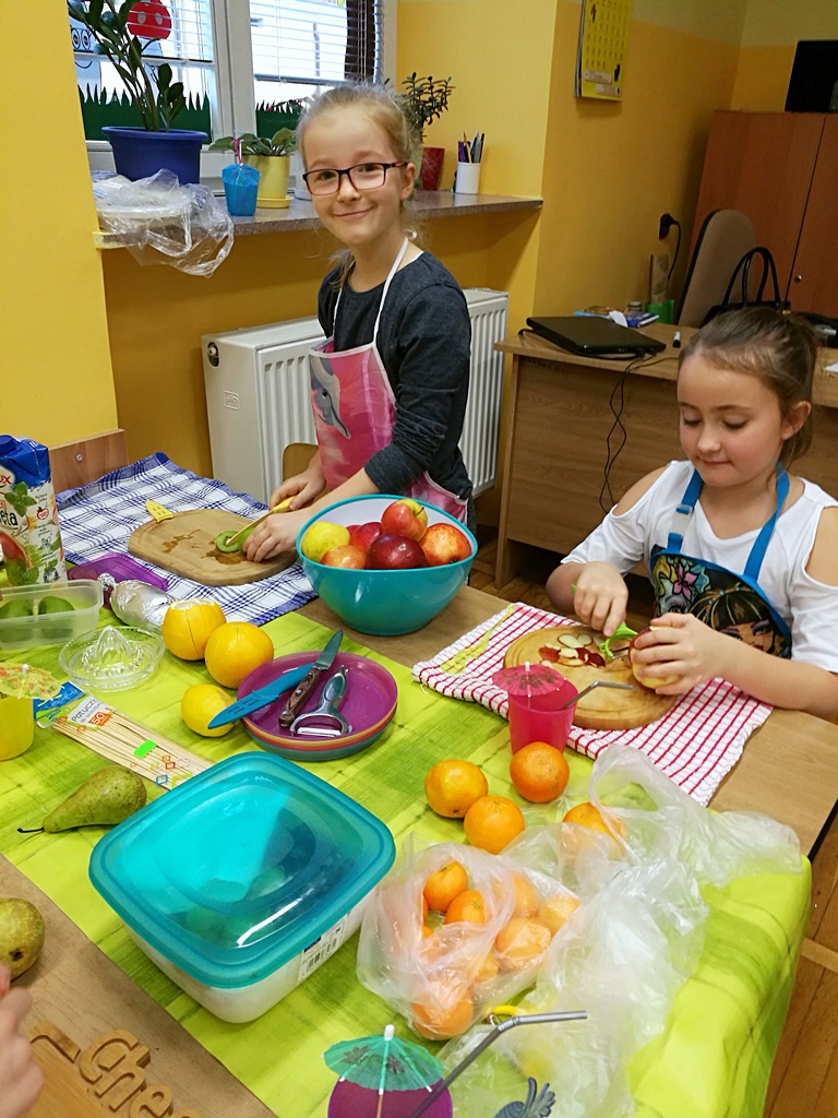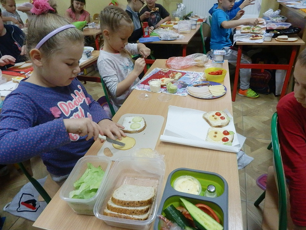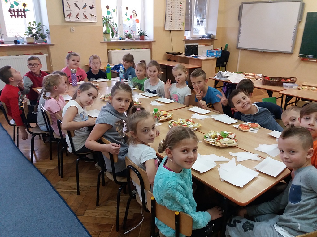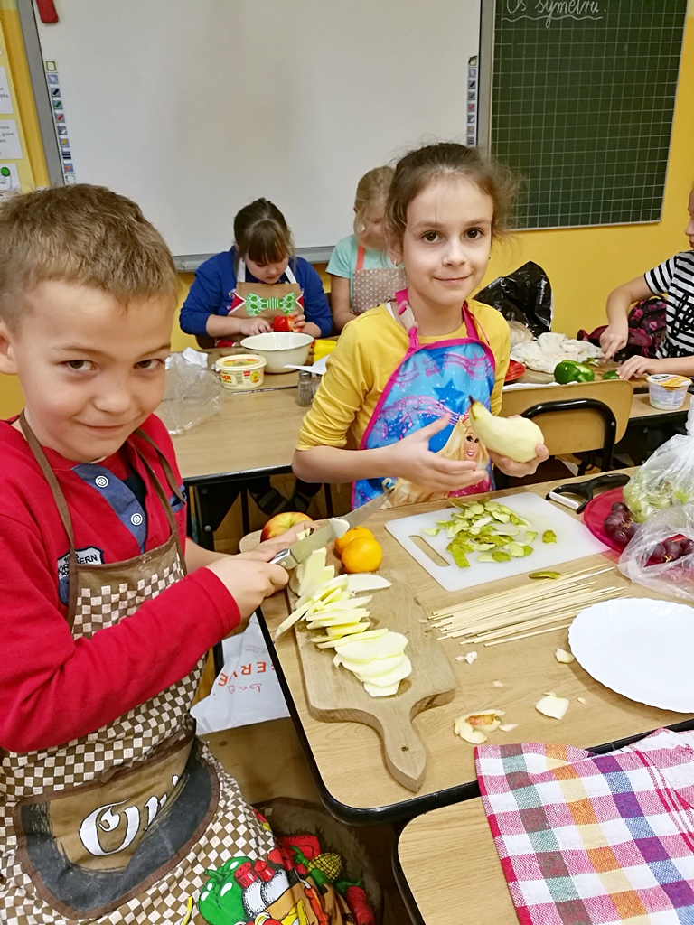 Z przyniesionych produktów dzieci klas I przygotowały wesołe kanapki , z klas II – kanapki i owocowe szaszłyki, zaś z klas III – sałatkę, kilka rodzajów past do chleba i szaszłyki z owoców. Wspólnie przygotowany i spożyty posiłek połączony był z przypomnieniem wszystkim 12 zasad zdrowego żywienia.