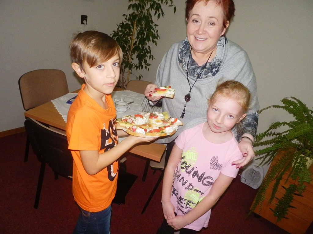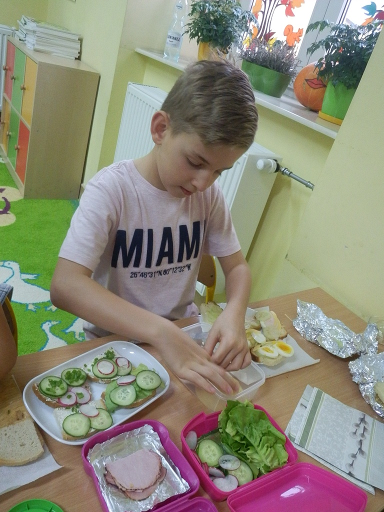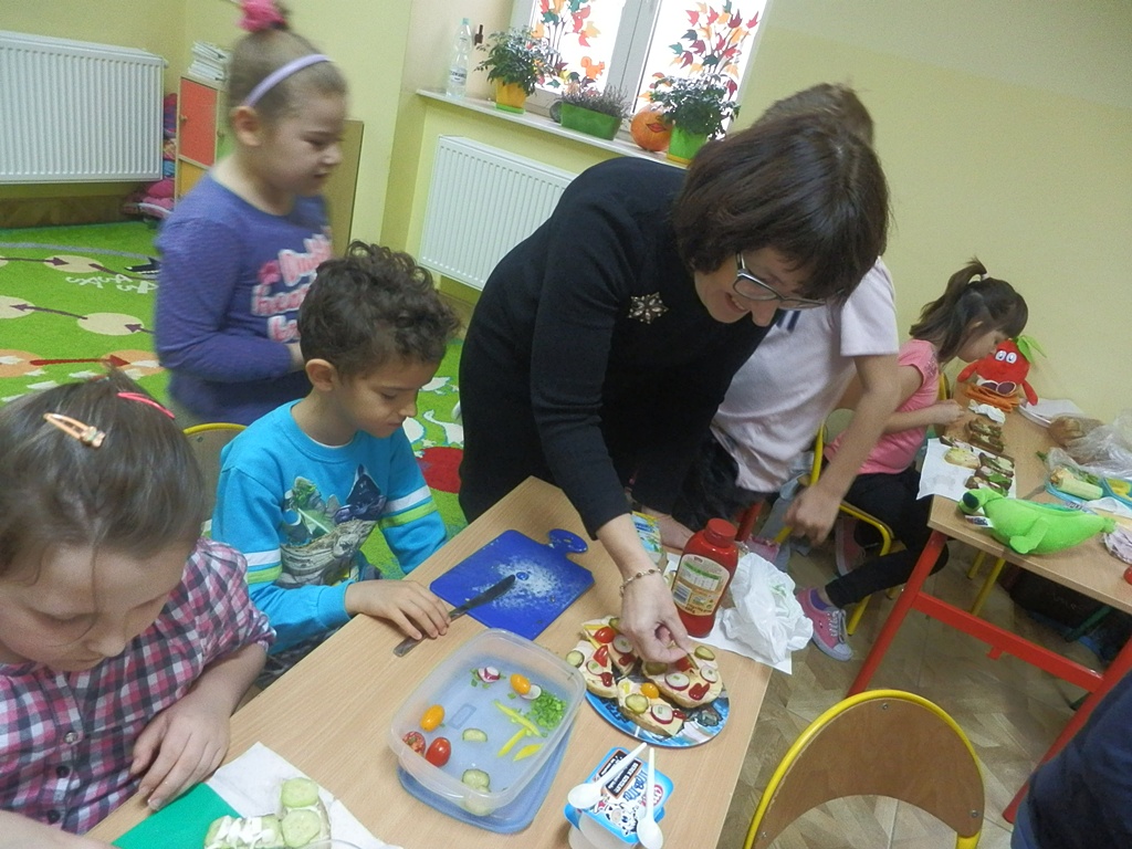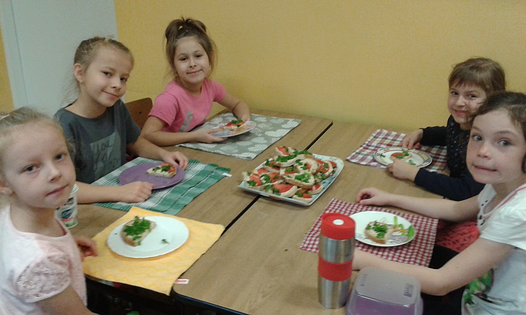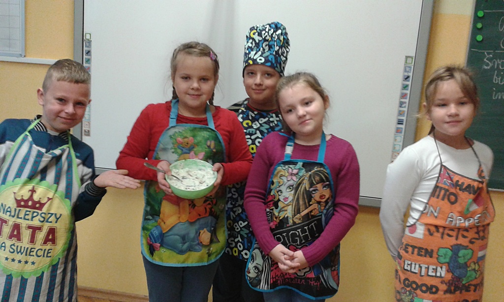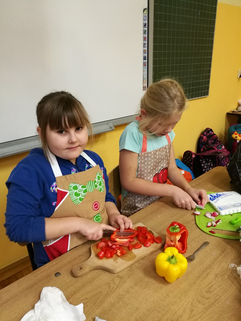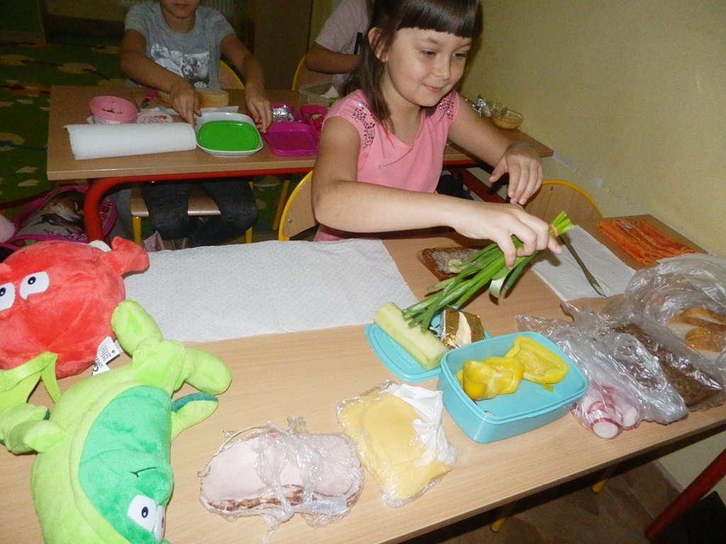 Z przyniesionych produktów dzieci klas I przygotowały wesołe kanapki , z klas II – kanapki i owocowe szaszłyki, zaś z klas III – sałatkę, kilka rodzajów past do chleba i szaszłyki z owoców. Wspólnie przygotowany i spożyty posiłek połączony był z przypomnieniem wszystkim 12 zasad zdrowego żywienia.