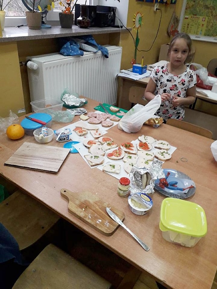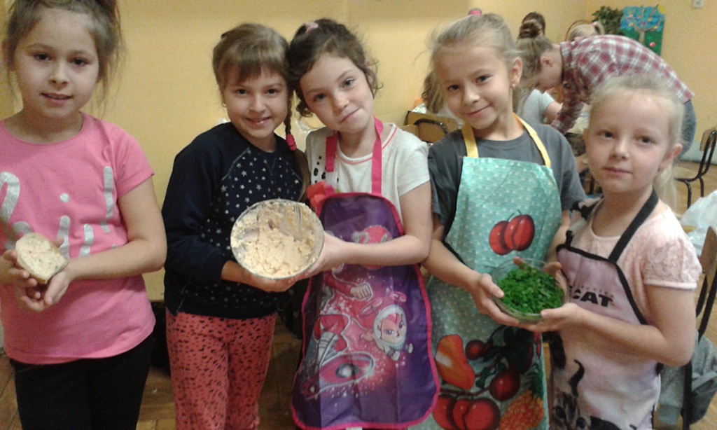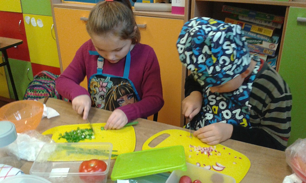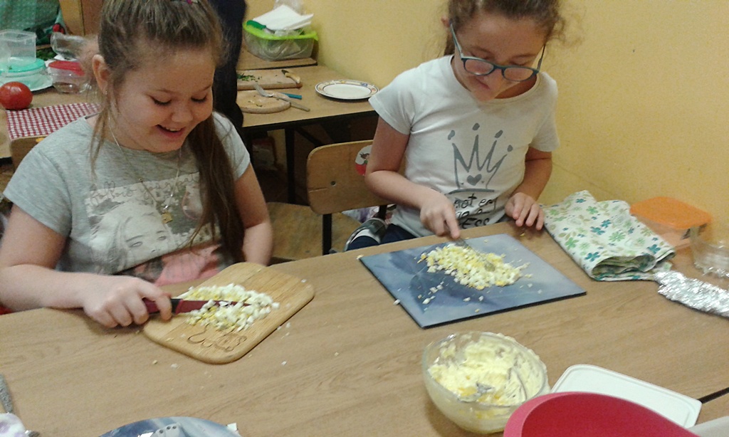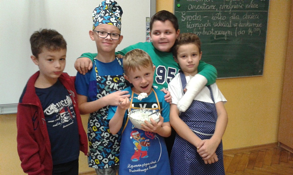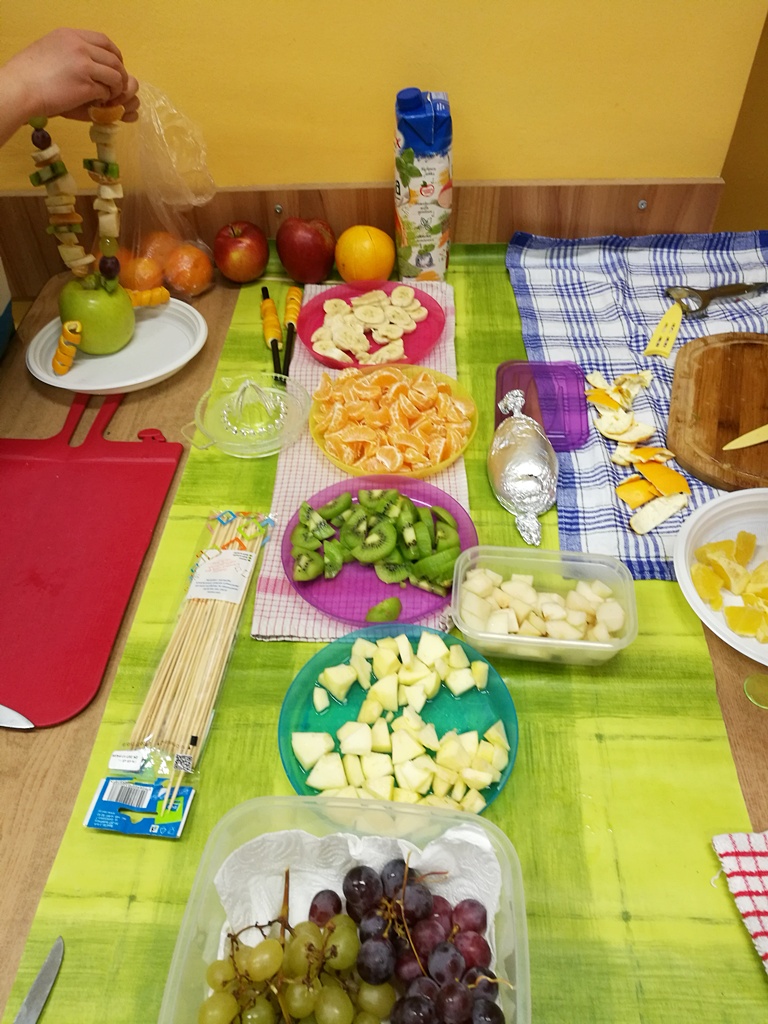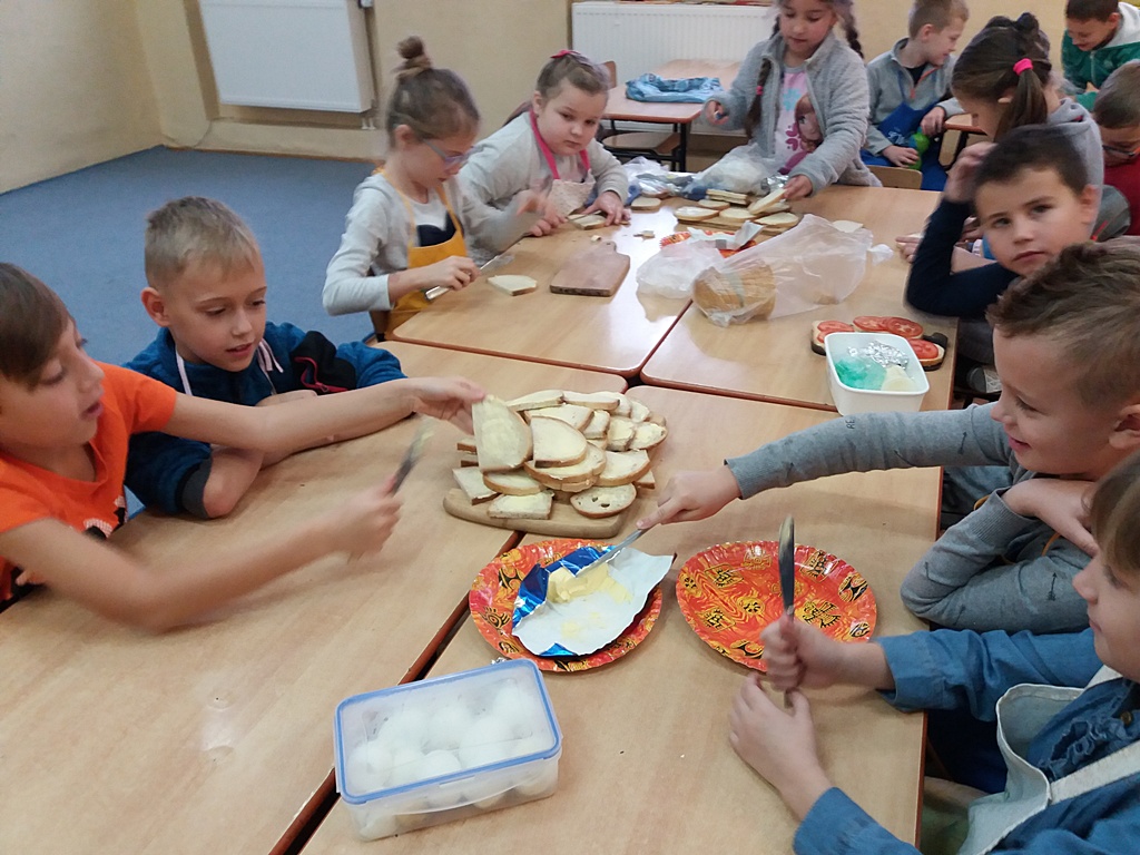 Z przyniesionych produktów dzieci klas I przygotowały wesołe kanapki , z klas II – kanapki i owocowe szaszłyki, zaś z klas III – sałatkę, kilka rodzajów past do chleba i szaszłyki z owoców. Wspólnie przygotowany i spożyty posiłek połączony był z przypomnieniem wszystkim 12 zasad zdrowego żywienia.