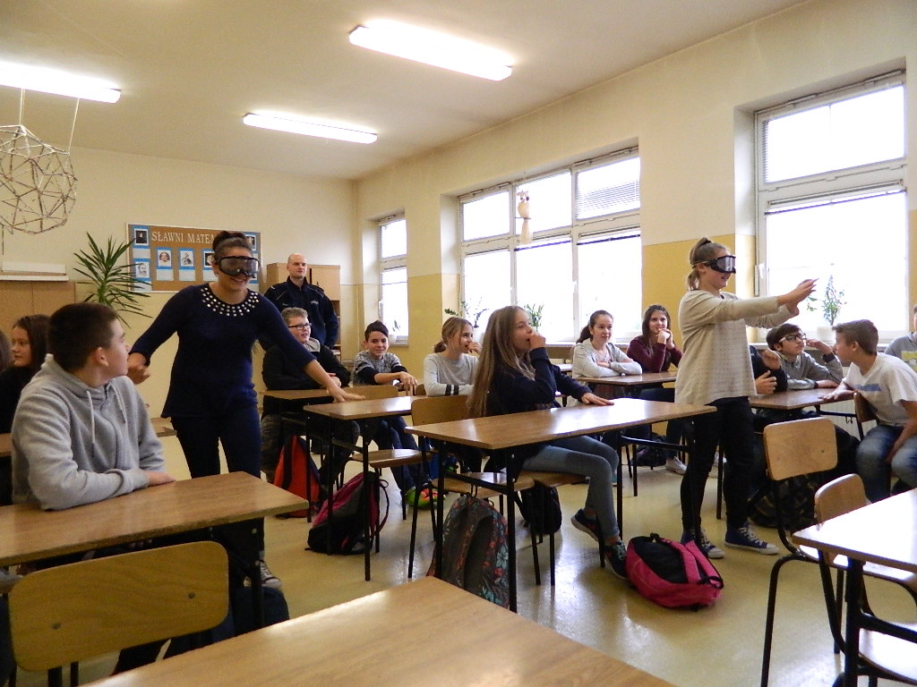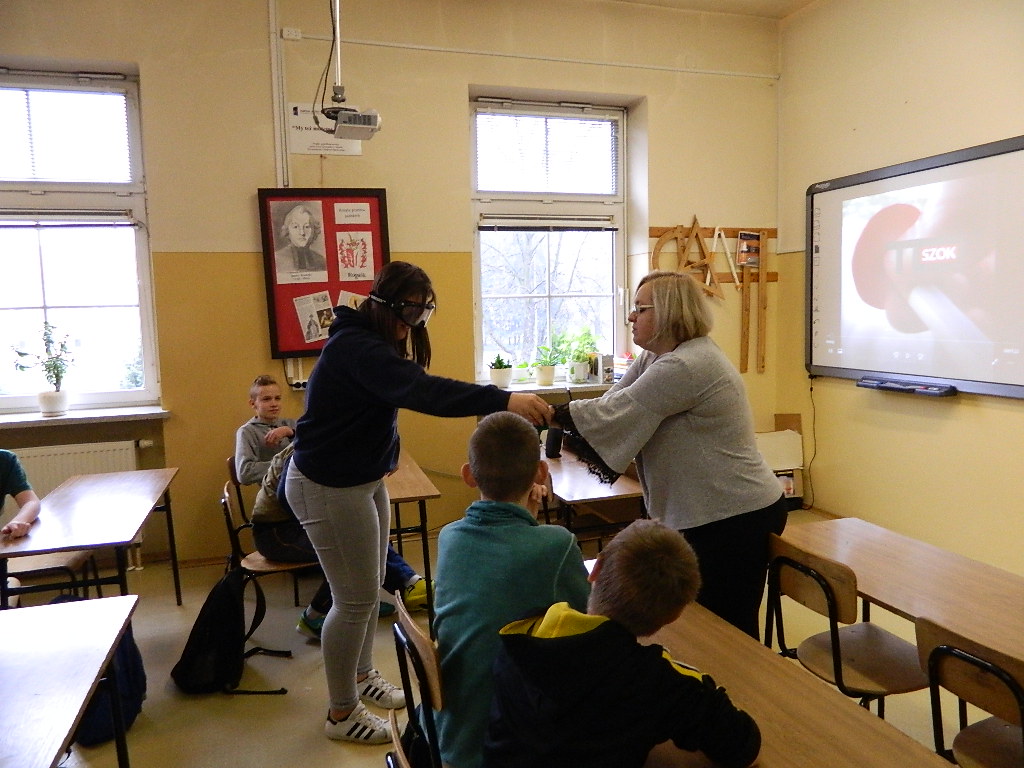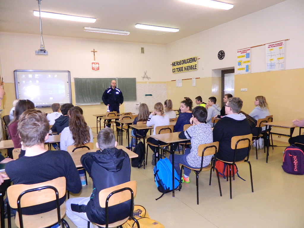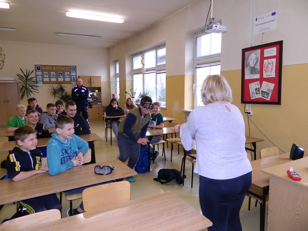 Pierwsza część zajęć dotyczyła odpowiedzialności prawnej młodzieży związanej z przedwczesnym sięganiem po środki odurzające. Przeprowadził ją Dzielnicowy Miasta Radymno sierż. Mateusz Szynal. Druga część zajęć profilaktycznych pokazywała uczniom konsekwencje wynikające z zażywania substancji psychoaktywnych. Pani Renata Majkut – Lotycz zajmującą się w PSSE promocją zdrowia omówiła w ciekawy sposób skutki czynnego i biernego palenia podkreślając trudny proces wychodzenia z uzależnienia. W celu lepszego zrozumienia i zobrazowania poruszanych tematów młodzież miała możliwość założenia narkogogli i alkogogli- specjalnych okularów, które sprawiają, że świat wygląda podobnie jak po wypiciu alkoholu lub po spożyciu narkotyków. Było przy tym sporo śmiechu. Okazało się, że założenie alkogogli i narkogogli skutkuje podwójnym widzeniem, spowolnieniem czasu reakcji, problemem z ustaleniem odległości, myleniem kierunków, pogorszeniem koordynacji ruchowej, zniekształceniem widzianego obrazu, zniekształceniem widzenia kolorów. Ćwiczenia te uświadamiały uczniom jak trudno wykonywać zwykłe czynności po spożyciu alkoholu, dopalaczy, czy narkotyków i uzmysławiały, że można zrobić sobie lub innym ludziom krzywdę. Ponadto młodzież miała możliwość zapoznania się smokolajzerem – aparatem, który stwierdza zawartość tlenku węgla w wydychanym powietrzu u palaczy. Warto podkreślić, że nie trzeba być aktywnym palaczem, żeby doświadczyć skutków jak nałogowy palacz.