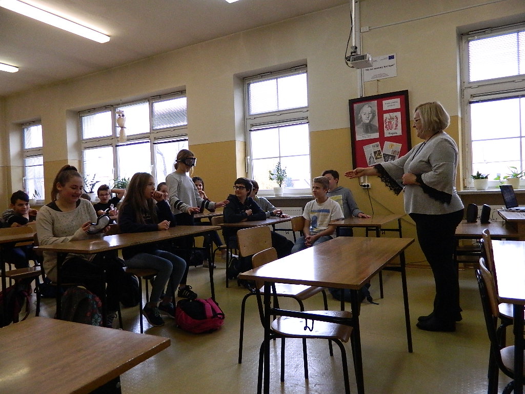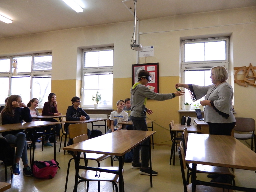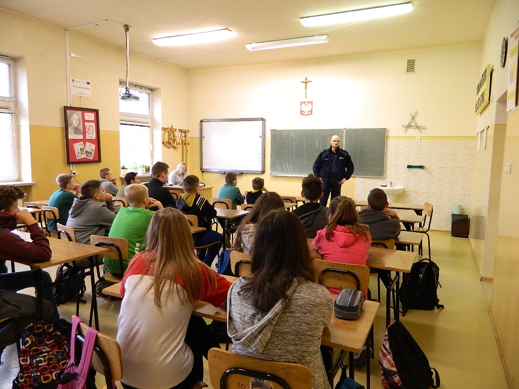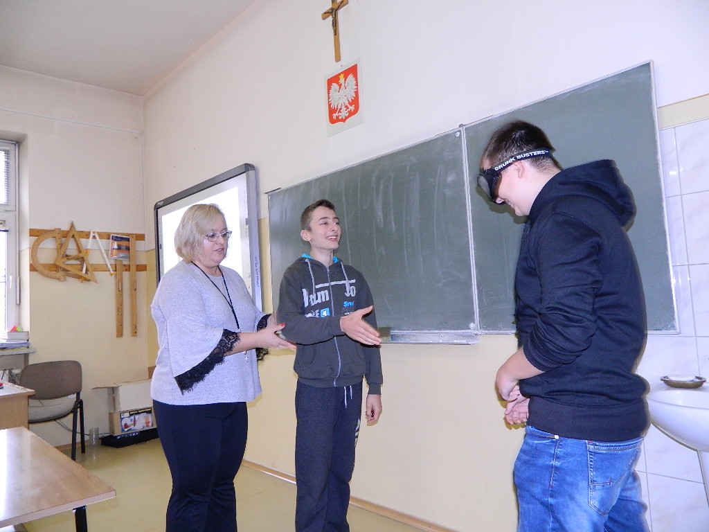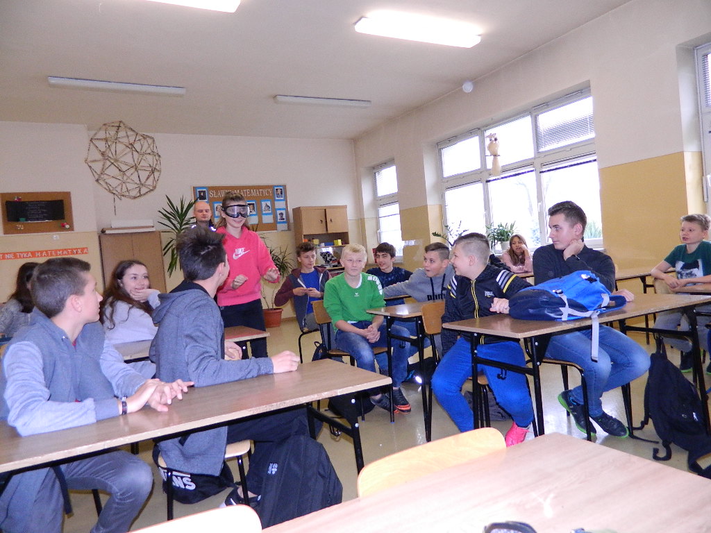 Pierwsza część zajęć dotyczyła odpowiedzialności prawnej młodzieży związanej z przedwczesnym sięganiem po środki odurzające. Przeprowadził ją Dzielnicowy Miasta Radymno sierż. Mateusz Szynal. Druga część zajęć profilaktycznych pokazywała uczniom konsekwencje wynikające z zażywania substancji psychoaktywnych. Pani Renata Majkut – Lotycz zajmującą się w PSSE promocją zdrowia omówiła w ciekawy sposób skutki czynnego i biernego palenia podkreślając trudny proces wychodzenia z uzależnienia. W celu lepszego zrozumienia i zobrazowania poruszanych tematów młodzież miała możliwość założenia narkogogli i alkogogli- specjalnych okularów, które sprawiają, że świat wygląda podobnie jak po wypiciu alkoholu lub po spożyciu narkotyków. Było przy tym sporo śmiechu. Okazało się, że założenie alkogogli i narkogogli skutkuje podwójnym widzeniem, spowolnieniem czasu reakcji, problemem z ustaleniem odległości, myleniem kierunków, pogorszeniem koordynacji ruchowej, zniekształceniem widzianego obrazu, zniekształceniem widzenia kolorów. Ćwiczenia te uświadamiały uczniom jak trudno wykonywać zwykłe czynności po spożyciu alkoholu, dopalaczy, czy narkotyków i uzmysławiały, że można zrobić sobie lub innym ludziom krzywdę. Ponadto młodzież miała możliwość zapoznania się smokolajzerem – aparatem, który stwierdza zawartość tlenku węgla w wydychanym powietrzu u palaczy. Warto podkreślić, że nie trzeba być aktywnym palaczem, żeby doświadczyć skutków jak nałogowy palacz.