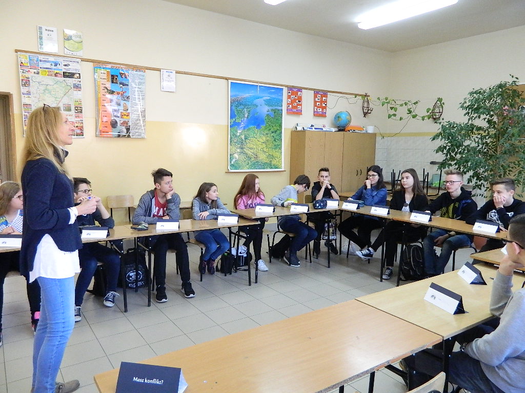 z zakresu mediacji. Uczniowie poznawali zasady oraz proces rozwiązywania sporu lub konfliktu drogą mediacji, którego celem jest osiągnięcie porozumienia bez przemocy. Młodzieży została przybliżona idea mediacji rówieśniczych, będących metodą rozwiązywania konfliktów wśród dzieci i młodzieży na terenie szkoły w obecności mediatora rówieśnika. W trakcie warsztatów mocno akcentowano fakt, że mediacje są dobrowolne, poufne i nieformalne a mediator jest bezstronny. Osoba mediatora pomaga w konflikcie rozważyć wszelkie możliwe rozwiązania oraz szukać takiego porozumienia, które będzie satysfakcjonujące dla obydwu stron. Warsztaty służyły rozwojowi kompetencji komunikacyjnych