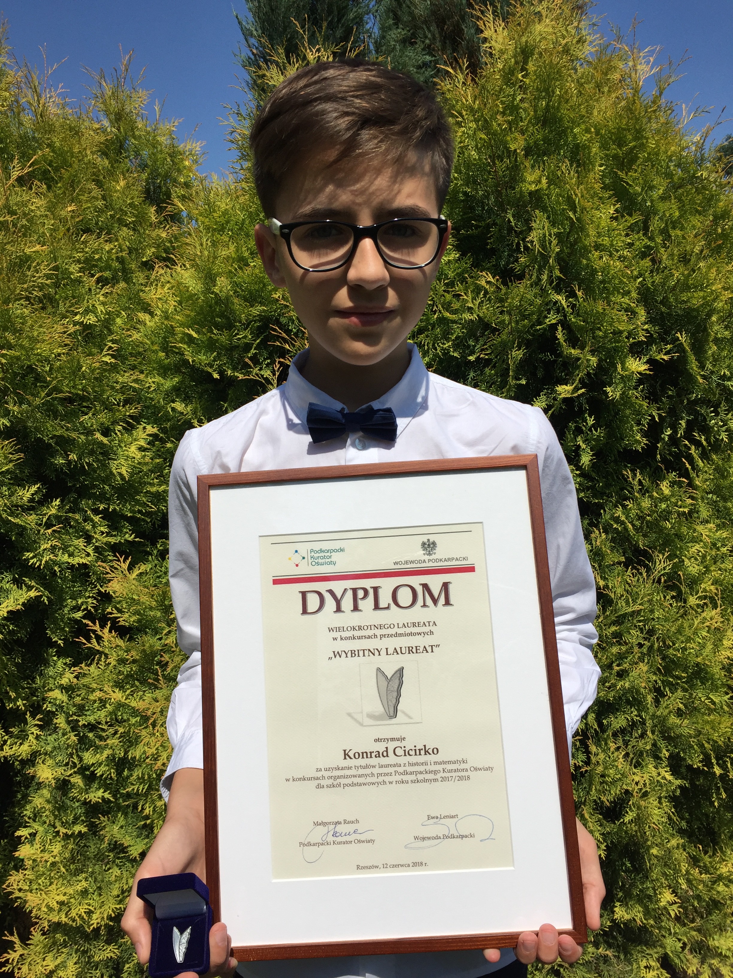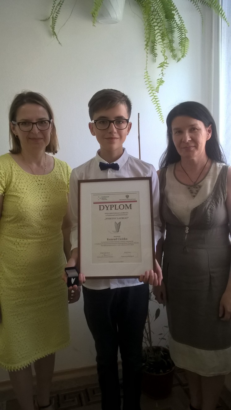 We wtorek 12 czerwca 2018 roku w Instytucie Teologiczno-Pastoralnym im. Św. J. S. Pelczara w Rzeszowie odbyła się Gala Laureatów Konkursów Przedmiotowych organizowanych przez Podkarpackiego Kuratora Oświaty w roku szkolnym 2017/2018. Został na nią zaproszony Konrad Cicirko – uczeń klasy 7a wraz z opiekunami naukowymi panią Anną Borówką – nauczycielką historii oraz panią Urszulą Tereszko – nauczycielką matematyki. Konrad Cicirko brał udział w Konkursie Przedmiotowym z Historii i z Matematyki i z obu otrzymał tytuł laureata. Za te osiągnięcia Pani Kurator Małgorzata Rauch uhonorowała Go tytułem” Wybitnego laureata” oraz wręczyła odznakę i dyplom. To wielki sukces naszego ucznia, nauczycieli i szkoły. Gratulujemy Konradowi i życzymy dalszych sukcesów!