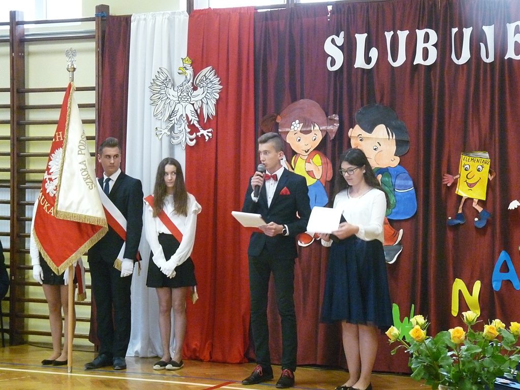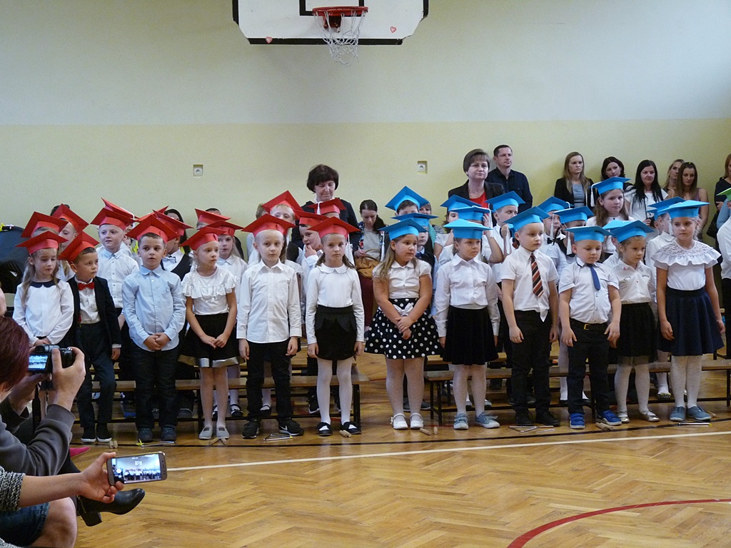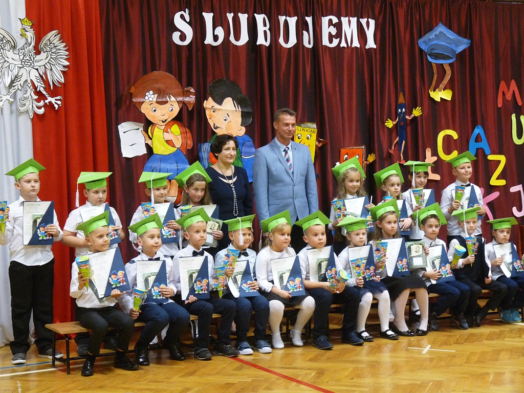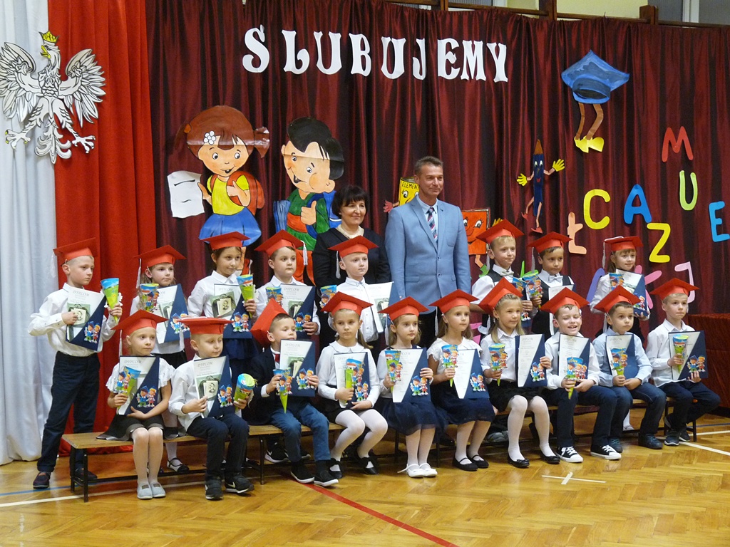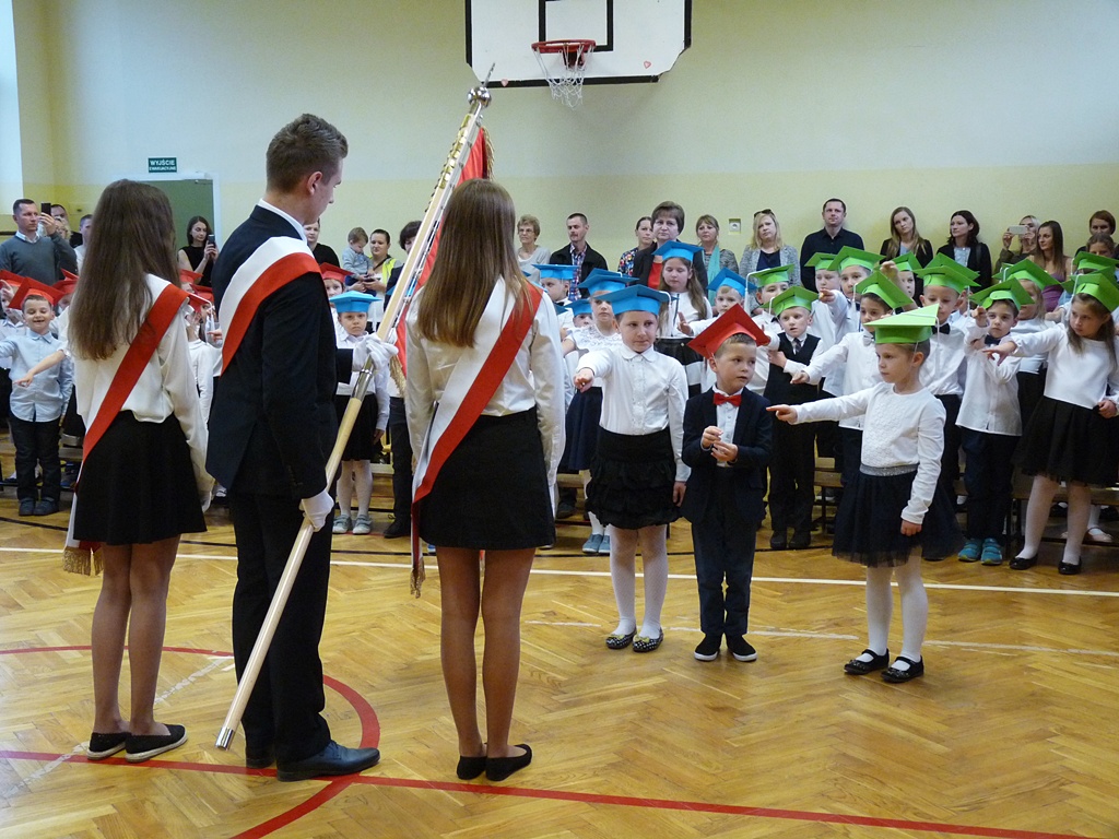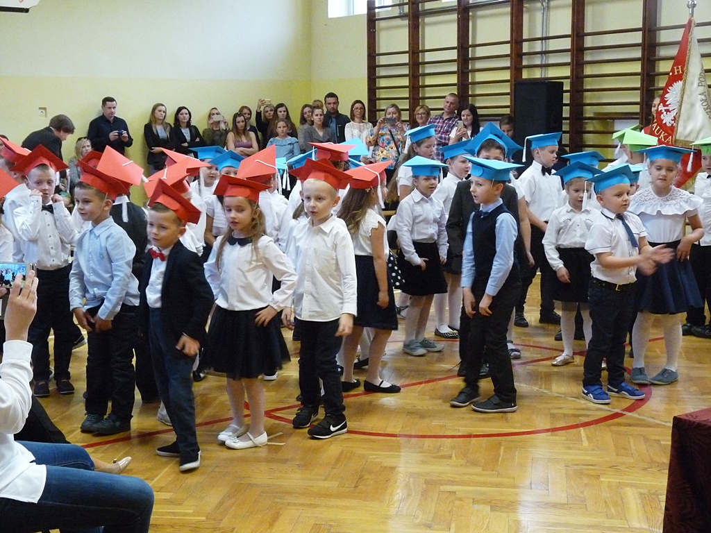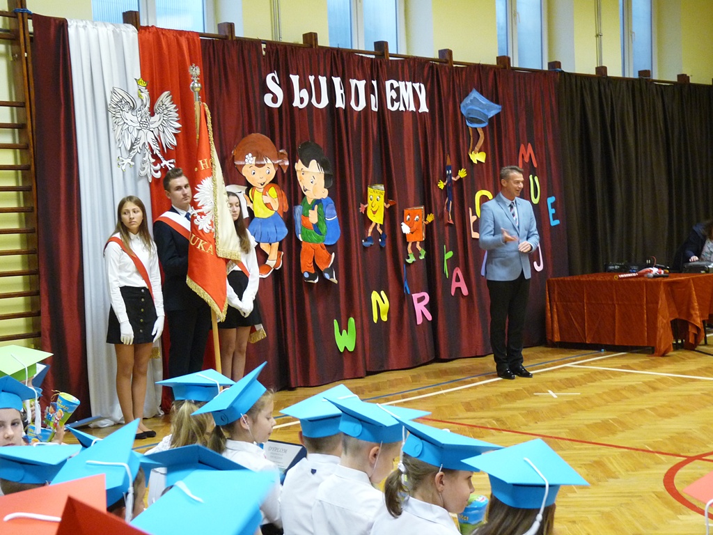 Uroczystość rozpoczęła się wejściem do sali gimnastycznej pierwszoklasistów w strojach galowych i kolorowych biretach. Następnie wprowadzony został sztandar szkoły i odśpiewany hymn narodowy. Dyrektor szkoły p. Paweł Kalisz powitał wszystkich przybyłych gości, a następnie oddał głos uczniom samorządu szkolnego, którzy poprowadzili część artystyczną. Pierwszoklasiści musieli wykazać się wiedzą, umiejętnościami artystycznymi i ruchowymi. Udowodnili, że potrafią śpiewać i recytować wiersze, rozwiązywać zagadki szkolne, udowodnili że kochają swoją Ojczyznę i wiedzą, co to jest kulturalne zachowanie. Pozytywny werdykt Pana Dyrektora umożliwił pierwszoklasistom przystąpienie do uroczystego ślubowania, następnie pasowania specjalnym ołówkiem. Nie zabrakło upominków ufundowanych przez Radę Rodziców, Dyrekcję i gości. Każda klasa zrobiła też sobie pamiątkowe zdjęcie z wychowawcą i dyrektorem szkoły.