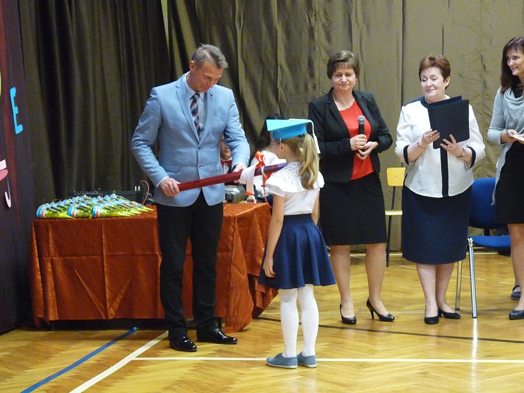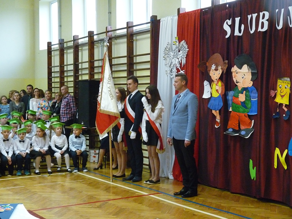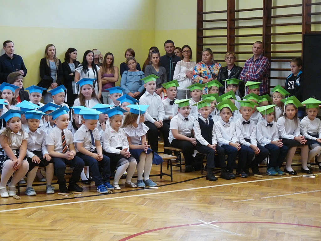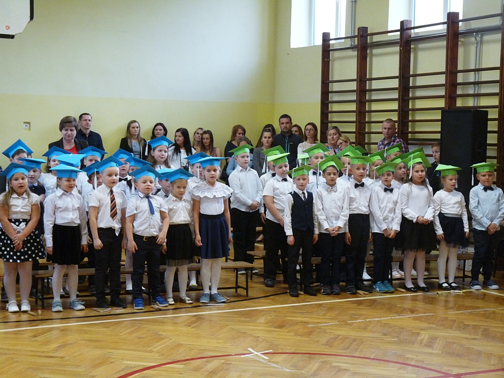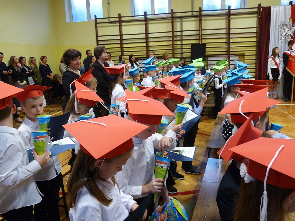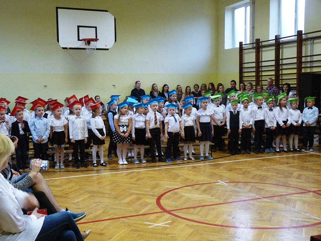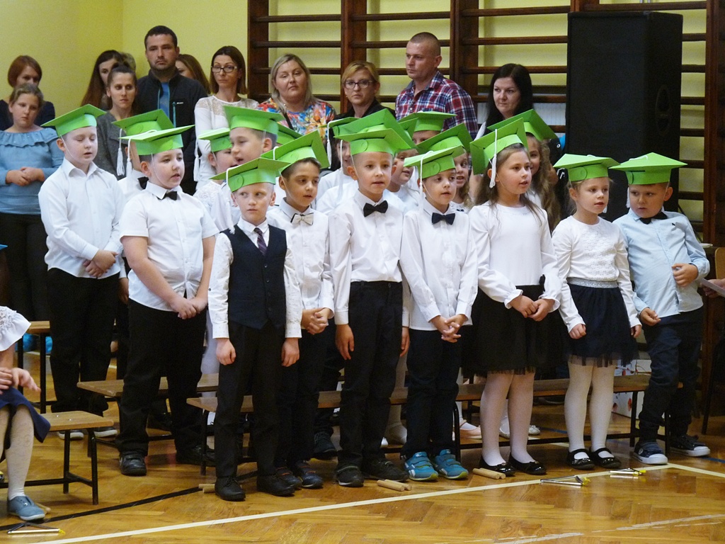 Uroczystość rozpoczęła się wejściem do sali gimnastycznej pierwszoklasistów w strojach galowych i kolorowych biretach. Następnie wprowadzony został sztandar szkoły i odśpiewany hymn narodowy. Dyrektor szkoły p. Paweł Kalisz powitał wszystkich przybyłych gości, a następnie oddał głos uczniom samorządu szkolnego, którzy poprowadzili część artystyczną. Pierwszoklasiści musieli wykazać się wiedzą, umiejętnościami artystycznymi i ruchowymi. Udowodnili, że potrafią śpiewać i recytować wiersze, rozwiązywać zagadki szkolne, udowodnili że kochają swoją Ojczyznę i wiedzą, co to jest kulturalne zachowanie. Pozytywny werdykt Pana Dyrektora umożliwił pierwszoklasistom przystąpienie do uroczystego ślubowania, następnie pasowania specjalnym ołówkiem. Nie zabrakło upominków ufundowanych przez Radę Rodziców, Dyrekcję i gości. Każda klasa zrobiła też sobie pamiątkowe zdjęcie z wychowawcą i dyrektorem szkoły.