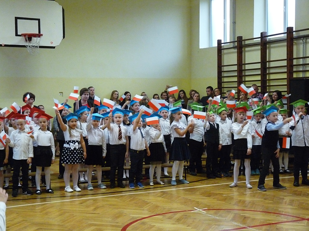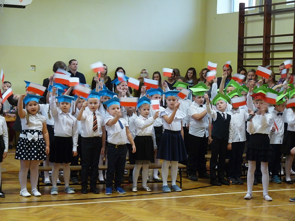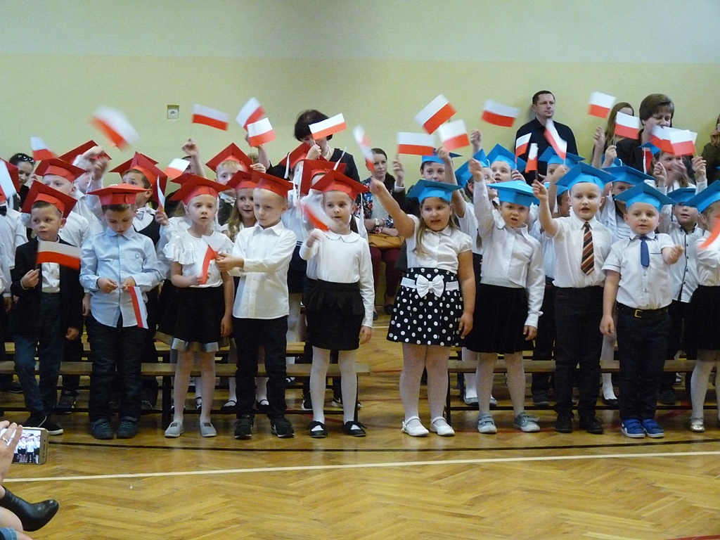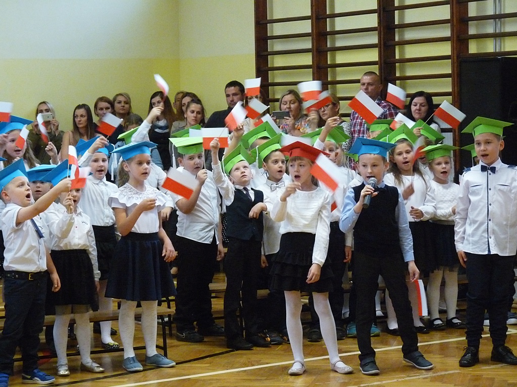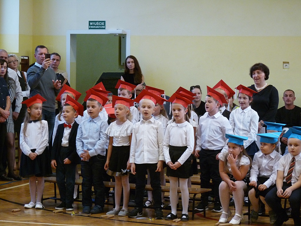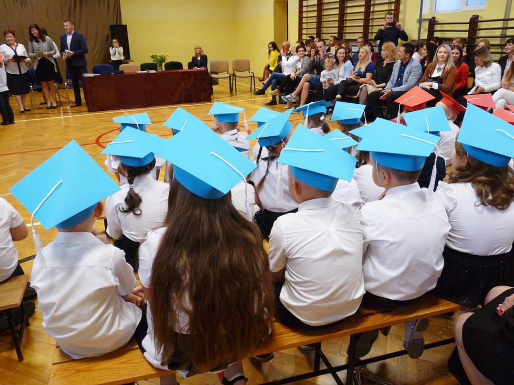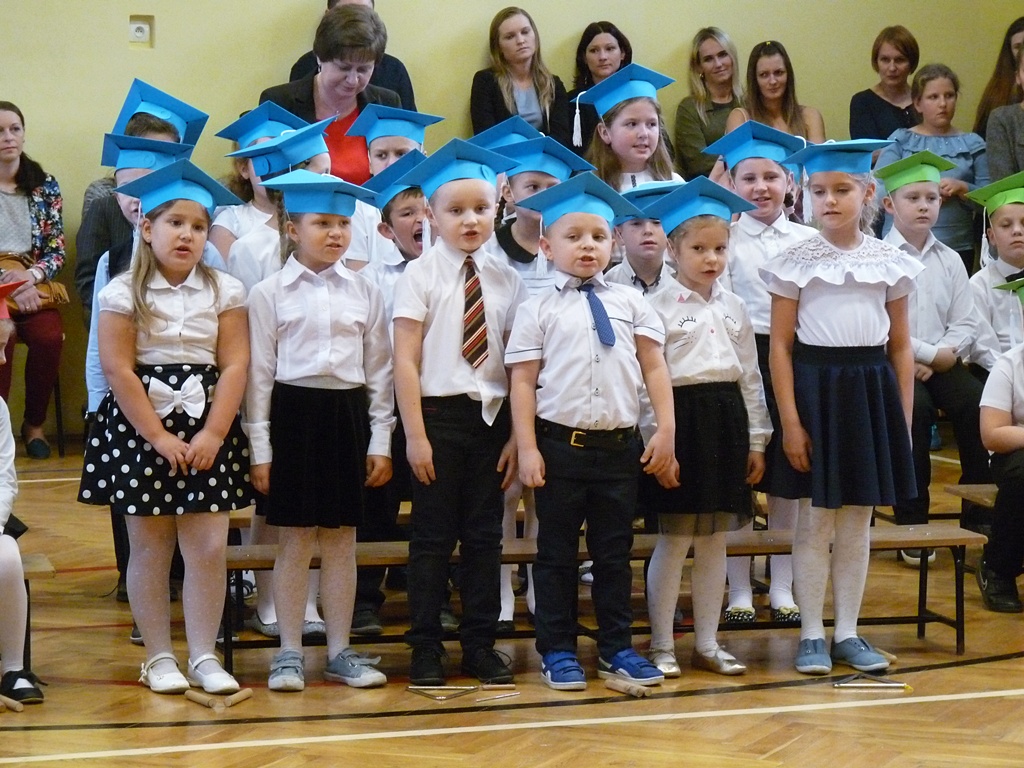 Uroczystość rozpoczęła się wejściem do sali gimnastycznej pierwszoklasistów w strojach galowych i kolorowych biretach. Następnie wprowadzony został sztandar szkoły i odśpiewany hymn narodowy. Dyrektor szkoły p. Paweł Kalisz powitał wszystkich przybyłych gości, a następnie oddał głos uczniom samorządu szkolnego, którzy poprowadzili część artystyczną. Pierwszoklasiści musieli wykazać się wiedzą, umiejętnościami artystycznymi i ruchowymi. Udowodnili, że potrafią śpiewać i recytować wiersze, rozwiązywać zagadki szkolne, udowodnili że kochają swoją Ojczyznę i wiedzą, co to jest kulturalne zachowanie. Pozytywny werdykt Pana Dyrektora umożliwił pierwszoklasistom przystąpienie do uroczystego ślubowania, następnie pasowania specjalnym ołówkiem. Nie zabrakło upominków ufundowanych przez Radę Rodziców, Dyrekcję i gości. Każda klasa zrobiła też sobie pamiątkowe zdjęcie z wychowawcą i dyrektorem szkoły.