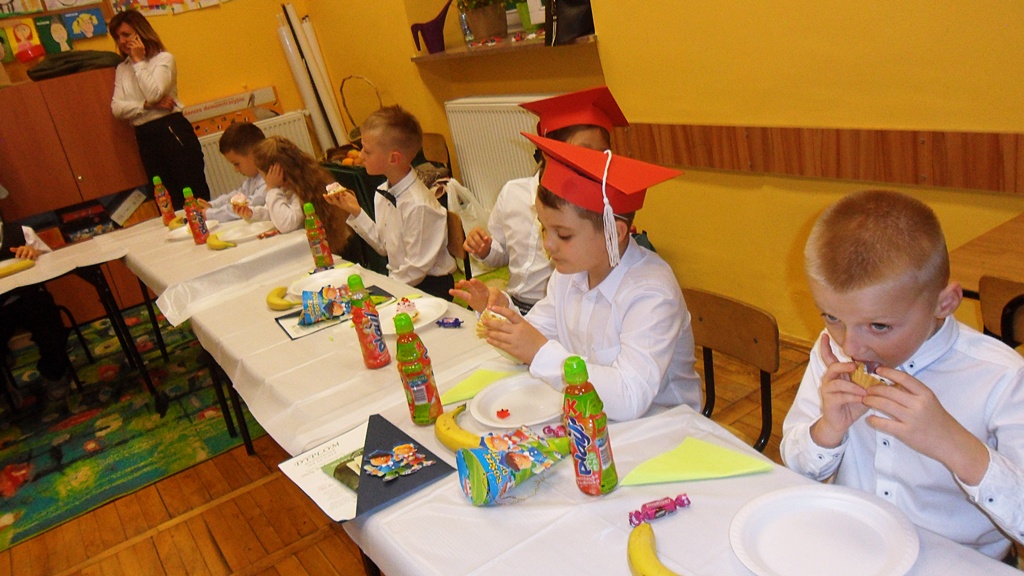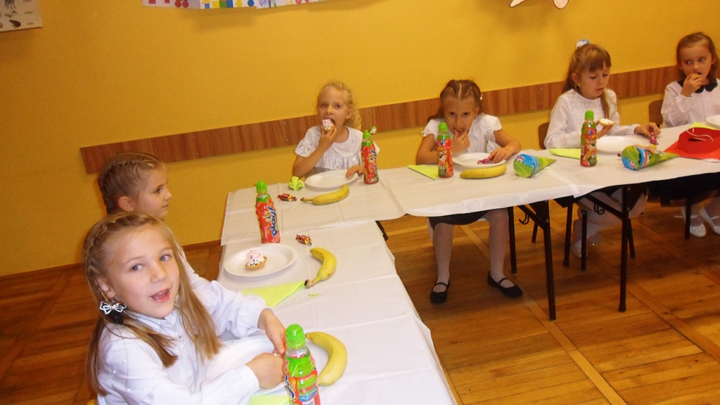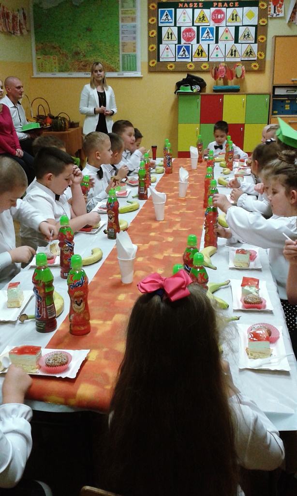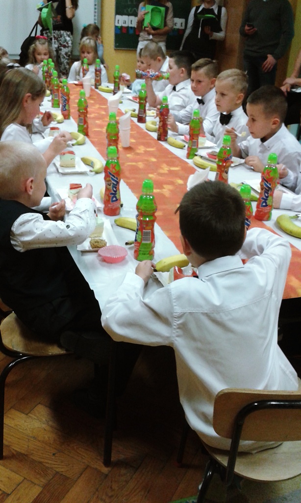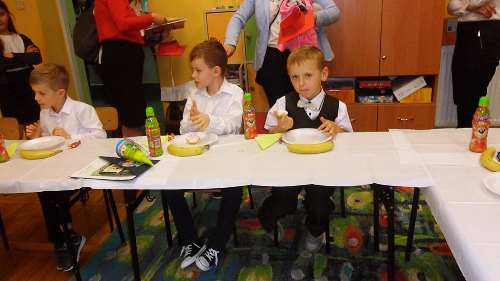 Dyrekcja szkoły i zaproszeni goście pogratulowali pierwszoklasistom występu i życzyli wielu sukcesów w nauce i zachowaniu. Na zakończenie uczniowie udali się do swoich sal, gdzie czekał na nich słodki poczęstunek przygotowany przez rodziców.