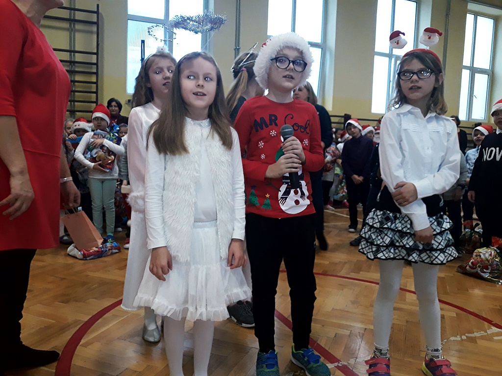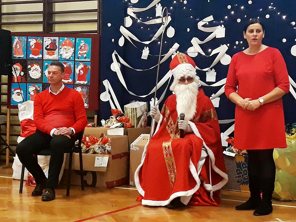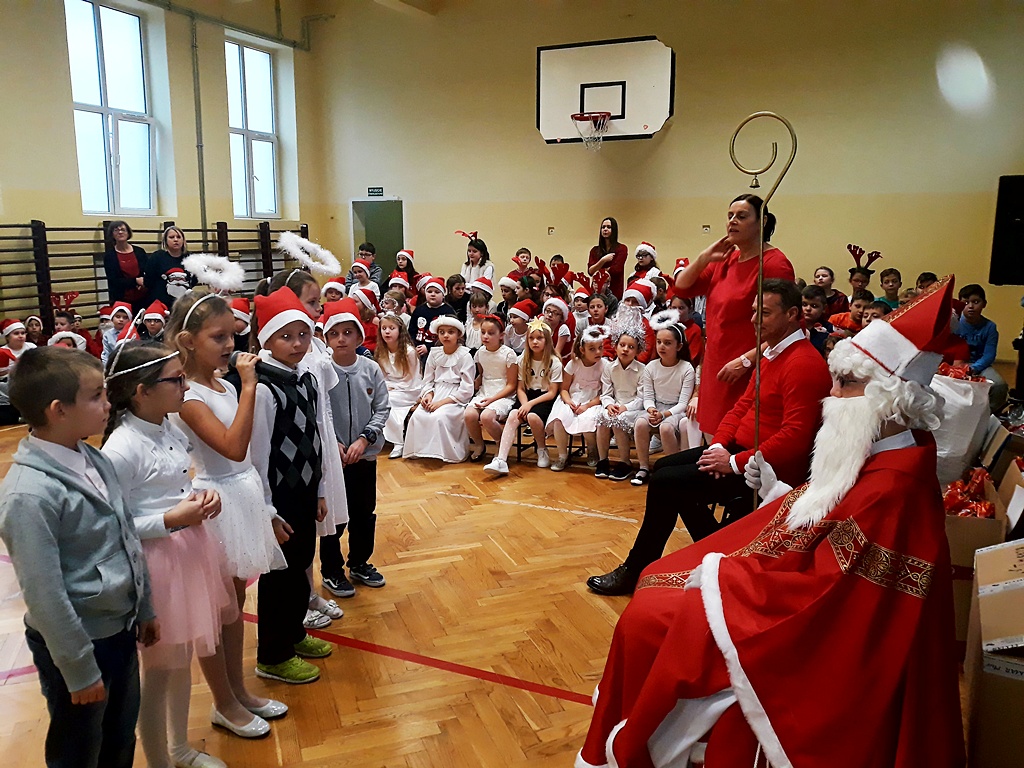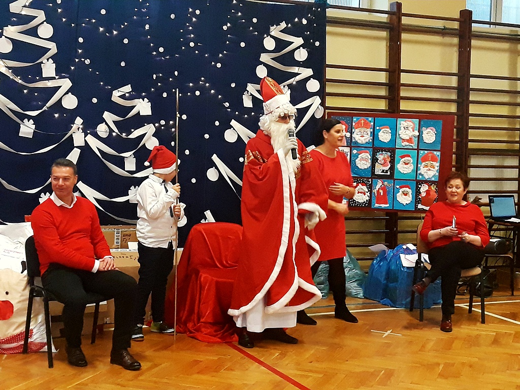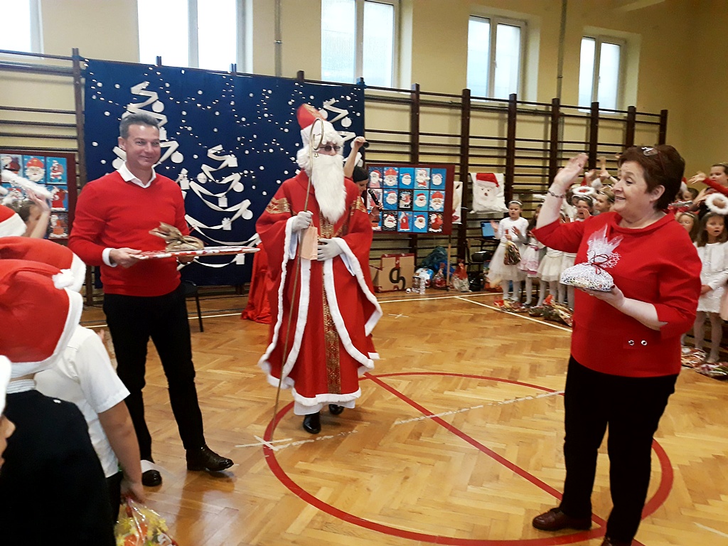 Pomimo braku białego puchu pojawił się 6 grudnia w naszej szkole ten długo oczekiwany gość – Święty Mikołaj. Został przywitany wierszem, tańcem i piosenką. Na twarzach dzieci widać było wielkie wzruszenie i zadowolenie. Po występach wszyscy z pewną niecierpliwością oczekiwali na prezenty. Nikt nie został pominięty, Święty Mikołaj pamiętał o wszystkich. Po otrzymaniu prezentów rozpoczęło się gorączkowe sprawdzanie ich zawartości. Po uśmiechniętych buziach można było się domyślać, że Święty Mikołaj trafił z podarunkami.