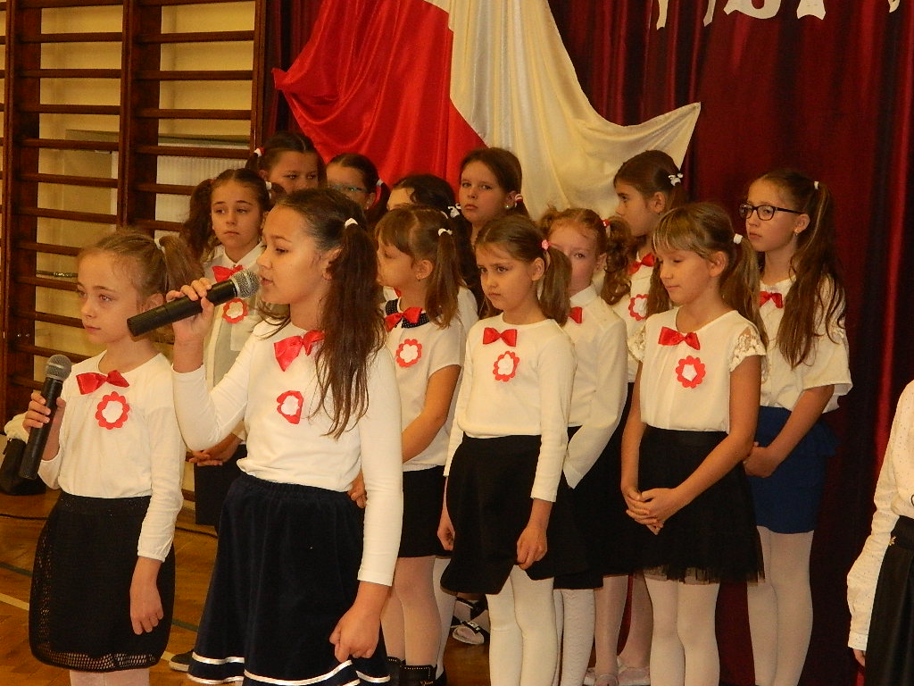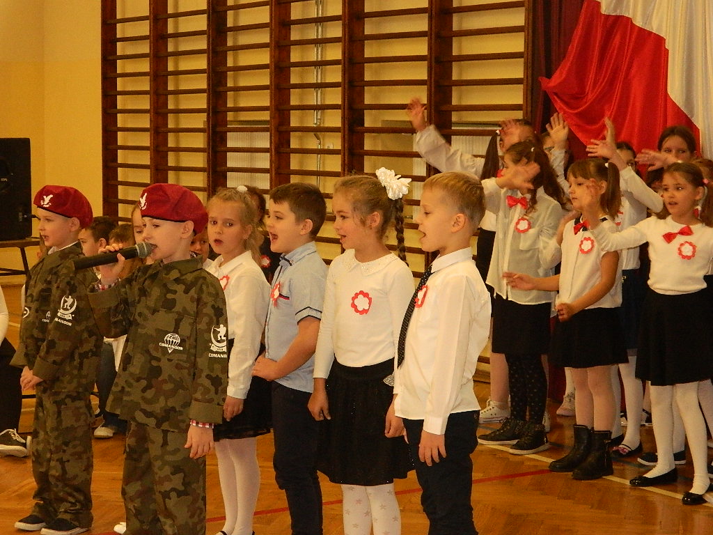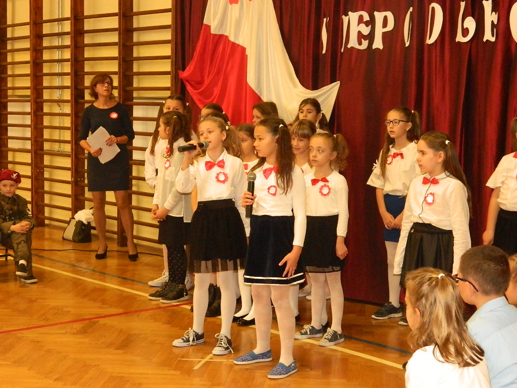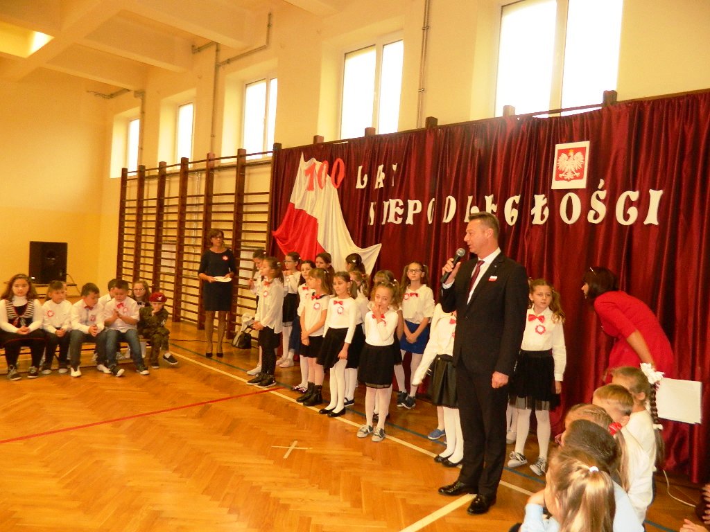 W piątek 9 listopada 2018 r. w szkole przy ul. Mickiewicza 4 odbyła się uroczysta akademia dla uczczenia 100-tnej rocznicy odzyskania przez Polskę Niepodległości. W tym wyjątkowym dniu cała społeczność szkolna odświętnie ubrana zgromadziła się na uroczystości przygotowanej przez uczniów klas III. Cała akademia miała wyjątkowo podniosły charakter. Otworzył ją dyrektor szkoły p. Paweł Kalisz, który swoim przemówieniem przypominał uczniom historię drogi Polaków do Niepodległości a zarazem budził w najmłodszych ducha patriotyzmu. Następnie cała społeczność szkolna odśpiewała hymn narodowy.