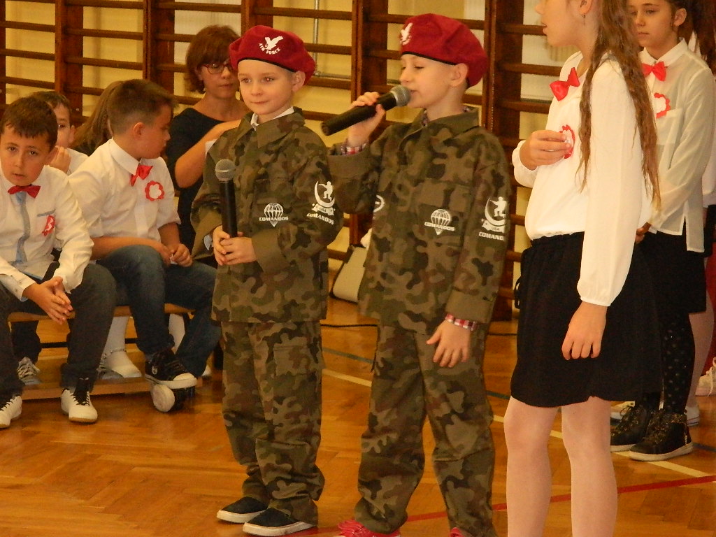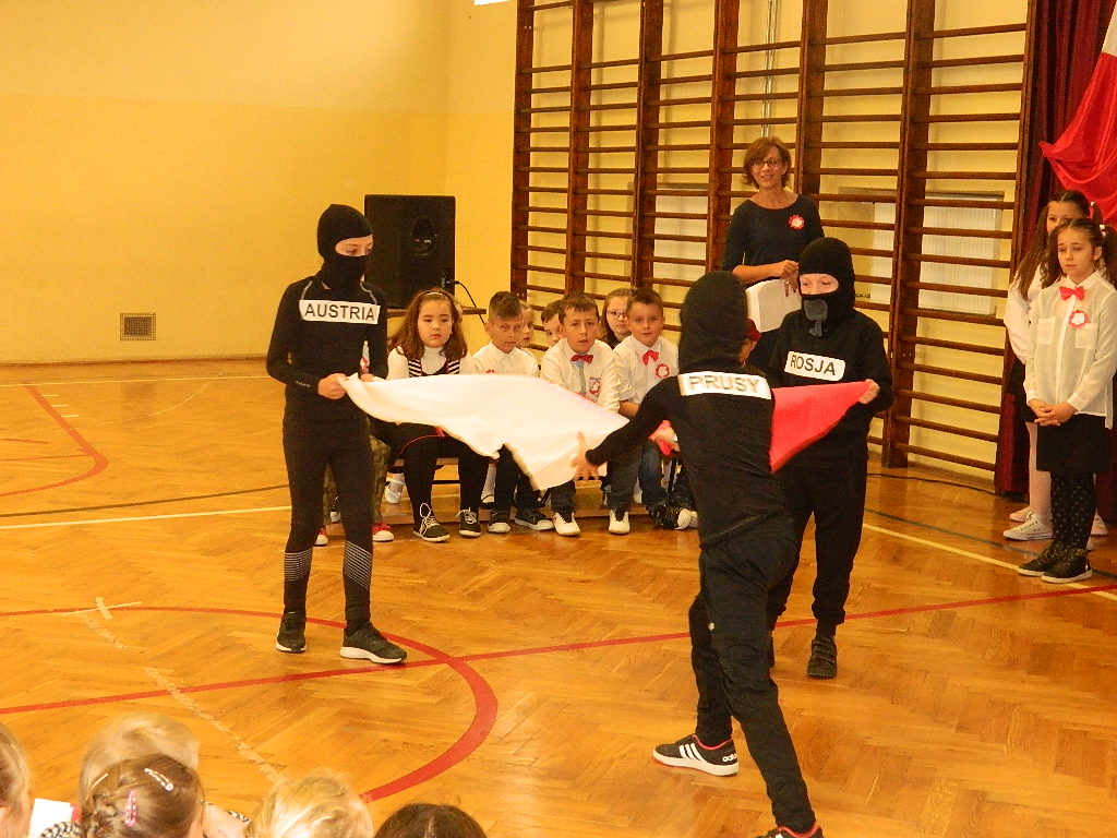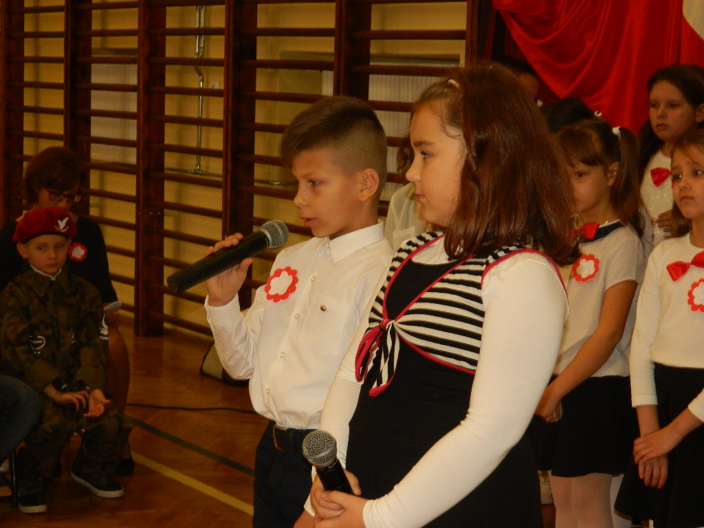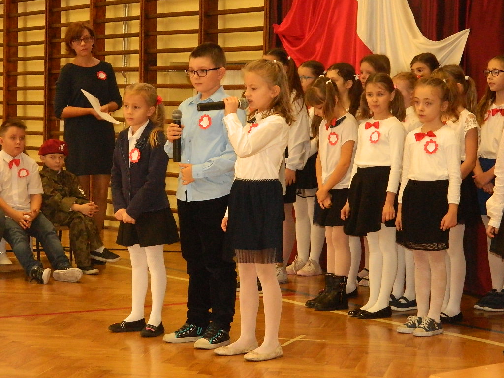 W piątek 9 listopada 2018 r. w szkole przy ul. Mickiewicza 4 odbyła się uroczysta akademia dla uczczenia 100-tnej rocznicy odzyskania przez Polskę Niepodległości. W tym wyjątkowym dniu cała społeczność szkolna odświętnie ubrana zgromadziła się na uroczystości przygotowanej przez uczniów klas III. Cała akademia miała wyjątkowo podniosły charakter. Otworzył ją dyrektor szkoły p. Paweł Kalisz, który swoim przemówieniem przypominał uczniom historię drogi Polaków do Niepodległości a zarazem budził w najmłodszych ducha patriotyzmu. Następnie cała społeczność szkolna odśpiewała hymn narodowy.