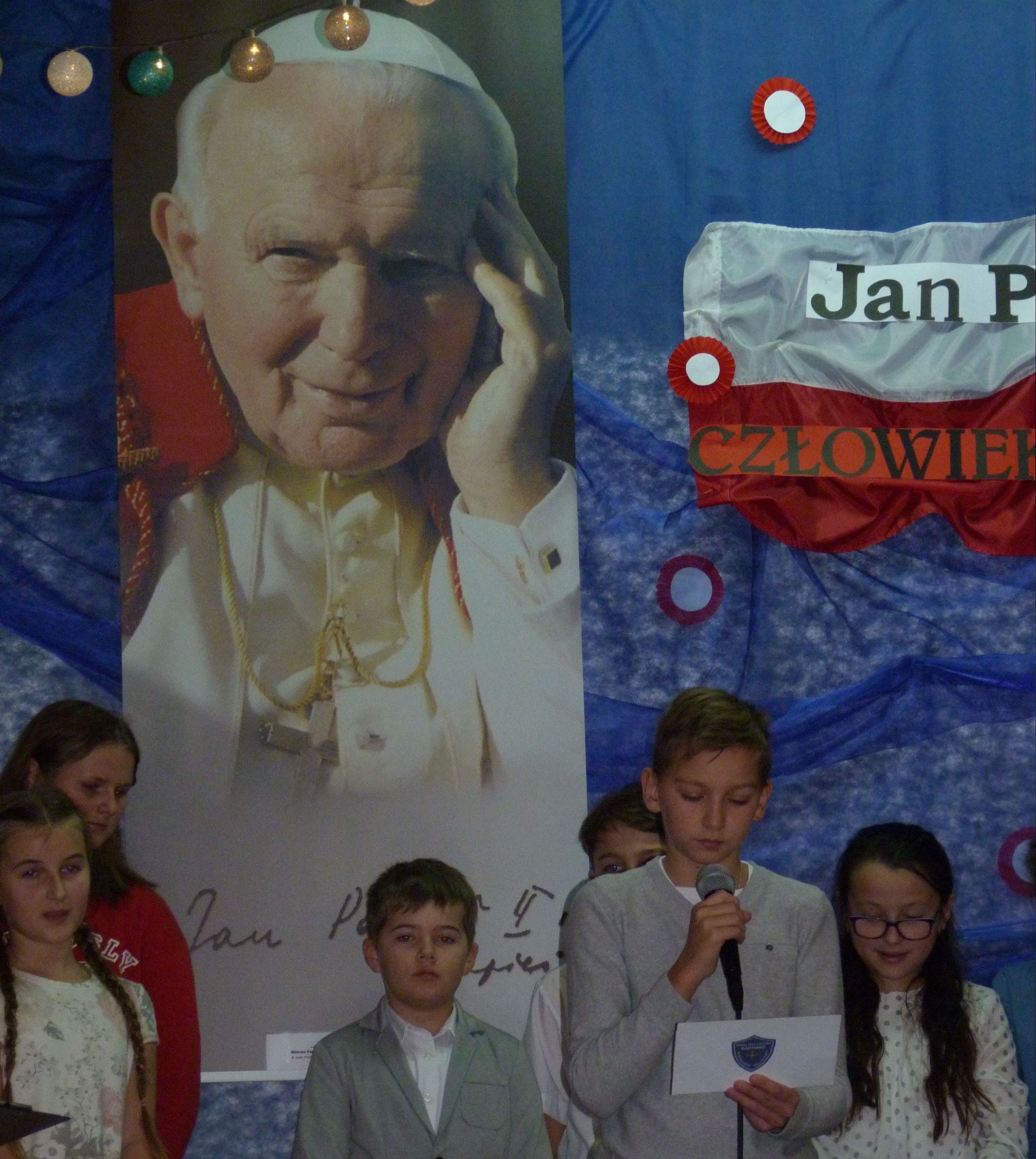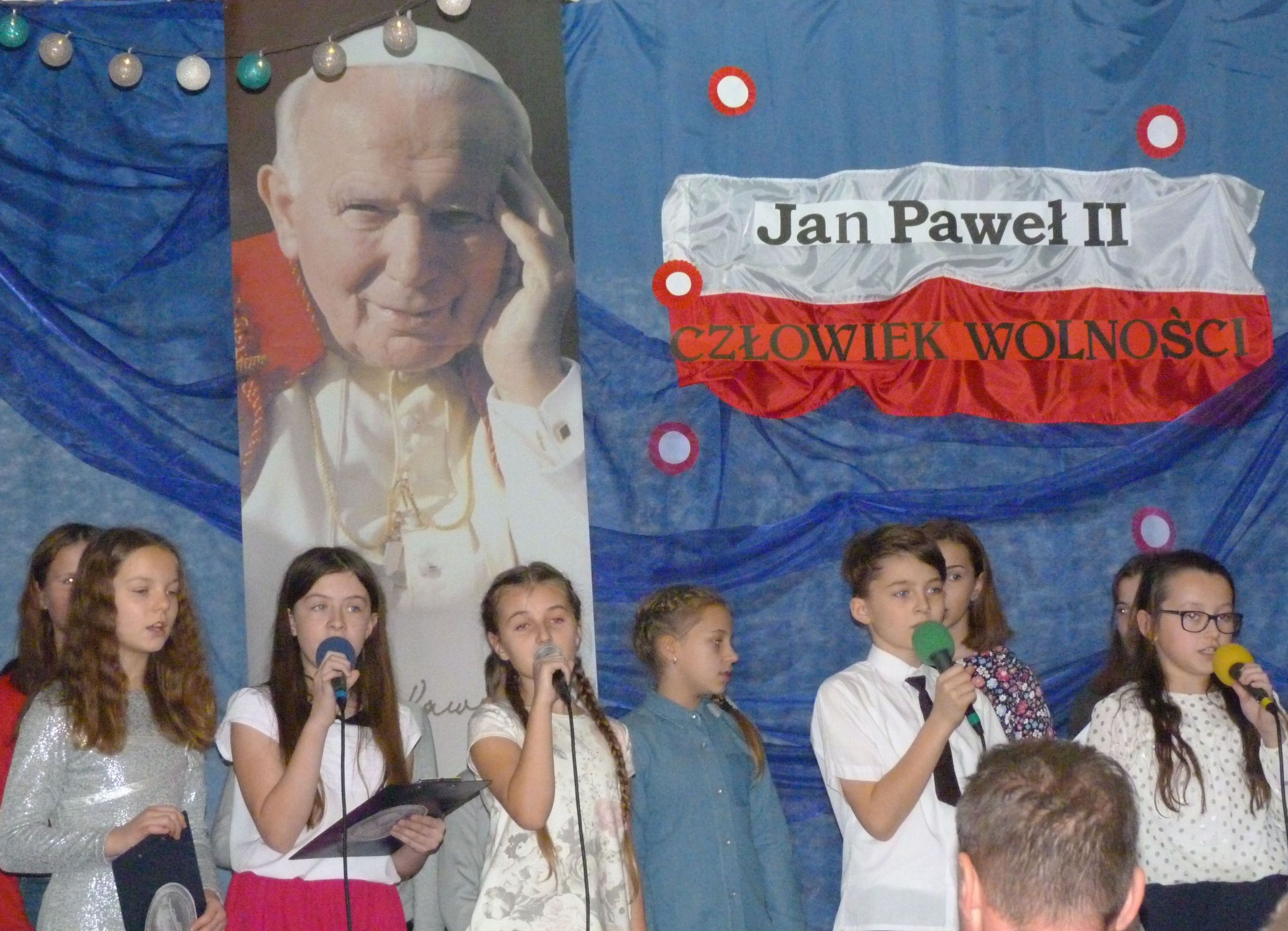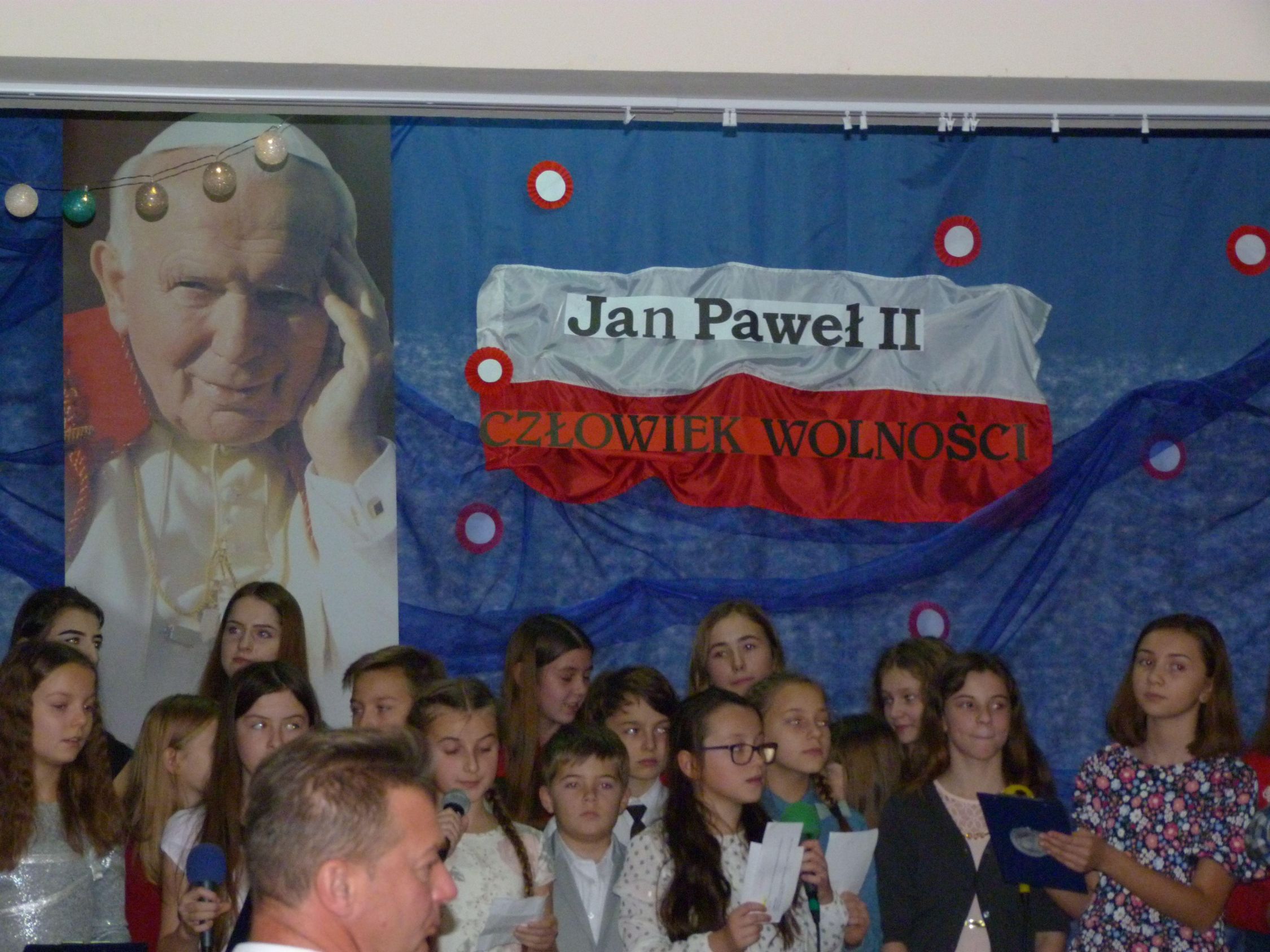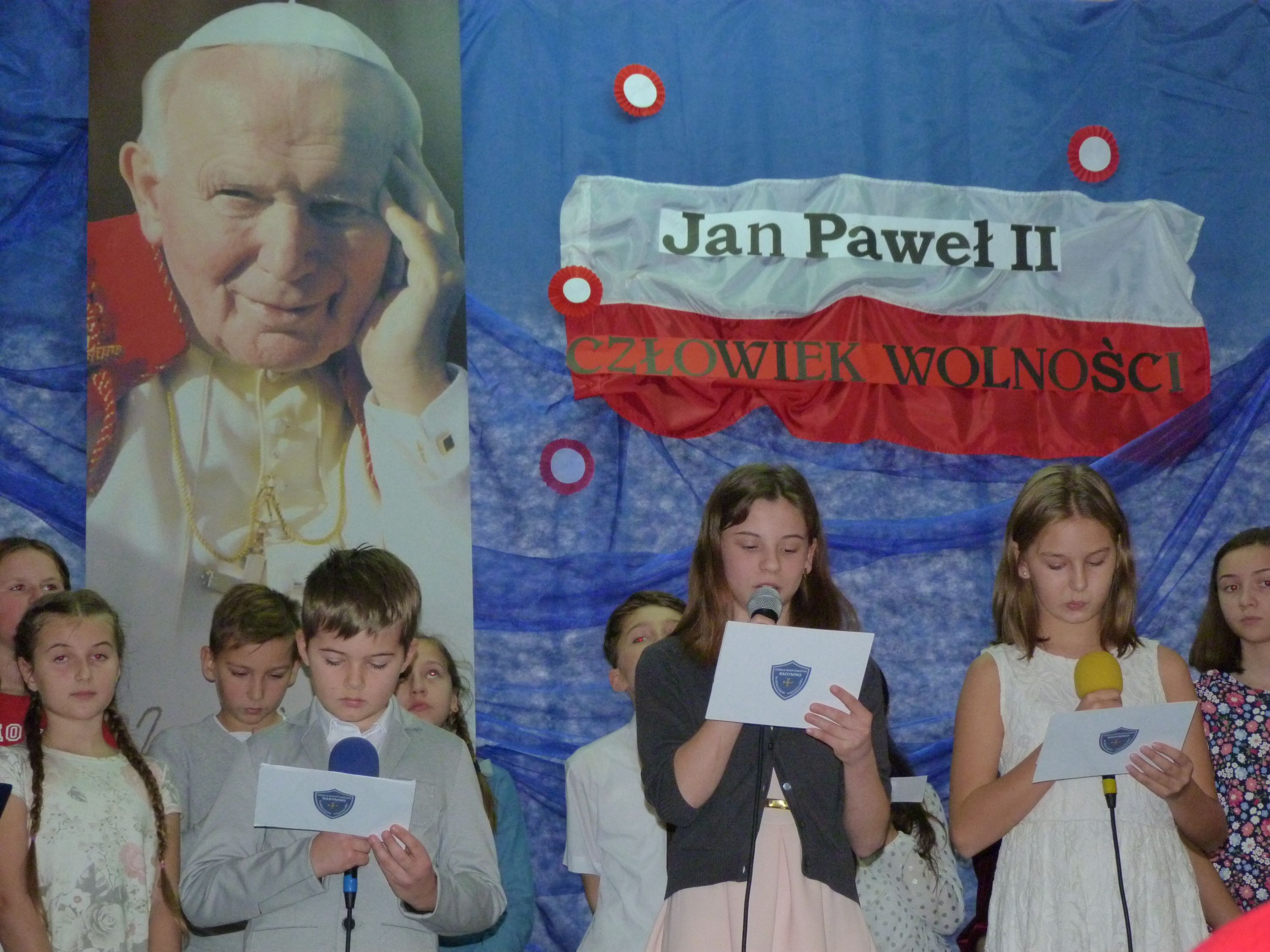 Ten niezwykły dzień uczniowie naszej szkoły świętowali ze Świętym Janem Pawłem II. Na początku słowo o papieżu – rodaku wygłosił dyrektor szkoły Pan Paweł Kalisz. Powiedział między innymi o niezwykłej osobowości i ogromnych zasługach Jana Pawła dla naszego kraju i całego świata. Następnie głos zabrała młodzież, która wspomnieniem, wierszem i piosenką uczciła tego wielkiego człowieka. Program artystyczny przygotowany przez koło teatralne (kl.5a,b) pod tytułem „Jan Paweł II CZŁOWIEK WOLNOŚCI” przypomniał ważne czyny i słowa papieża związane z walką o niepodległość, z umiłowaniem Ojczyzny i obowiązkiem z racji bycia Polakiem.