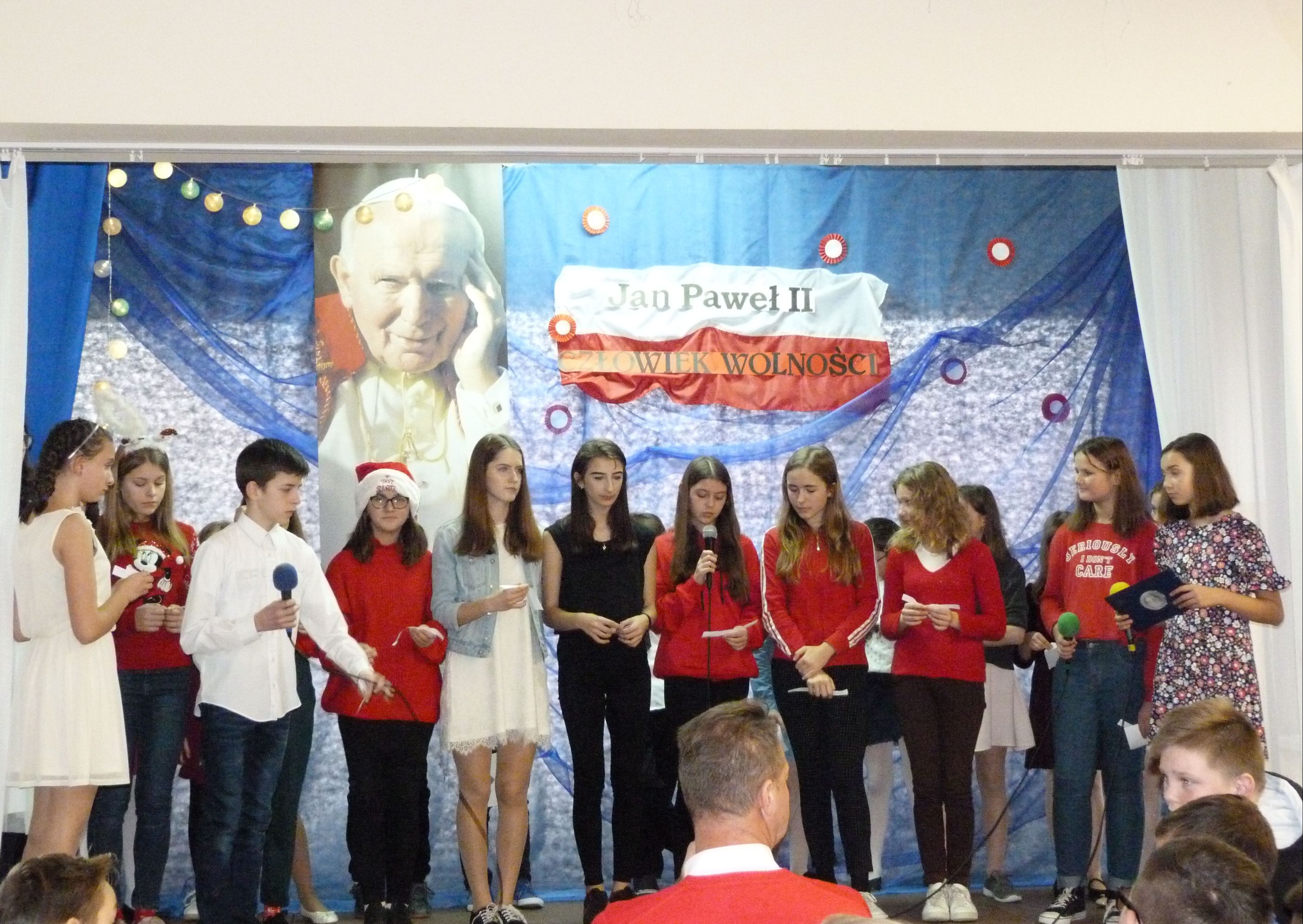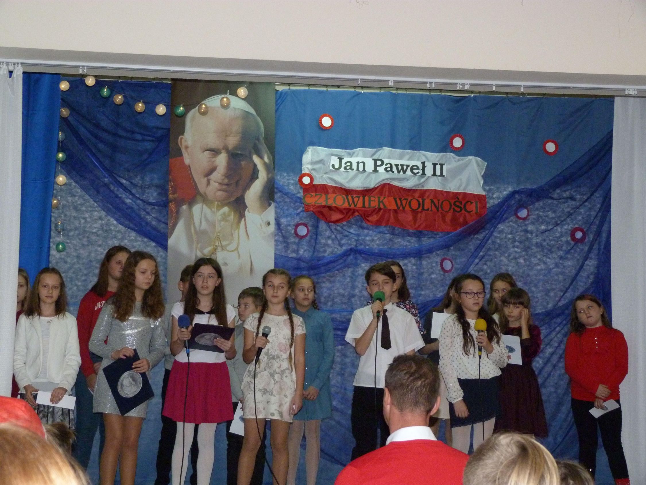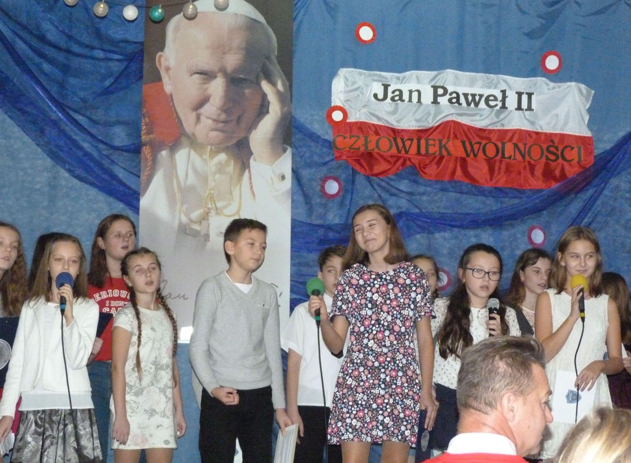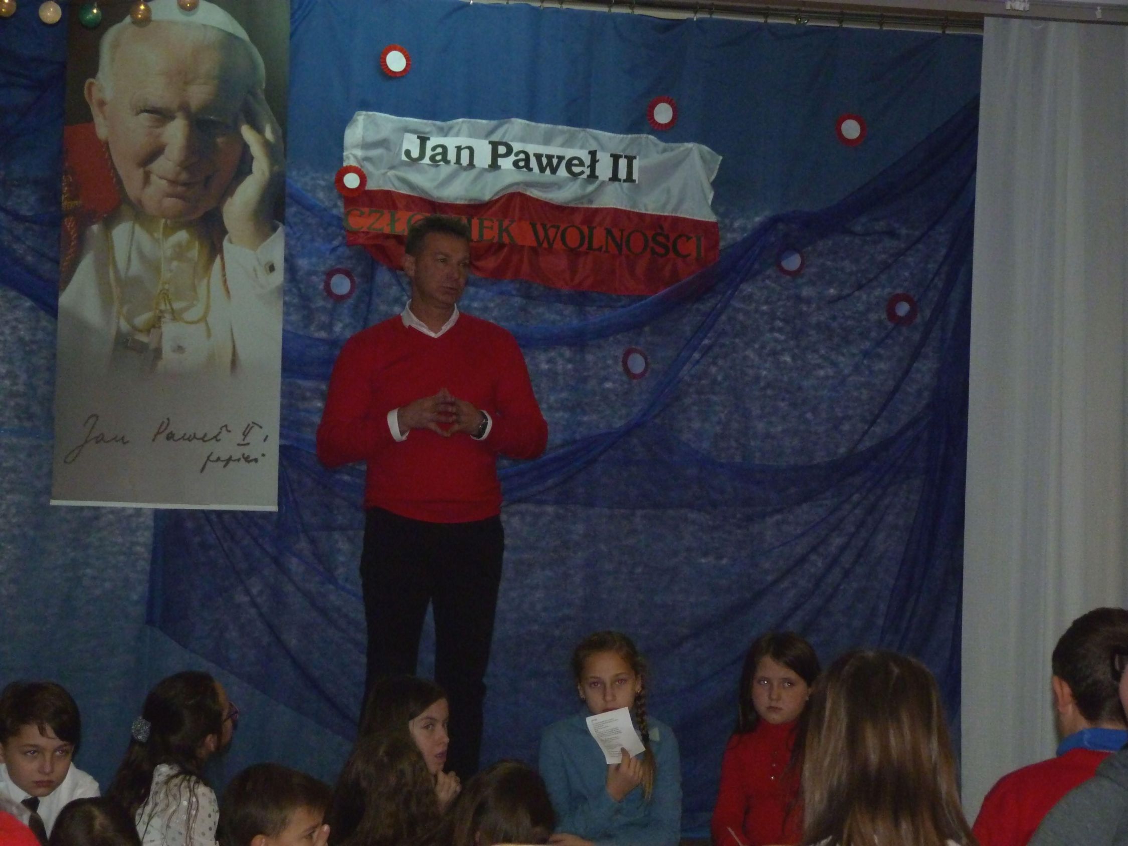 Ten niezwykły dzień uczniowie naszej szkoły świętowali ze Świętym Janem Pawłem II. Na początku słowo o papieżu – rodaku wygłosił dyrektor szkoły Pan Paweł Kalisz. Powiedział między innymi o niezwykłej osobowości i ogromnych zasługach Jana Pawła dla naszego kraju i całego świata. Następnie głos zabrała młodzież, która wspomnieniem, wierszem i piosenką uczciła tego wielkiego człowieka. Program artystyczny przygotowany przez koło teatralne (kl.5a,b) pod tytułem „Jan Paweł II CZŁOWIEK WOLNOŚCI” przypomniał ważne czyny i słowa papieża związane z walką o niepodległość, z umiłowaniem Ojczyzny i obowiązkiem z racji bycia Polakiem.