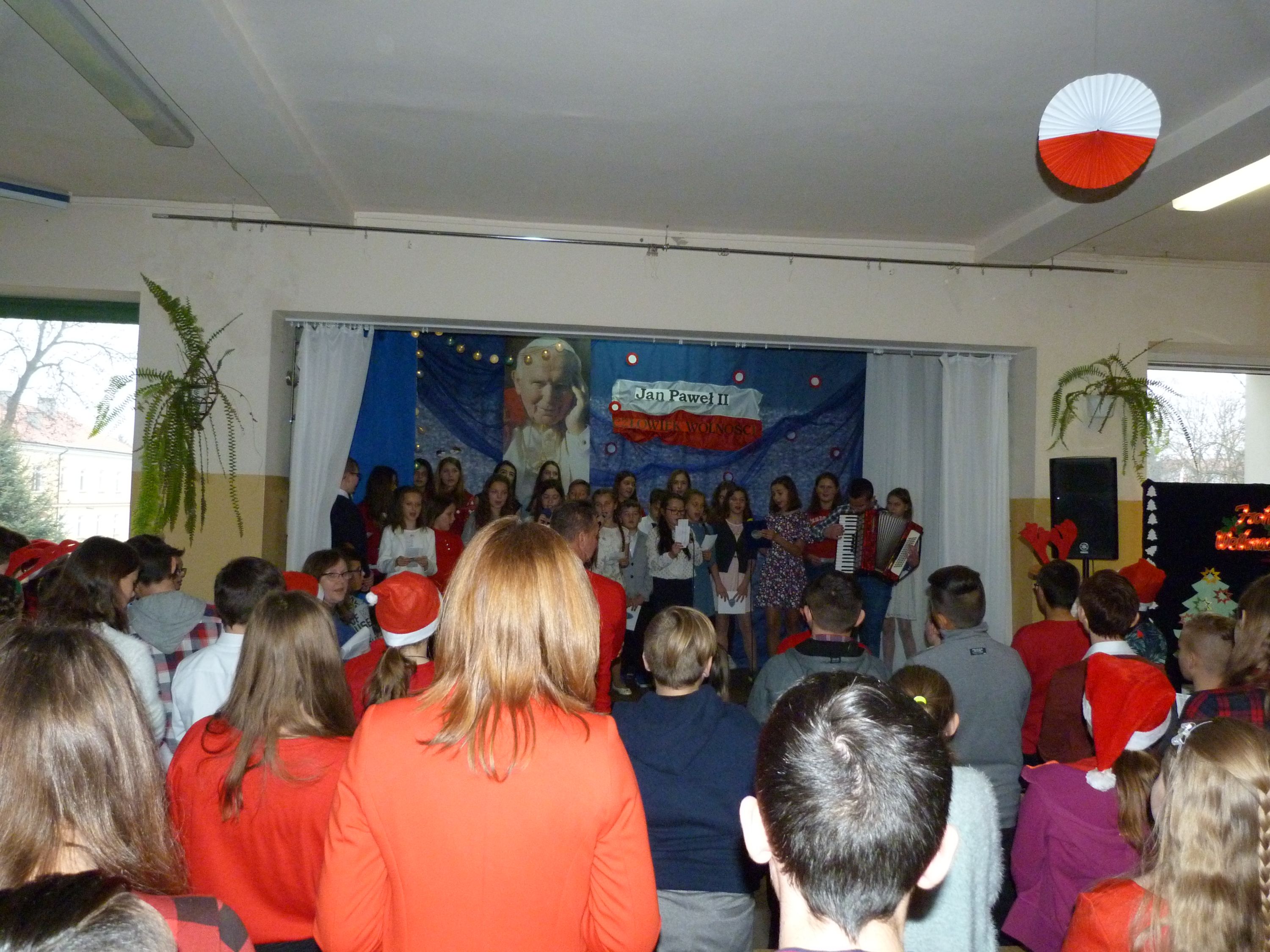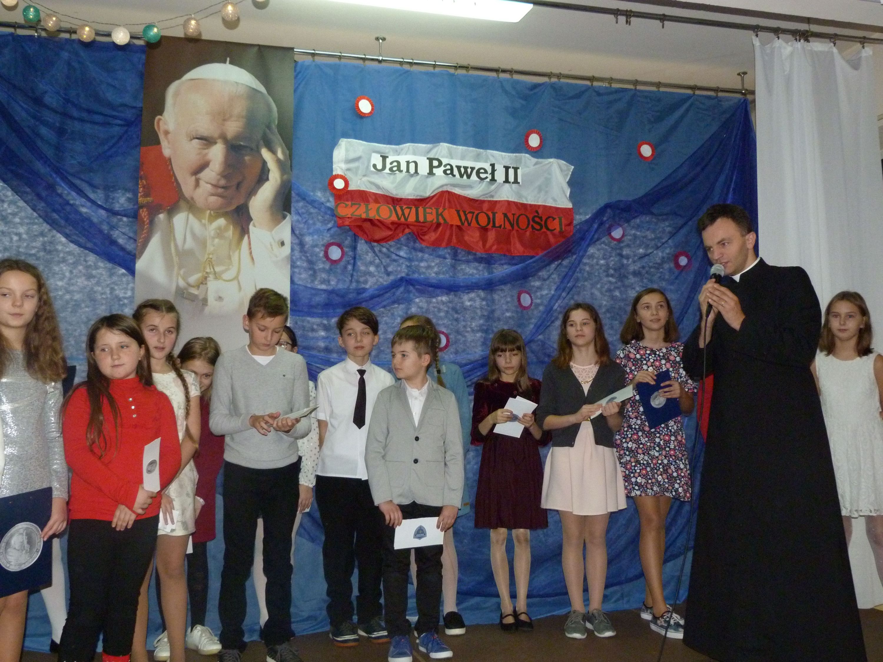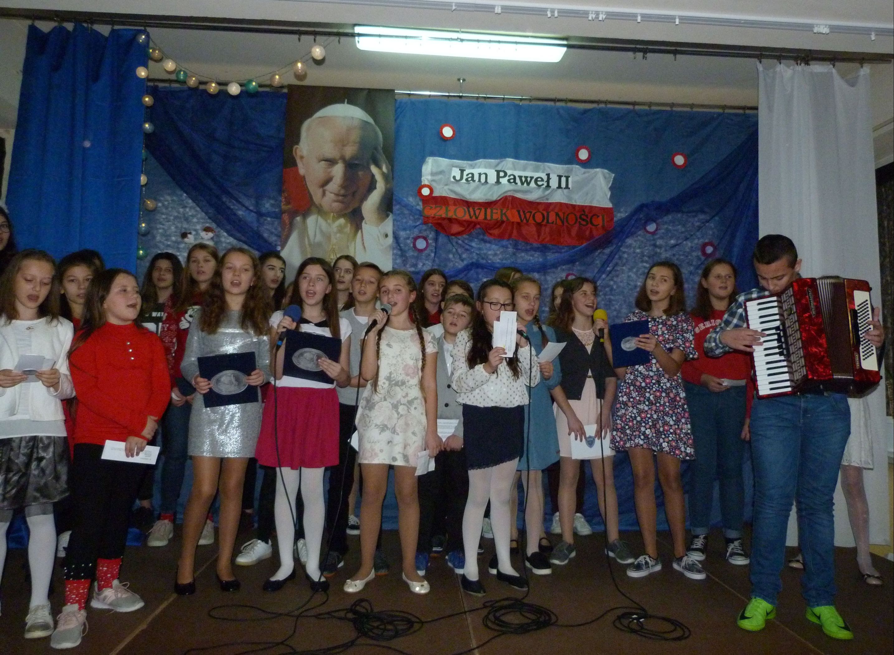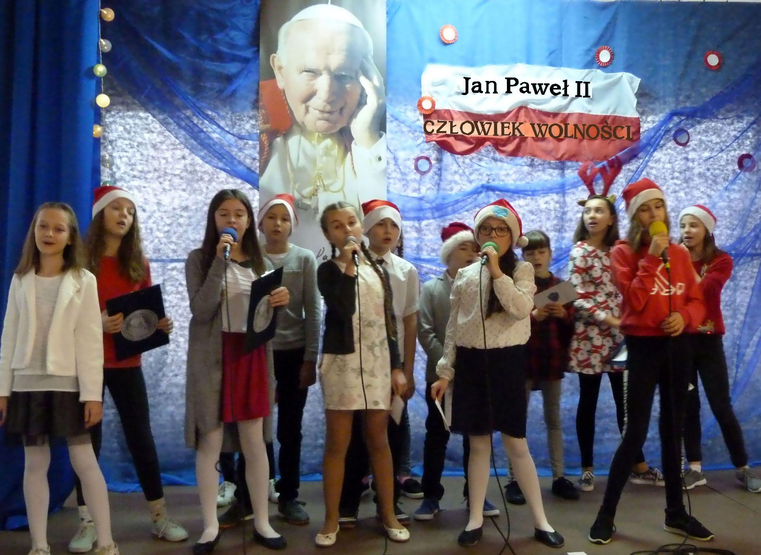 Ten niezwykły dzień uczniowie naszej szkoły świętowali ze Świętym Janem Pawłem II. Na początku słowo o papieżu – rodaku wygłosił dyrektor szkoły Pan Paweł Kalisz. Powiedział między innymi o niezwykłej osobowości i ogromnych zasługach Jana Pawła dla naszego kraju i całego świata. Następnie głos zabrała młodzież, która wspomnieniem, wierszem i piosenką uczciła tego wielkiego człowieka. Program artystyczny przygotowany przez koło teatralne (kl.5a,b) pod tytułem „Jan Paweł II CZŁOWIEK WOLNOŚCI” przypomniał ważne czyny i słowa papieża związane z walką o niepodległość, z umiłowaniem Ojczyzny i obowiązkiem z racji bycia Polakiem.
