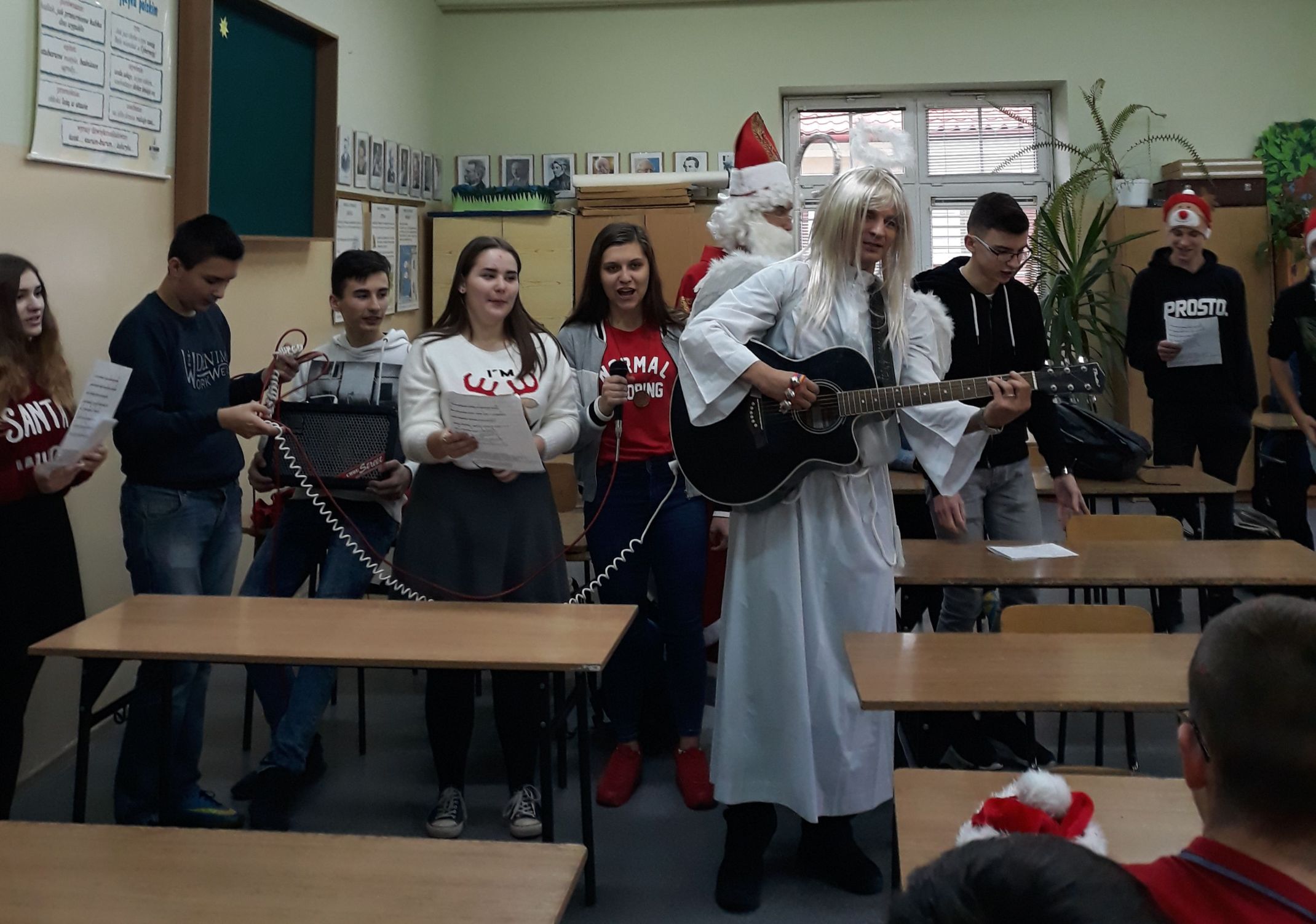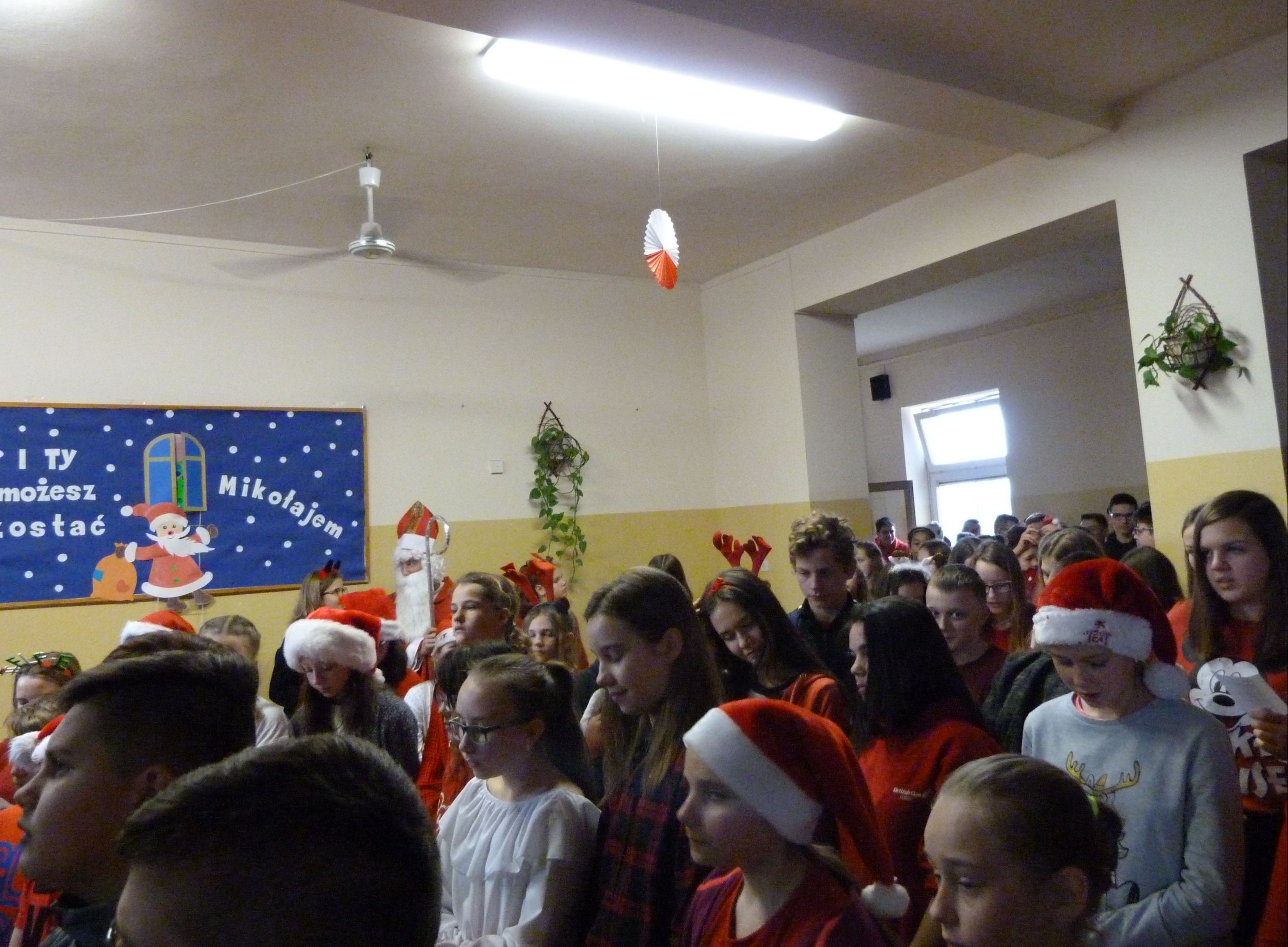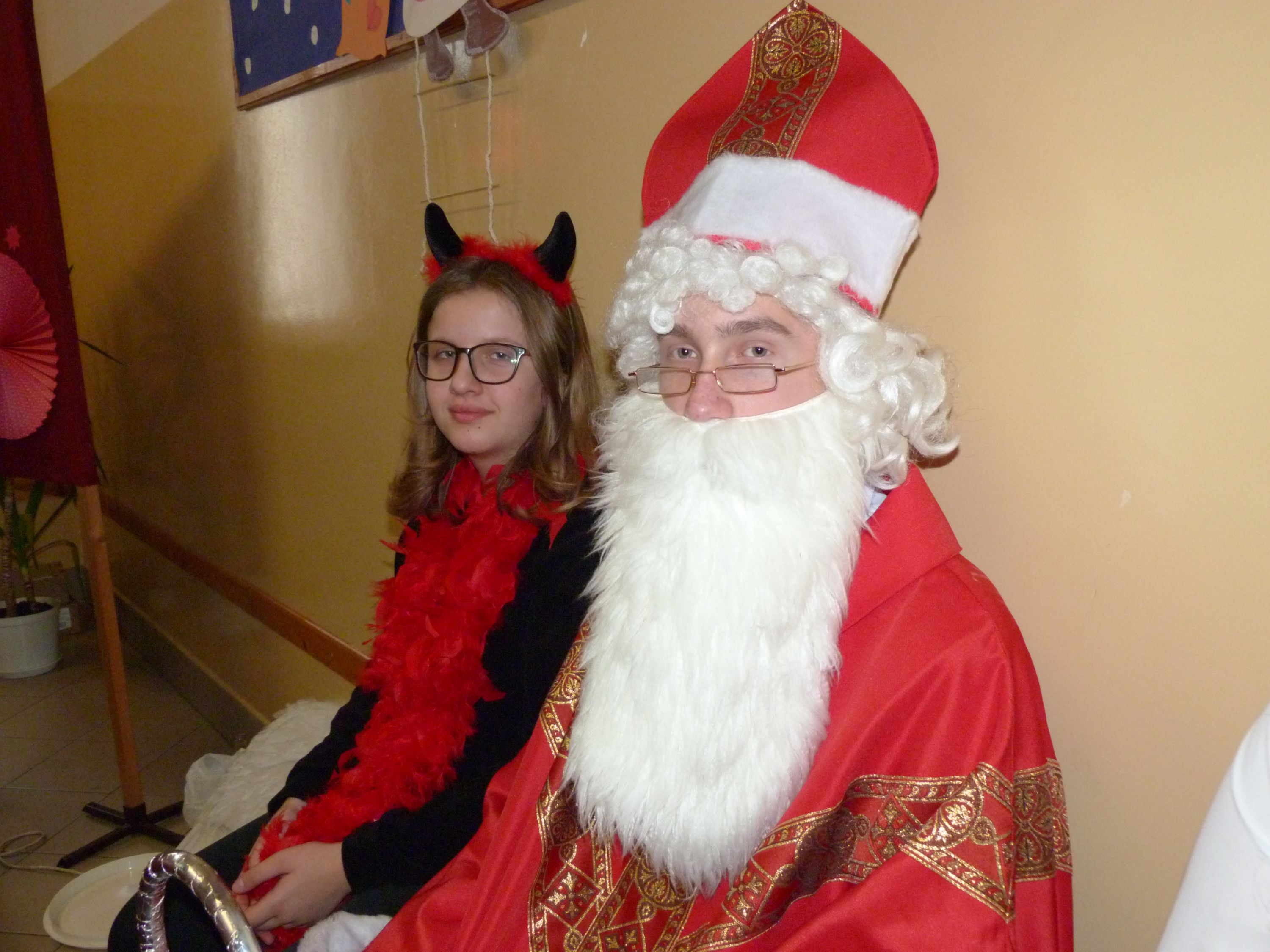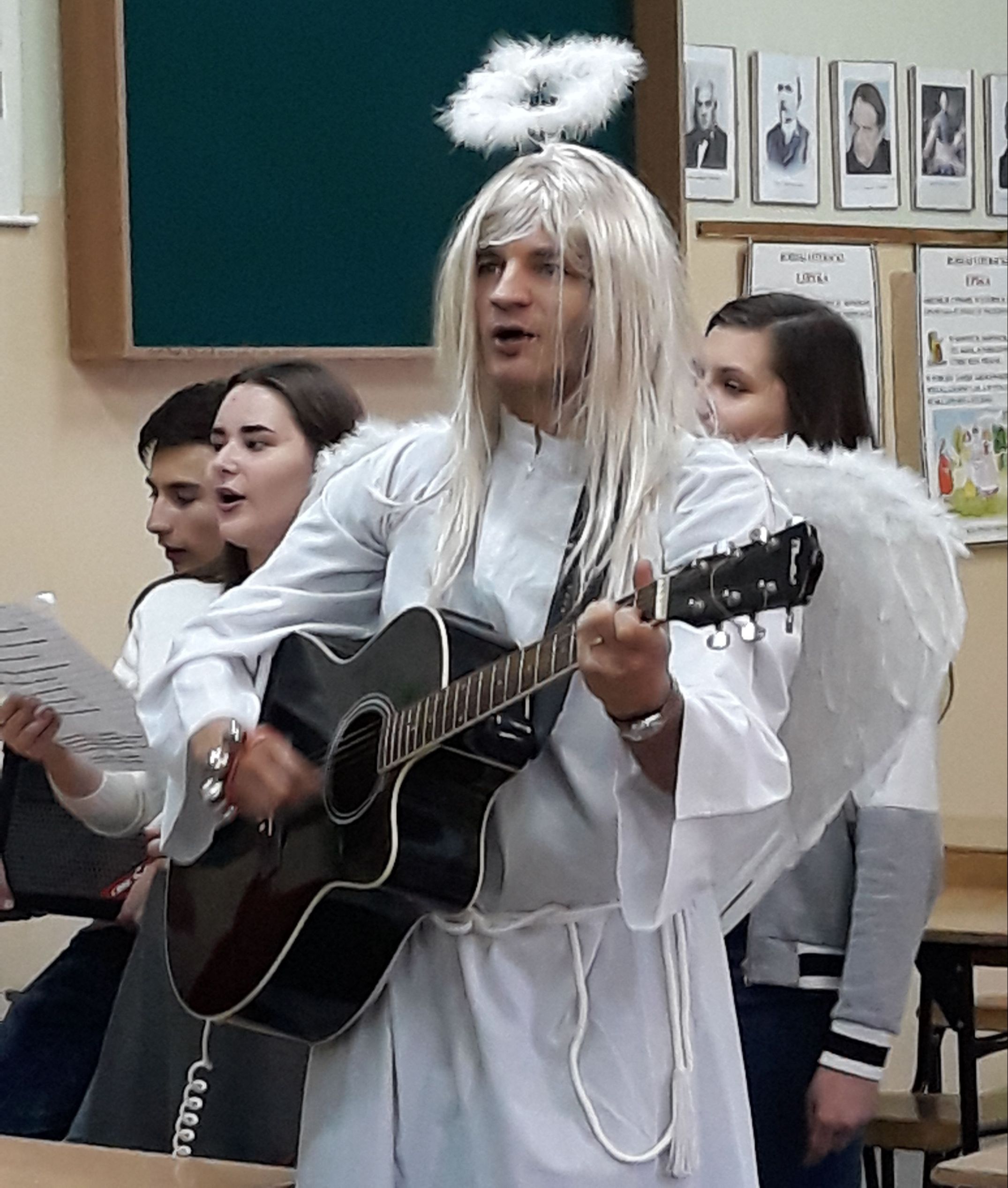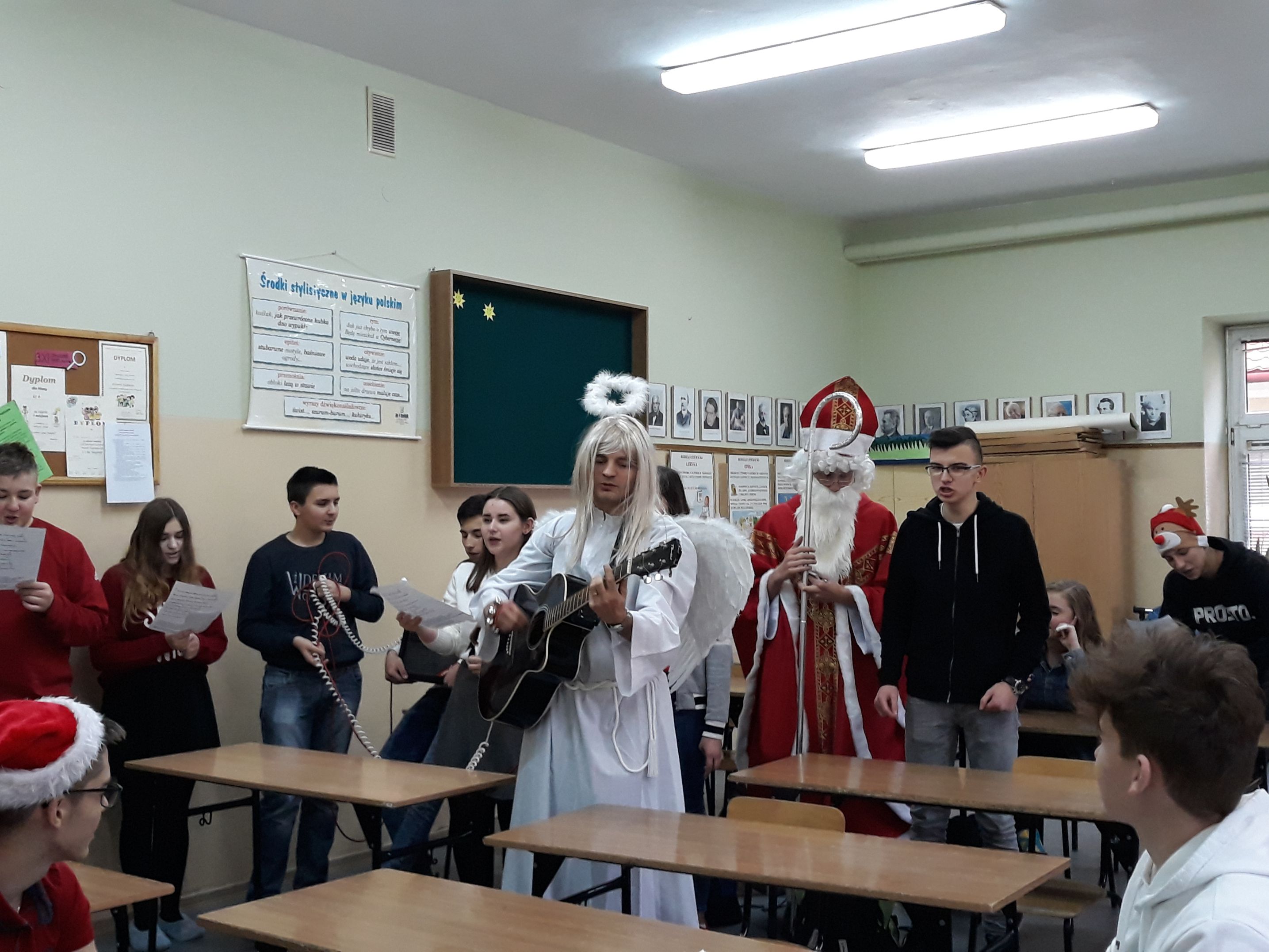 Dodatkową niespodziankę sprawił niezwykły Anioł. Z piosenką na ustach, przy dźwiękach gitary w towarzystwie Mikołaja, aniołków i diabełków oraz uczniów klas gimnazjalnych odwiedził poszczególne klasy obdarowując wszystkich radością.