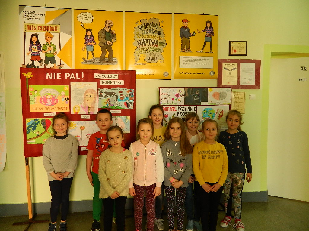 W roku szkolnym 2018/2019 realizowano w naszej szkole program profilaktyczny „Nie pal przy mnie proszę” rekomendowany przez Powiatową Stacją Sanitarno – Epidemiologiczną w Jarosławiu. Jego głównym celem było wykształcenie u dzieci umiejętności radzenia sobie w sytuacjach, w których inne osoby palą przy nich papierosy. Realizacja programu służyła również poszerzeniu wiedzy uczniów o zdrowiu, uświadamianiu im, że palenie tytoniu jest szkodliwe. Programem zostali nim objęci uczniowie z klas I, II, III. Realizatorkami programu były: p. Ala Sucha, p. Danuta Woźniak, p. Joanna Maziarz, p. Małgorzata Hamacher, p. Maria Burbeło, p. Marzena Reszka. Całość działań koordynowała pedagog szkoły p. Katarzyna Gałęza. W ramach realizacji programu odbywały się cykliczne zajęcia profilaktyczne z uczniami zwieńczone konkursem plastycznym. Jego wyniki przedstawiają się następująco: