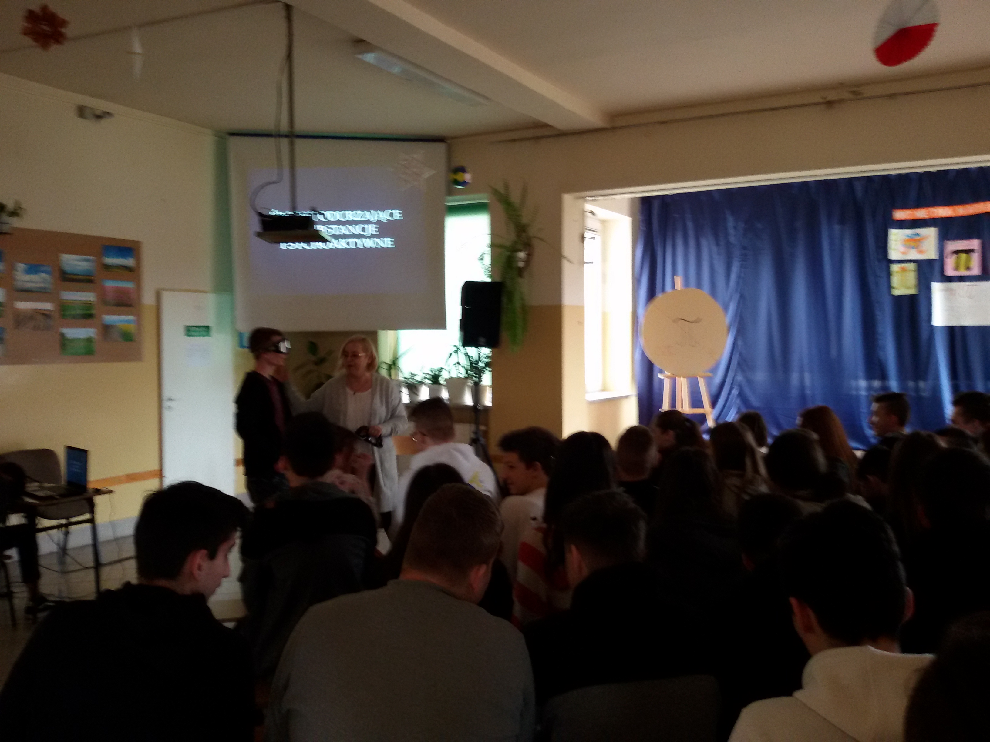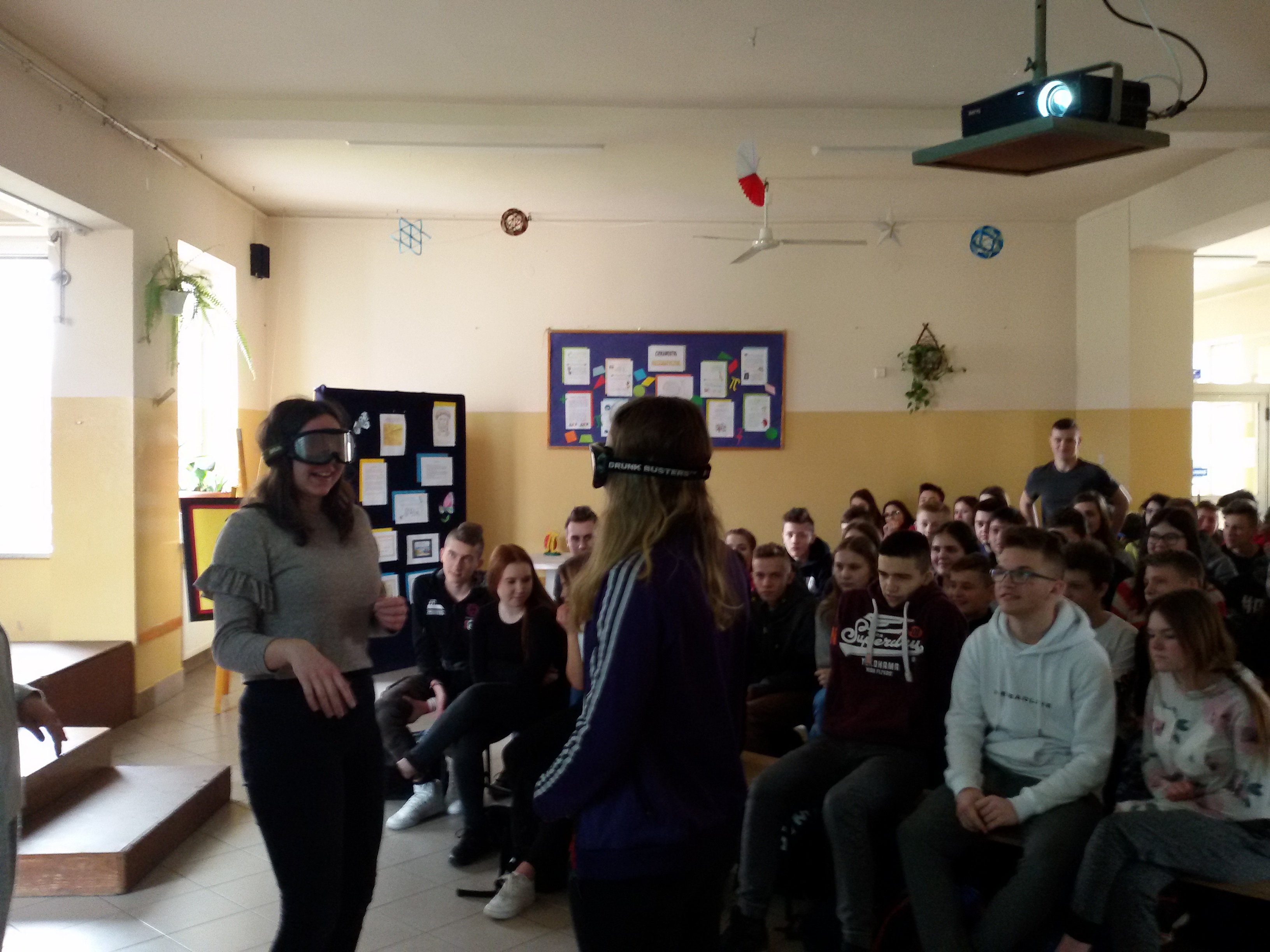 W dniu 15 marca 2019 r. miały miejsce w naszej szkole zajęcia profilaktyczne dla uczniów klas VII, VIII i III gimnazjum. Zorganizowała je pedagog szkoły przy współpracy z Powiatową Stacją Sanitarno – Epidemiologiczną. Zajęcia służyły pokazaniu uczniom konsekwencji wynikających z zażywania substancji psychoaktywnych. Prowadząca Pani Renata Majkut – Lotycz zajmującą się w PSSE promocją zdrowia omówiła problemy związane z wczesnym sięganiem po używki podkreślając trudny proces wychodzenia z uzależnienia. W celu lepszego zrozumienia i zobrazowania poruszanych tematów młodzież miała możliwość założenia narkogoogli i alkogoogli- specjalnych okularów, które sprawiają, że świat wygląda podobnie jak po wypiciu alkoholu lub po spożyciu narkotyków. Okazało się, że założenie takich okularów skutkuje podwójnym widzeniem, spowolnieniem czasu reakcji, problemem z ustaleniem odległości, myleniem kierunków, pogorszeniem koordynacji ruchowej, zniekształceniem widzianego obrazu, zniekształceniem widzenia kolorów. Ćwiczenia te uświadamiały uczniom jak trudno wykonywać zwykłe czynności po spożyciu alkoholu, dopalaczy, czy narkotyków