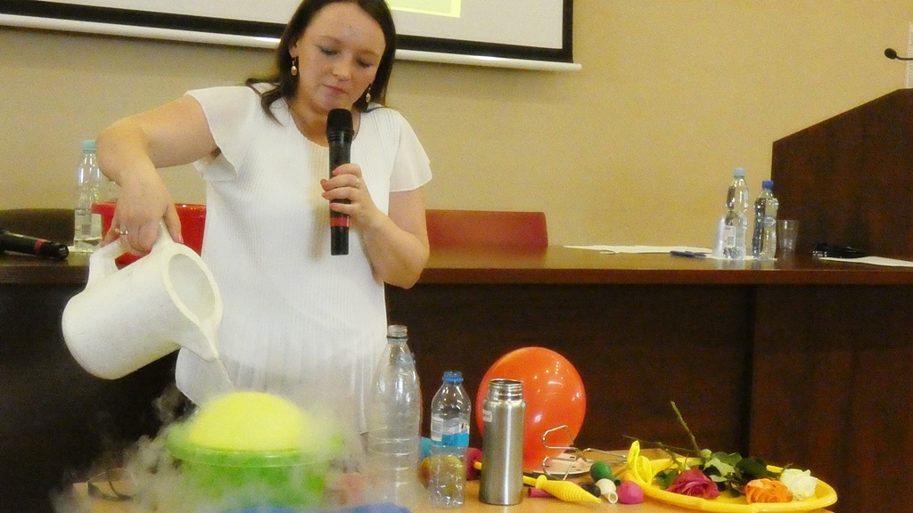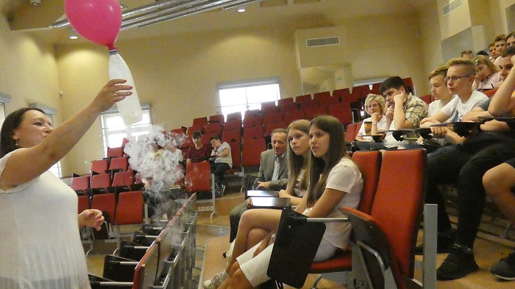 Uczniowie uczestniczyli w doświadczeniach, w których wykorzystano ciekły azot. Zapoznali się z zasadami przechowywania ciekłego azotu w pojemnikach Dewara oraz bezpiecznego posługiwania się tym gazem. Zachowanie szczególnej ostrożności jest konieczne ze względu na bardzo niską temperaturę ciekłego azotu, która wynosi: –196oC.