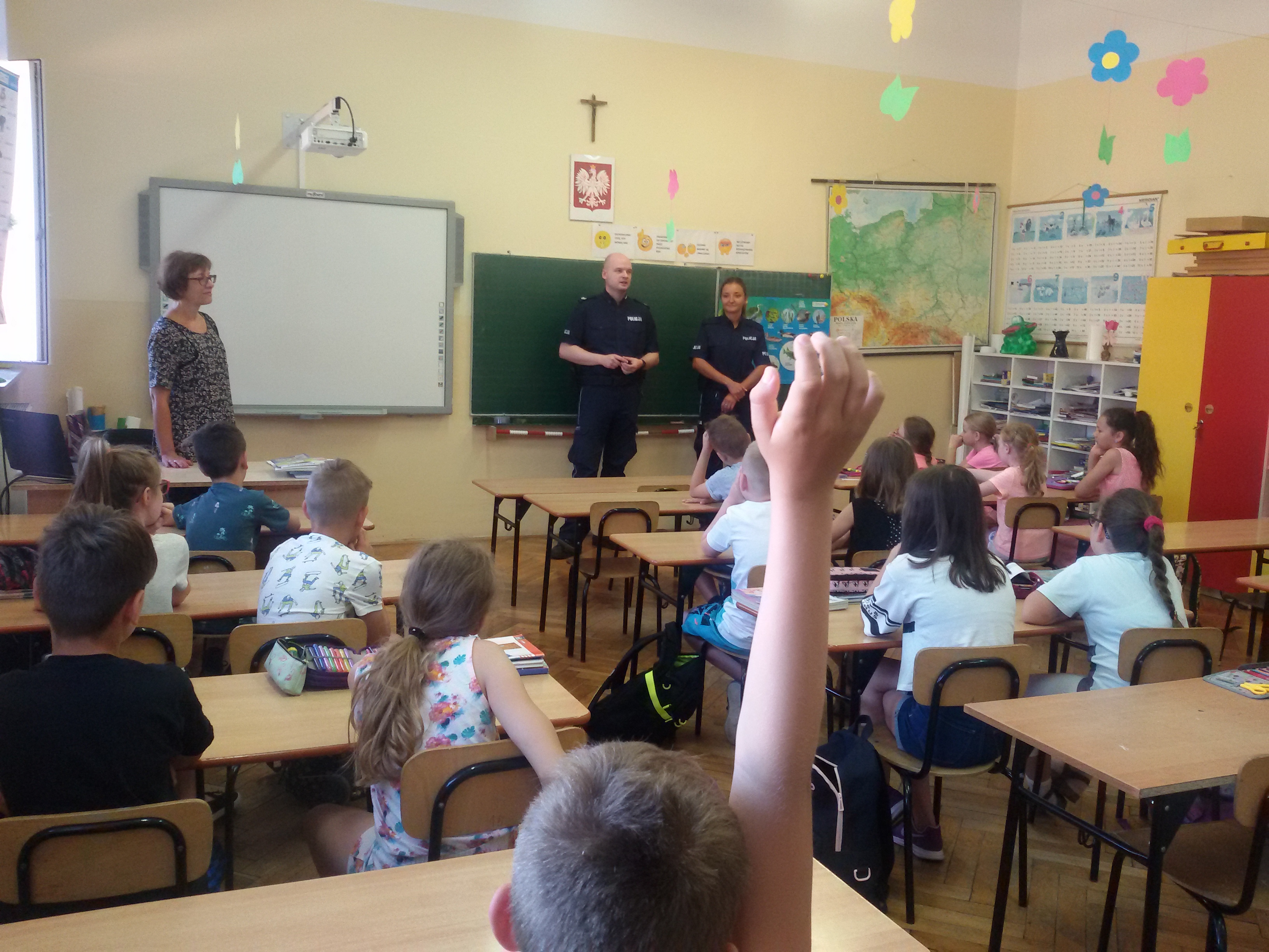 Zbliżają się wakacje, a więc czas wyjazdów i zabawy na podwórku, nad wodą czy na placu zabaw. W tym czasie należy zwrócić szczególną uwagę na bezpieczeństwo, by wypoczynek był udany i szczęśliwy. Z tej okazji 13 czerwca 2019 r. gościliśmy w naszej szkole Dzielnicowego Miasta Radymno st. sierż. Mateusza Szynala, który odwiedził wszystkie klasy I- III. Pan Policjant udzielił uczniom cennych wskazówek dotyczących bezpiecznego zachowania w różnych miejscach, w których dzieci najchętniej bawią się i odpoczywają. Dziękujemy Policji za dotychczasową współpracę a dzieci i rodziców zachęcamy do wspólnego spędzania czasu. Naszym uczniom życzymy beztroskich, pogodnych i przede wszystkim bezpiecznych wakacji !!!