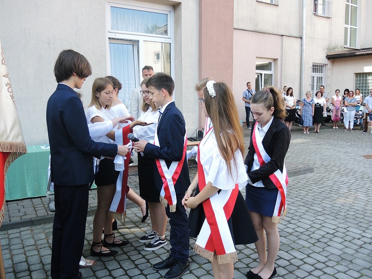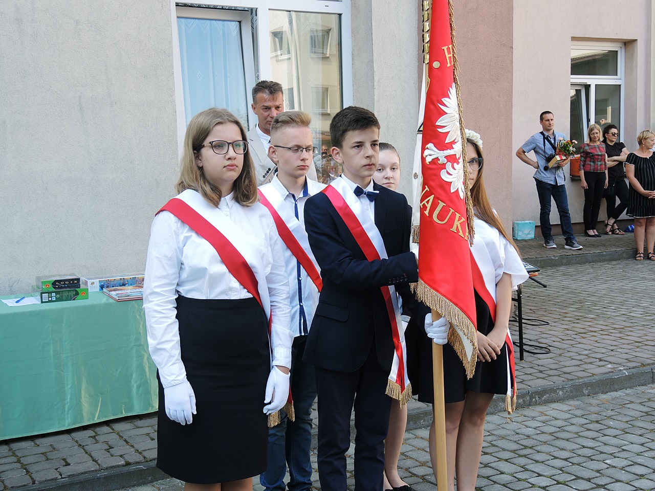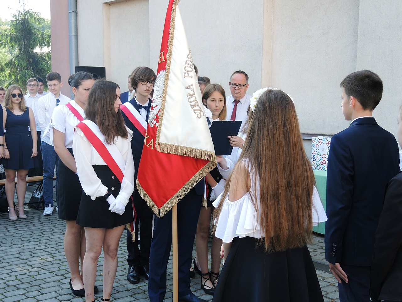 W dniu 19 czerwca br. odbyła się uroczystość zakończenia roku szkolnego 2018/2019. Na uroczystość przybyli odświętnie ubrani uczniowie klas I-VIII, III klas gimnazjalnych, nauczyciele Szkoły Podstawowej oraz Rodzice uczniów. Uroczystości zakończenia roku szkolnego rozpoczęła dziękczynna Msza Św. w kościele pw. św. Wawrzyńca. Po jej zakończeniu cała społeczność szkolna zebrała się na placu szkolnym przy ul. Mickiewicza. Po odśpiewaniu hymnu państwowego nastąpiło uroczyste wprowadzenie pocztu sztandarowego szkoły i przekazanie go przez ósmoklasistów swoim młodszym kolegom i koleżankom. Pan dyrektor po powitaniu zebranych podsumował krótko mijający rok szkolny. W dalszej części uroczystości nagrodzeni zostali uczniowie, którzy zgromadzili największe wkłady w szkolnym SKO. Nagrody osobiście wręczała pani dyrektor Oddziału Banku PKO B.P. Następnie nagrodzeni zostali uczniowie klas I-IV, którzy zdobywali czołowe miejsca w organizowanych ostatnio konkursach. Na zakończenie uroczystości z uczniami pożegnała się długoletnia dyrektor szkoły – p. Maria Jędrejko, która z końcem wakacji przechodzi na emeryturę. Uczniowie klas I-IV rozeszli się do swoich klas, gdzie z rąk wychowawców otrzymali świadectwa promocyjne do następnej klasy, natomiast uczniowie klas V-VIII oraz gimnazjaliści przeszli do budynku szkoły przy ul. Lwowskiej, gdzie miała miejsce dalsza część uroczystości. Tutaj w sposób specjalny, dyplomem „Primus inter pares”, wyróżnieni zostali: wśród gimnazjalistów Justyna Gołdy (kl. 3b), zaś wśród uczniów szkoły podstawowej – Aleksandra Kosztyła (kl. 6b) za najwyższe wyniki w nauce. Następnie osobiście p. dyrektor wręczał wszystkim uczniom nagrody książkowe i świadectwa promocyjne z wyróżnieniem. Nagrodzeni zostali ponownie laureaci i finaliści wojewódzkich konkursów przedmiotowych oraz uczniowie, którzy zdobywali czołowe miejsca w organizowanych ostatnio różnych konkursach. Na zakończenie uroczystości p. dyrektor złożył uczniom życzenia udanego i bezpiecznego wypoczynku wakacyjnego, po czy uczniowie rozeszli się do swoich klas, gdzie z rąk wychowawców otrzymali świadectwa promocyjne do następnej klasy.