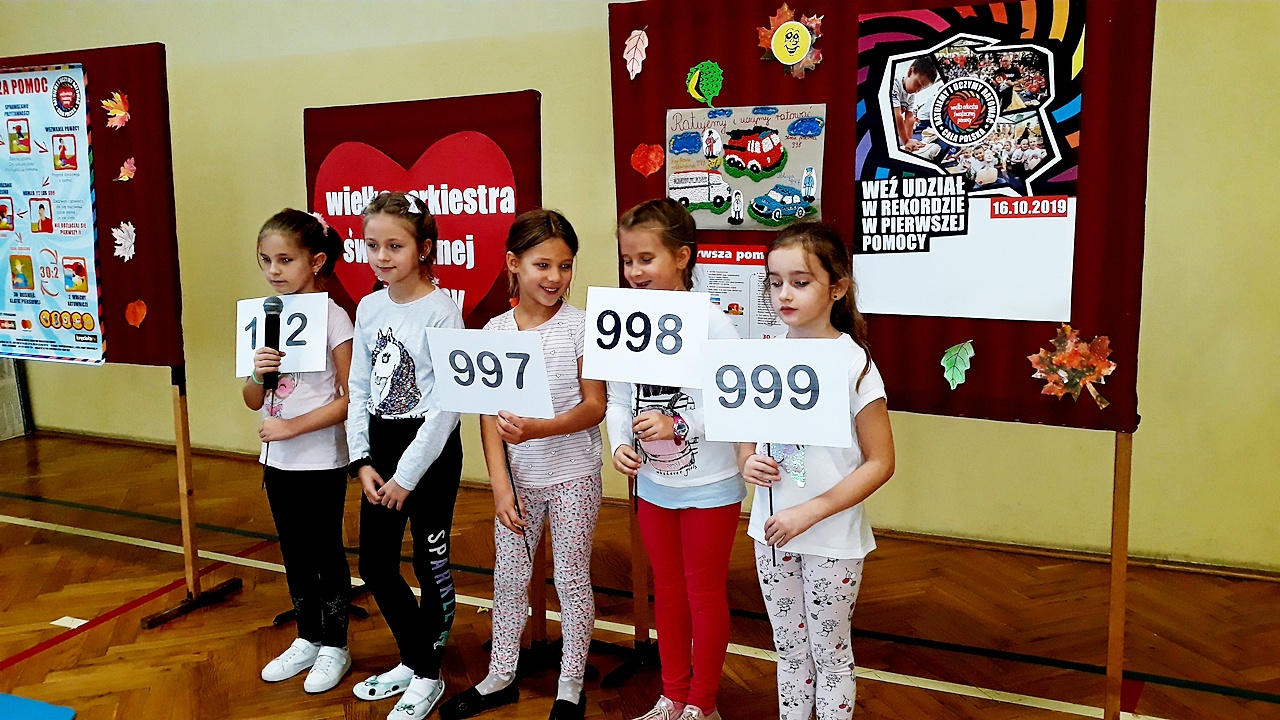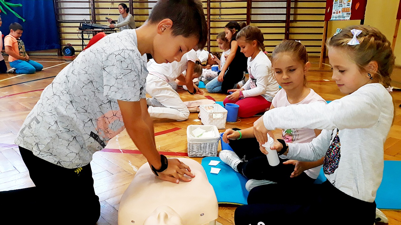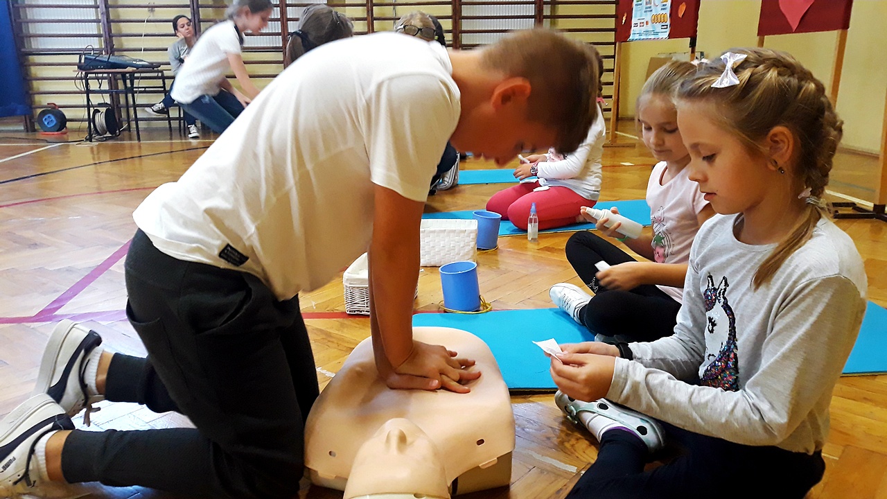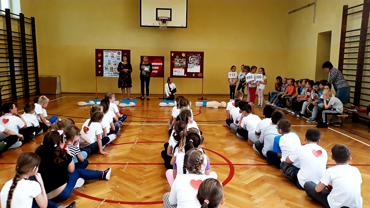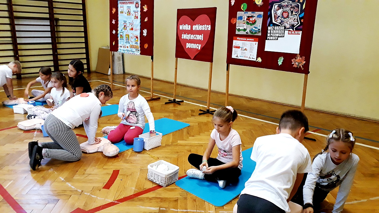 Punktualnie o godzinie 12 w szkole, na sali gimnastycznej spora grupa naszych uczniów z klas młodszych, rozpoczęła czynności ratownicze na fantomach. Akcja była prowadzona nieprzerwanie przez 30 minut i miała na celu popularyzację pierwszej pomocy przedmedycznej wśród najmłodszych. Dzięki takim działaniom, pierwsza pomoc staje się dla nich czymś naturalnym. Dzieci uczą się reagować, kształtują w sobie pozytywne postawy i nawyki.