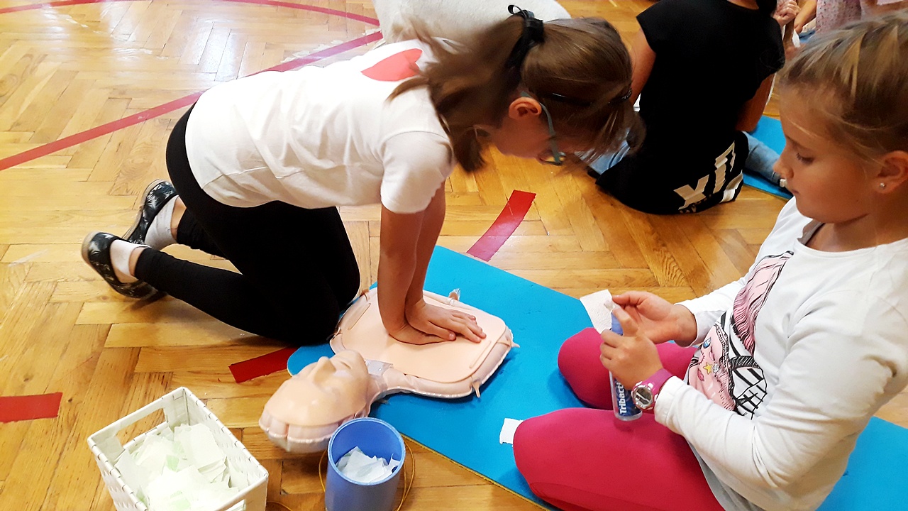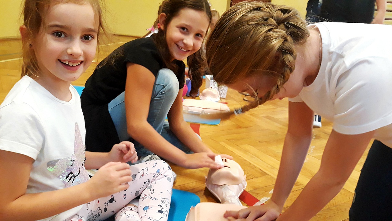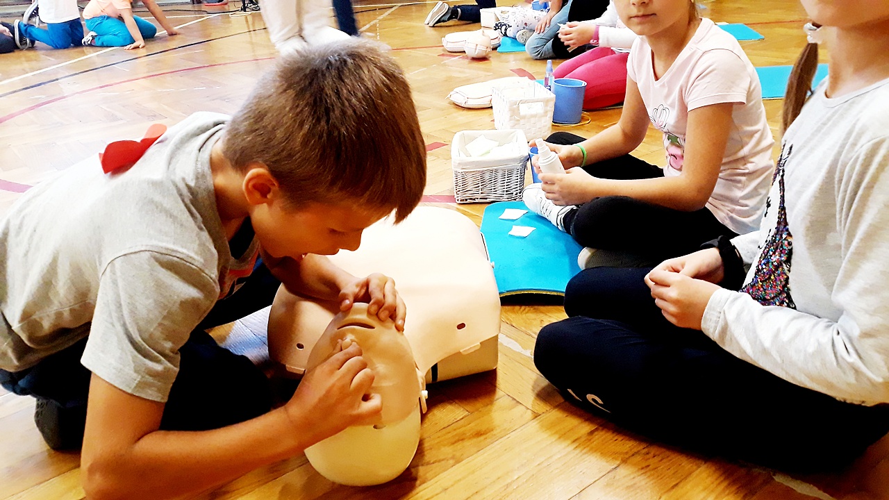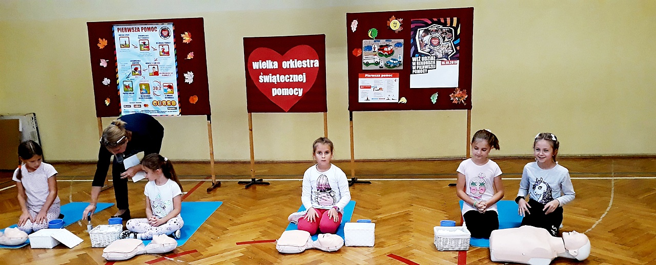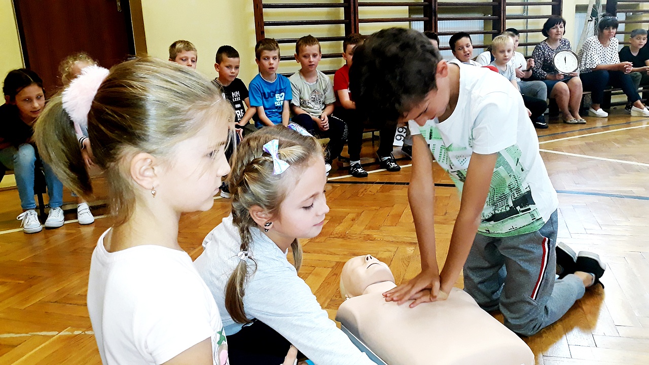 Punktualnie o godzinie 12 w szkole, na sali gimnastycznej spora grupa naszych uczniów z klas młodszych, rozpoczęła czynności ratownicze na fantomach. Akcja była prowadzona nieprzerwanie przez 30 minut i miała na celu popularyzację pierwszej pomocy przedmedycznej wśród najmłodszych. Dzięki takim działaniom, pierwsza pomoc staje się dla nich czymś naturalnym. Dzieci uczą się reagować, kształtują w sobie pozytywne postawy i nawyki.