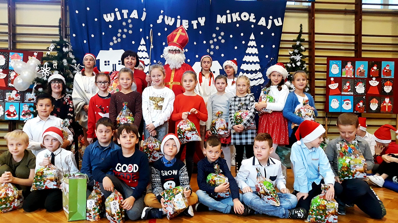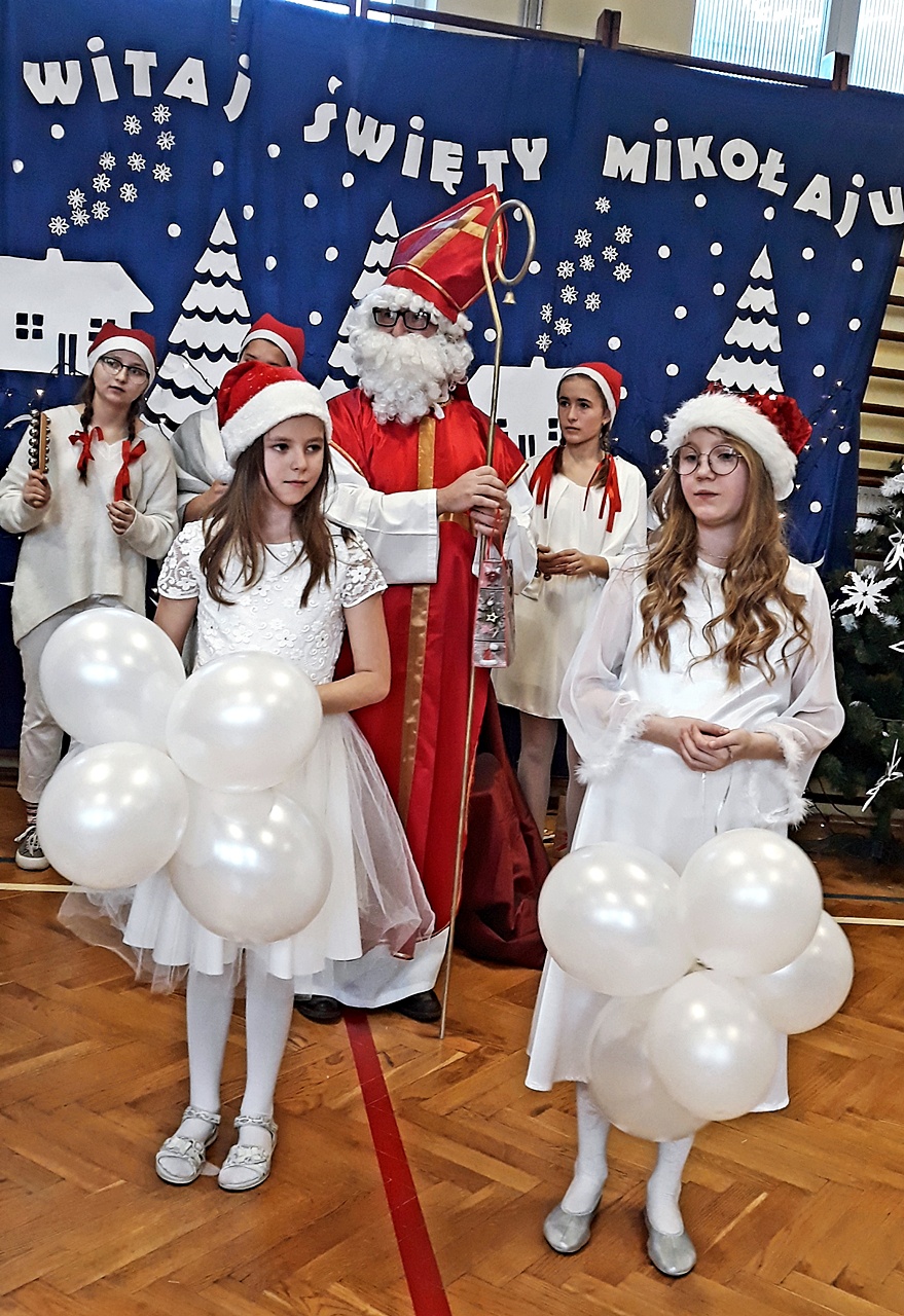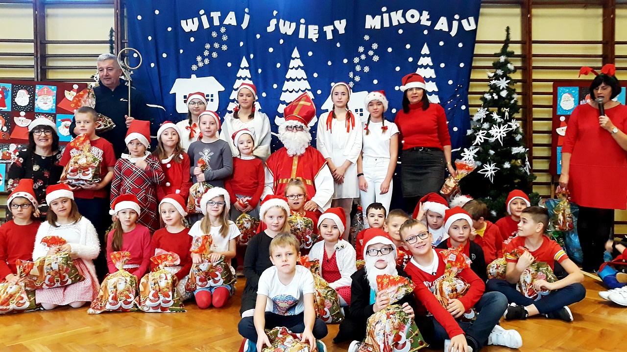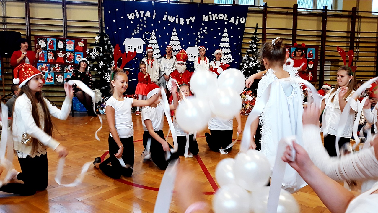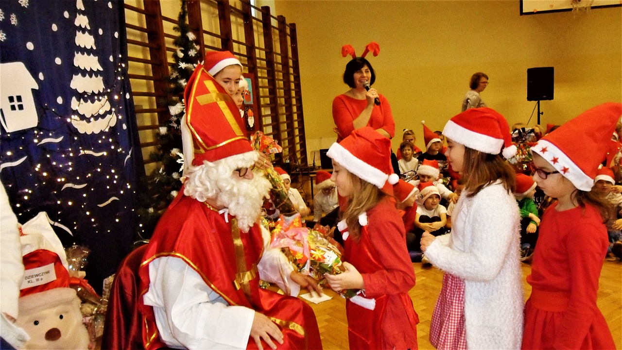 Kiedy wszyscy zgromadzili się na sali gimnastycznej, w końcu zadzwoniły dzwoneczki i pojawił się długo oczekiwany Święty Mikołaj w towarzystwie aniołów. Uczniowie na powitanie Mikołaja zaprezentowali wierszyki i piosenki, a dziewczynki z klasy III a i III b wykonały wzruszający taniec z szarfami do piosenki ,,Hallelujah”. Dzieci zgodnie obiecały, że będą grzeczne i postarają się nie sprawiać kłopotu swoim rodzicom, ani nauczycielom. Po takich deklaracjach Święty Mikołaj przystąpił do swojego zadania – obdarzył dzieci miłymi upominkami, przyjmowanymi z wypiekami na twarzach i z nieskrywaną radością. Szanowny Gość wykazał bardzo dużo cierpliwości, kiedy z każdą klasą pozował do pamiątkowego zdjęcia. Na zakończenie wizyty Mikołaj okazał się prawdziwym wielbicielem piłki nożnej, bo strzelił kilka goli co niektórym zażartym kibicom piłki nożnej z naszej szkoły. Wszystko, co dobre szybko się kończy, więc i Święty Mikołaj musiał się pożegnać, bo przecież czekali na niego jeszcze w wielu miejscach. A więc do następnego roku Drogi Mikołaju!!!
