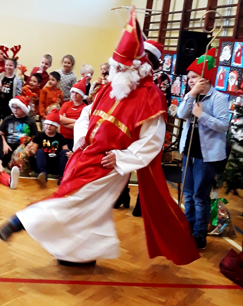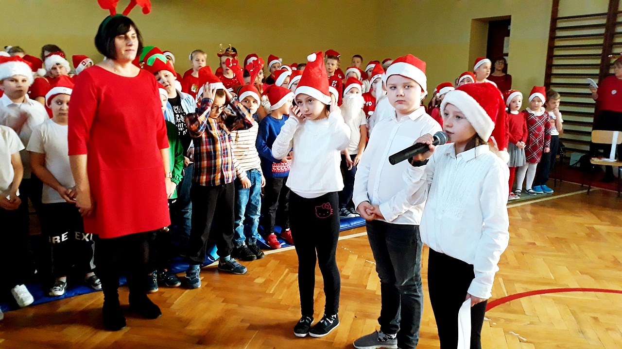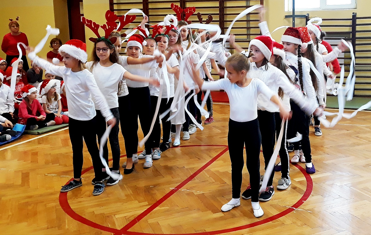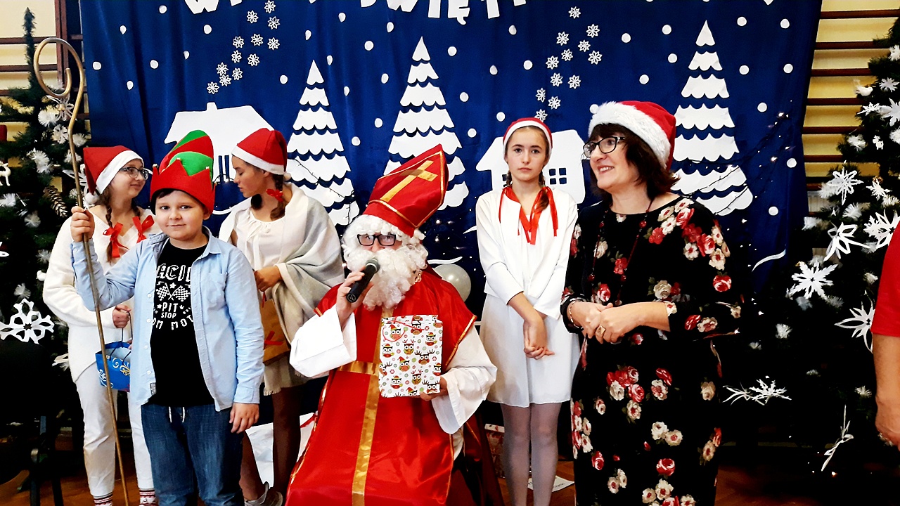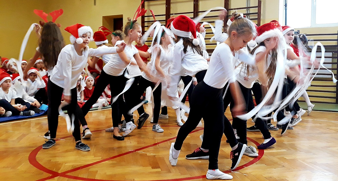 Kiedy wszyscy zgromadzili się na sali gimnastycznej, w końcu zadzwoniły dzwoneczki i pojawił się długo oczekiwany Święty Mikołaj w towarzystwie aniołów. Uczniowie na powitanie Mikołaja zaprezentowali wierszyki i piosenki, a dziewczynki z klasy III a i III b wykonały wzruszający taniec z szarfami do piosenki ,,Hallelujah”. Dzieci zgodnie obiecały, że będą grzeczne i postarają się nie sprawiać kłopotu swoim rodzicom, ani nauczycielom. Po takich deklaracjach Święty Mikołaj przystąpił do swojego zadania – obdarzył dzieci miłymi upominkami, przyjmowanymi z wypiekami na twarzach i z nieskrywaną radością. Szanowny Gość wykazał bardzo dużo cierpliwości, kiedy z każdą klasą pozował do pamiątkowego zdjęcia. Na zakończenie wizyty Mikołaj okazał się prawdziwym wielbicielem piłki nożnej, bo strzelił kilka goli co niektórym zażartym kibicom piłki nożnej z naszej szkoły. Wszystko, co dobre szybko się kończy, więc i Święty Mikołaj musiał się pożegnać, bo przecież czekali na niego jeszcze w wielu miejscach. A więc do następnego roku Drogi Mikołaju!!!