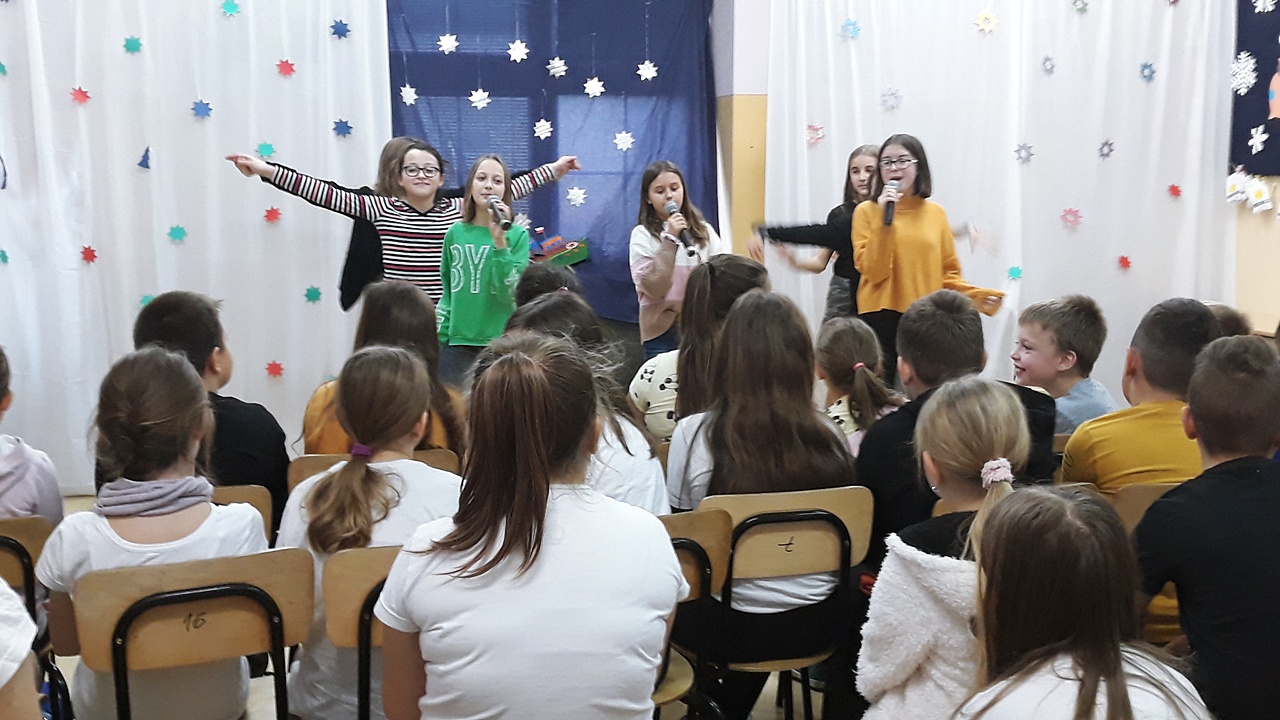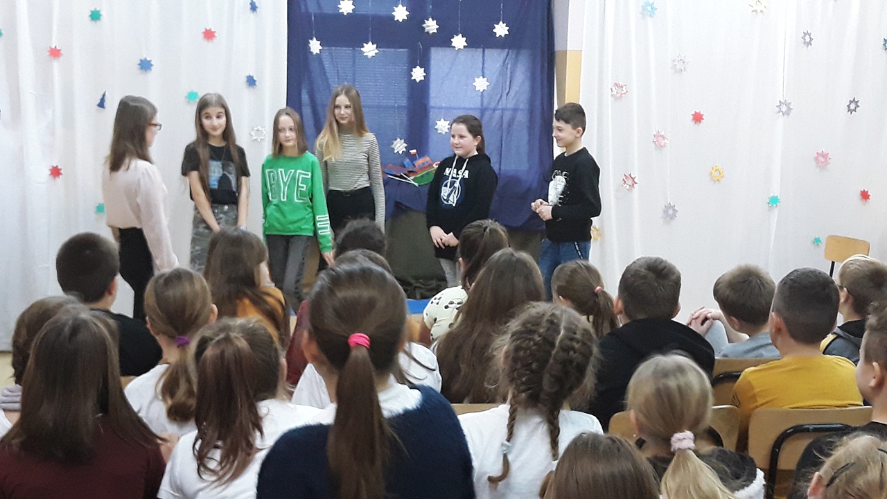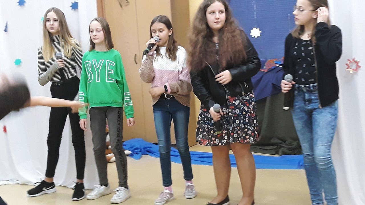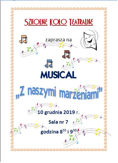 10 grudnia w naszej szkole sala nr 7 zamieniła się w teatr. Szkolne Koło Teatralne zaprezentowało koleżankom i kolegom musical pt. „Z NASZYMI MARZENIAMI” zrealizowany na podstawie własnego scenariusza. Kolorowa scenografia, rekwizyty i muzyka zachęcały do przeniesienia się w różne miejsca z naszej wyobraźni. Dodatkowym atutem inscenizacji było zwrócenie uwagi na problemy młodych ludzi związane z niską samooceną. Piosenki, układy taneczne, sceny ze szkolnego życia wzięte, humor sytuacyjny oraz pokaz akrobatyczny sprawiły, że publiczność obejrzała przedstawienie z zainteresowaniem