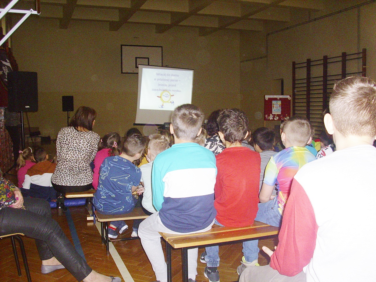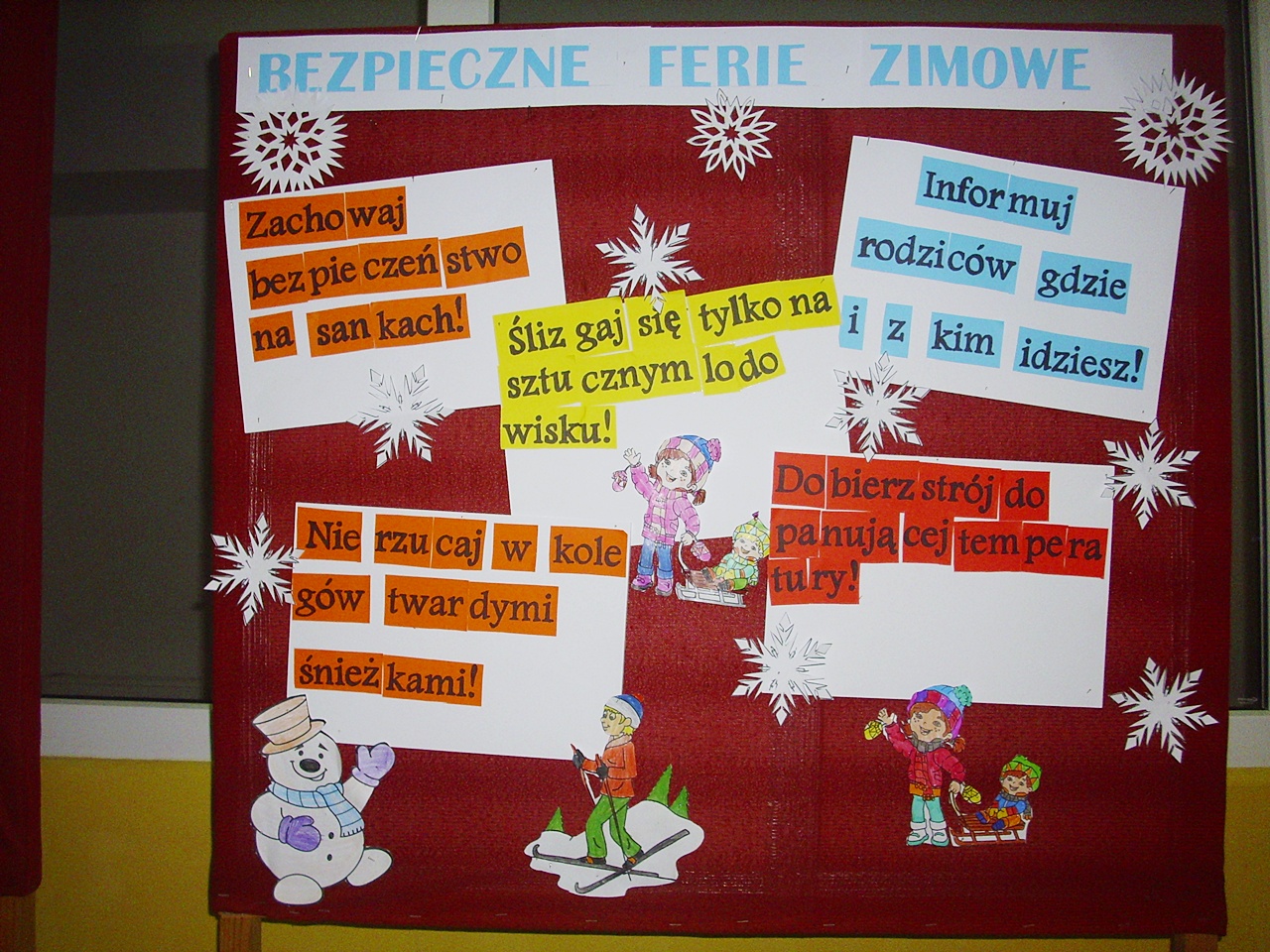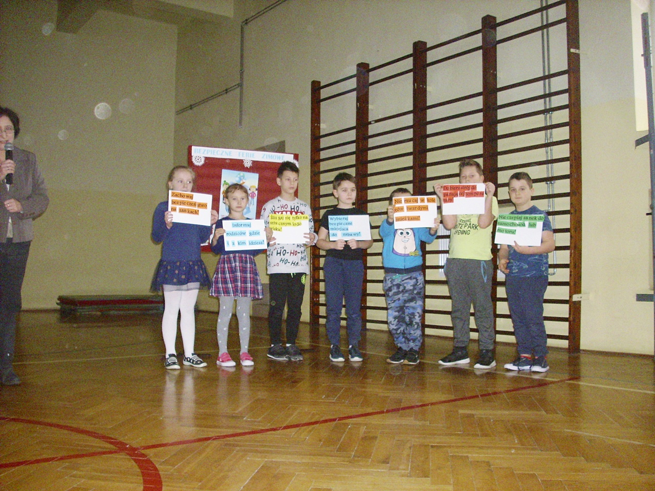 Dnia 10 stycznia 2020 r. dla uczniów klas I-III odbył się apel, którego tematem przewodnim było bezpieczeństwo dzieci podczas tegorocznych ferii zimowych. Apel przygotowała p. Krystyna Bąba. Na wstępnie uczniów powitała pedagog szkoły p. Katarzyna Gałęza, przypomniała o zbliżających się feriach i omówiła kilka ważnych zasad bezpieczeństwa podczas zabaw. Następnie uczniowie obejrzeli pokaz multimedialny pt. „Bezpieczne zabawy zimowe 2020”, którego celem było zapoznanie i utrwalenie bezpiecznych zachowań podczas zabaw na śniegu i lodzie, przy poruszaniu się chodnikiem i korzystaniu z dróg publicznych, oraz odpowiednim ubiorze i numerach alarmowych. Sprawdzeniu zapamiętania zasad bezpieczeństwa posłużył turniej międzyklasowy – w którym każda klasa miała za zadanie ułożyć zdanie z rozsypanych sylab. Wszyscy uczniowie świetnie sobie z tym zadaniem poradzili. Apel uatrakcyjniła piosenka w formie karaoke pt. „Zima lubi dzieci”, zaśpiewana przez wszystkich uczniów. W tym dniu o zasadach bezpieczeństwa zimą również przypominały uczniom gazetki na korytarzu szkolnym.