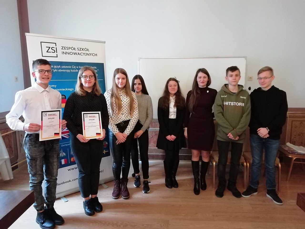 28 lutego 2020 roku uczniowie klas ósmych wzięli udział w konkursie języka niemieckiego „Deutsch ohne Geheimnisse”, który został zorganizowany przez Zespół Szkół Innowacyjnych w Jarosławiu. Naszą szkołę reprezentowali Oliwia Broszko, Amelia Dłuhań, Katarzyna Matuszek i Karol Kontek z klasy VIIIA oraz Aleksandra Sobolewska, Filip Bącal i Szymon Biały z klasy VIIIB. Zadaniem uczniów było zaprezentowanie swojej wiedzy poprzez rozwiązanie testu leksykalno-gramatycznego. Nasi uczniowie zaprezentowali się bardzo dobrze i zajęli czołowe miejsca- I miejsce Szymon Biały i III miejsce Filip Bącal. Gratulujemy zwycięzcom.