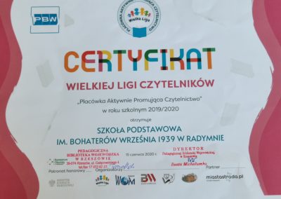 Z wielką przyjemnością ogłaszamy, iż nasza szkoła otrzymała w roku szkolnym 2019/2020 Certyfikat Wielkiej Ligi Czytelników jako Placówka Aktywnie Wspierająca Czytelnictwo.